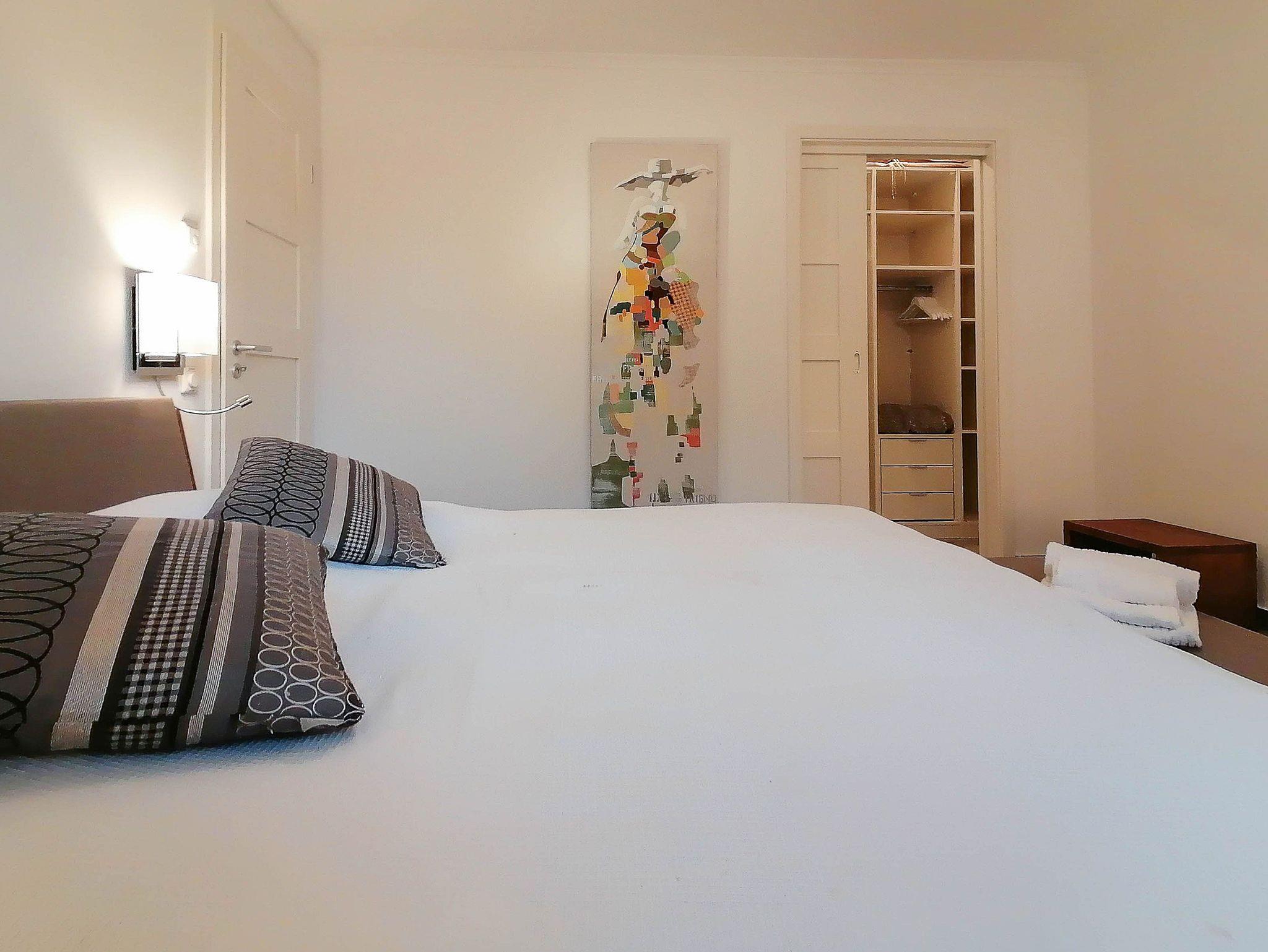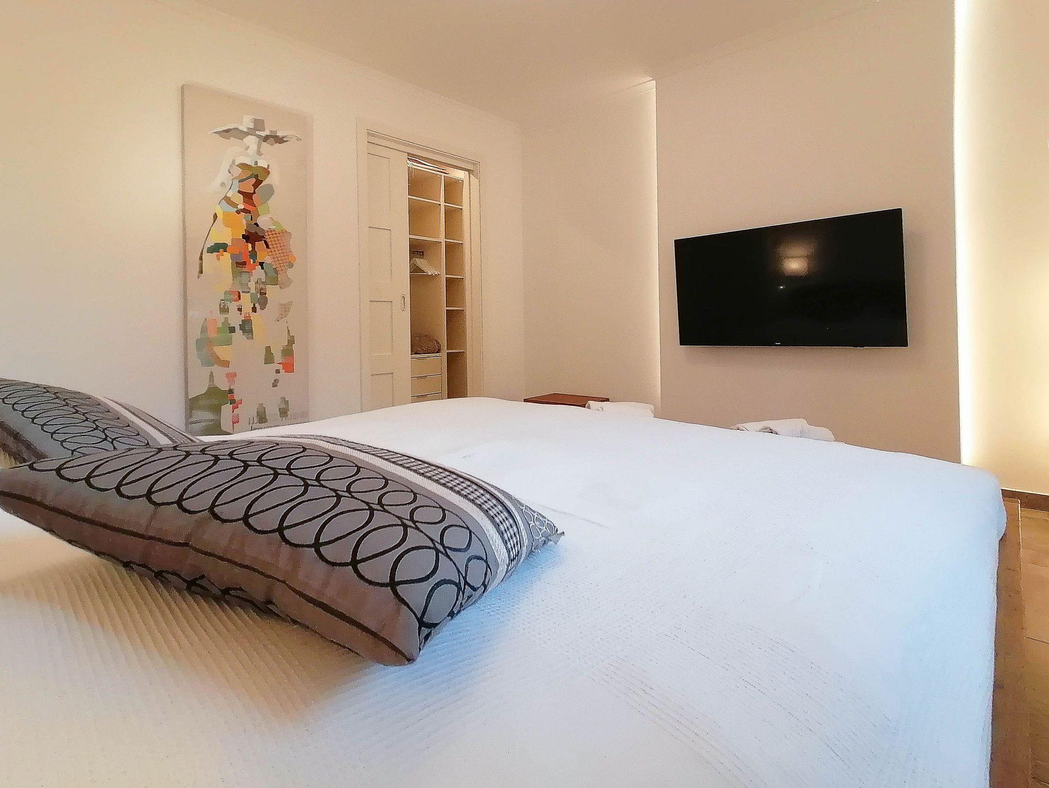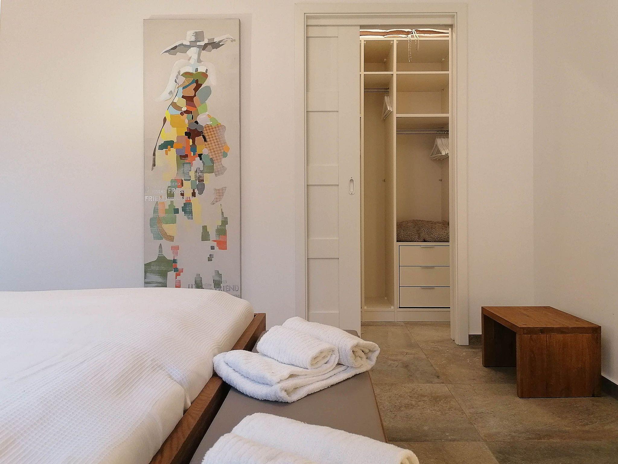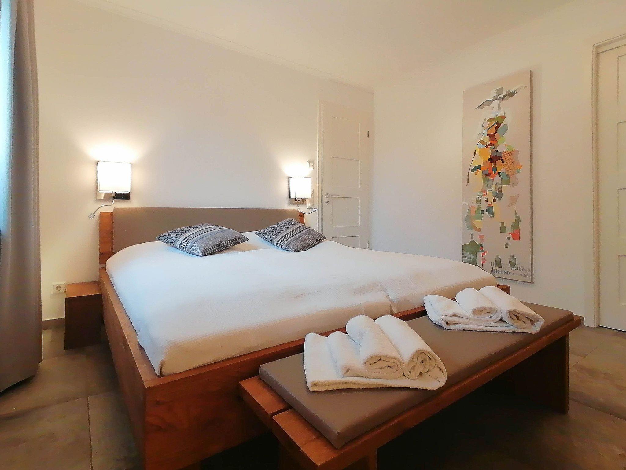 Das Schlafzimmer bietet Ihnen ein komfortables Doppelbett (2.00 x 1.80 m) mit Boxspring-Matratzen, einen begehbaren Kleiderschrank für Ihre Urlaubsgarderobe sowie einen weiteren Flachbild-Fernseher (43cm) mit Internet, Smart-View, USB, HDMI, etc.. Das Schlafzimmer ist ebenfalls mit Insektenschutzfenstern und Plissees ausgestattet.
