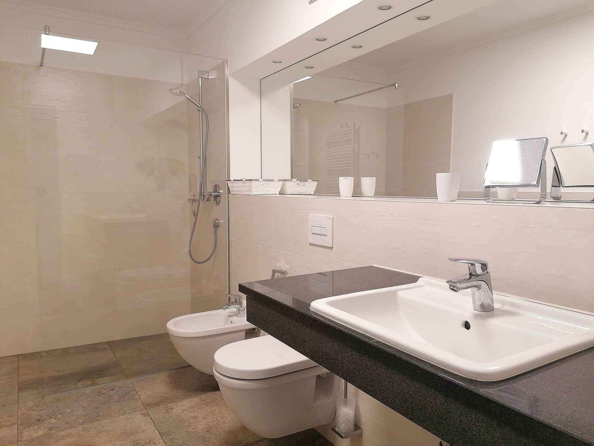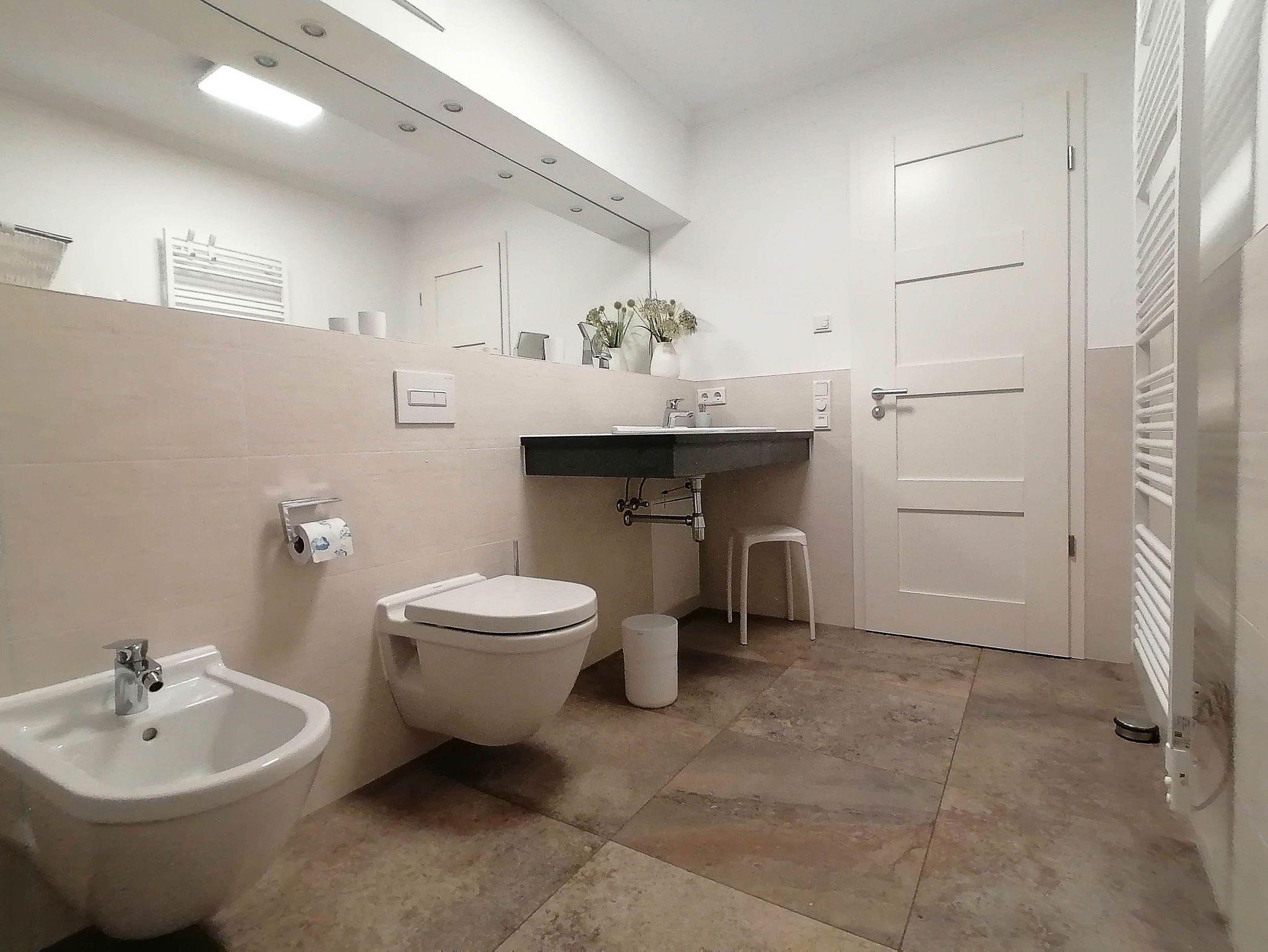 Das geflieste Bad besticht durch ihre ebenerdige Dusche, ein unterfahrbares Waschbecken sowie ein Bidet, Kosmetikspiegel und Fön. Ihre Handtücher können Sie auf dem Handtuchheizkörper trocknen und vorwärmen.