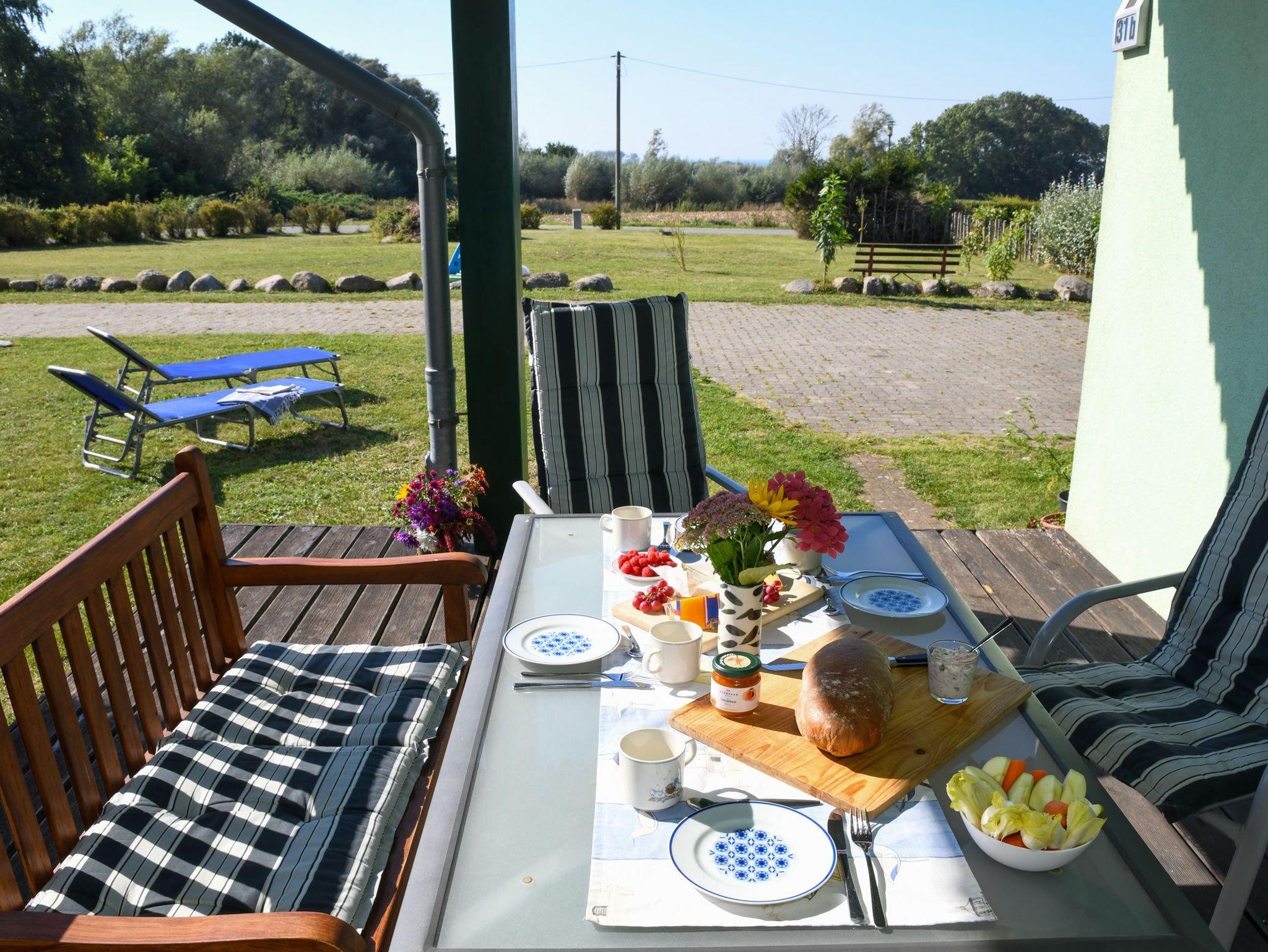 Der große Garten um die Ferienhäuser herum bietet Platz zum gemeinsamen Essen, viele sonnige und schattige Rückzugörtchen zum Relaxen. Für Kids gibt es im Garten und rund um das Ferienhaus Platz zum Spielen, Toben und Fußballspielen.