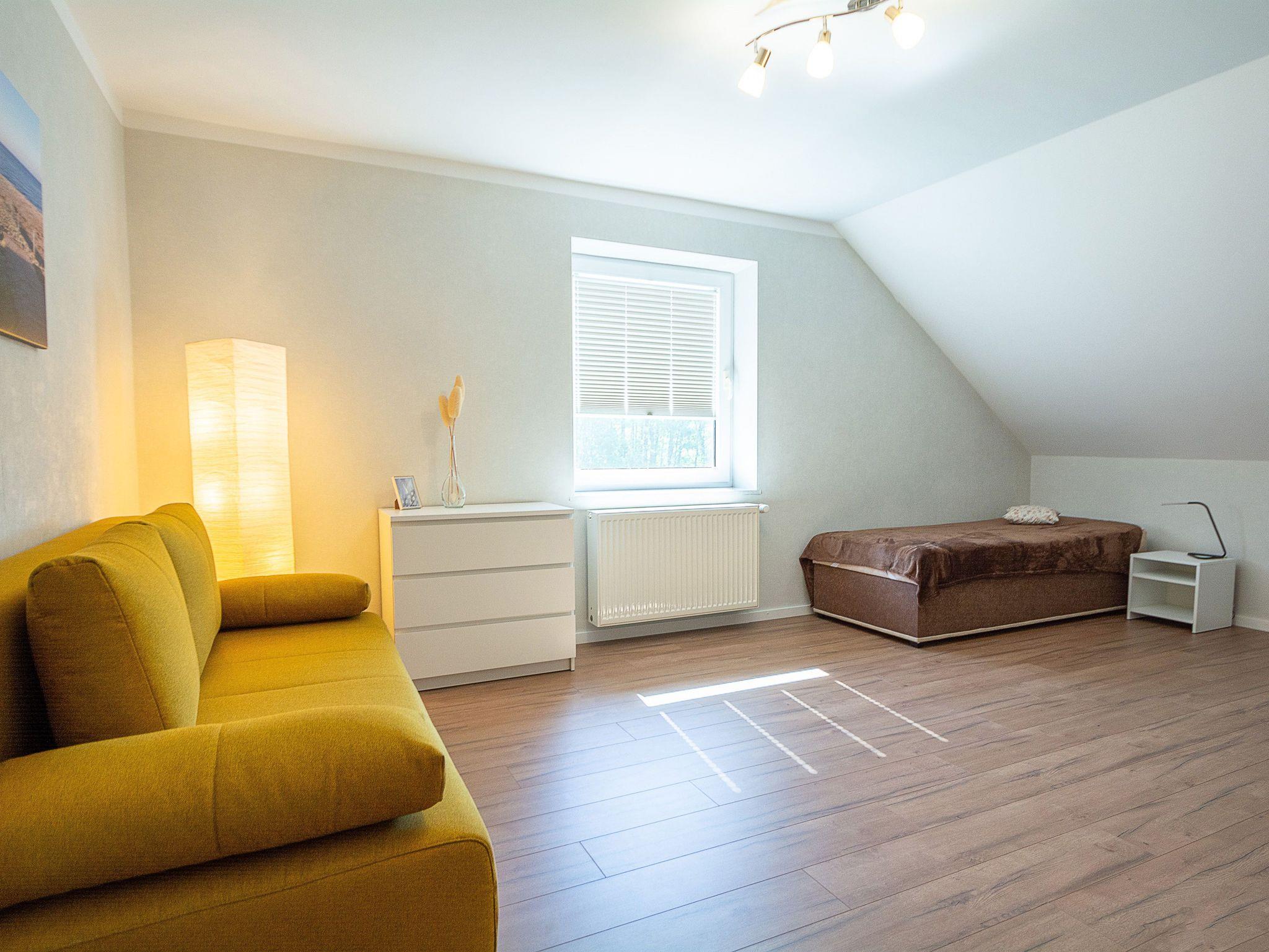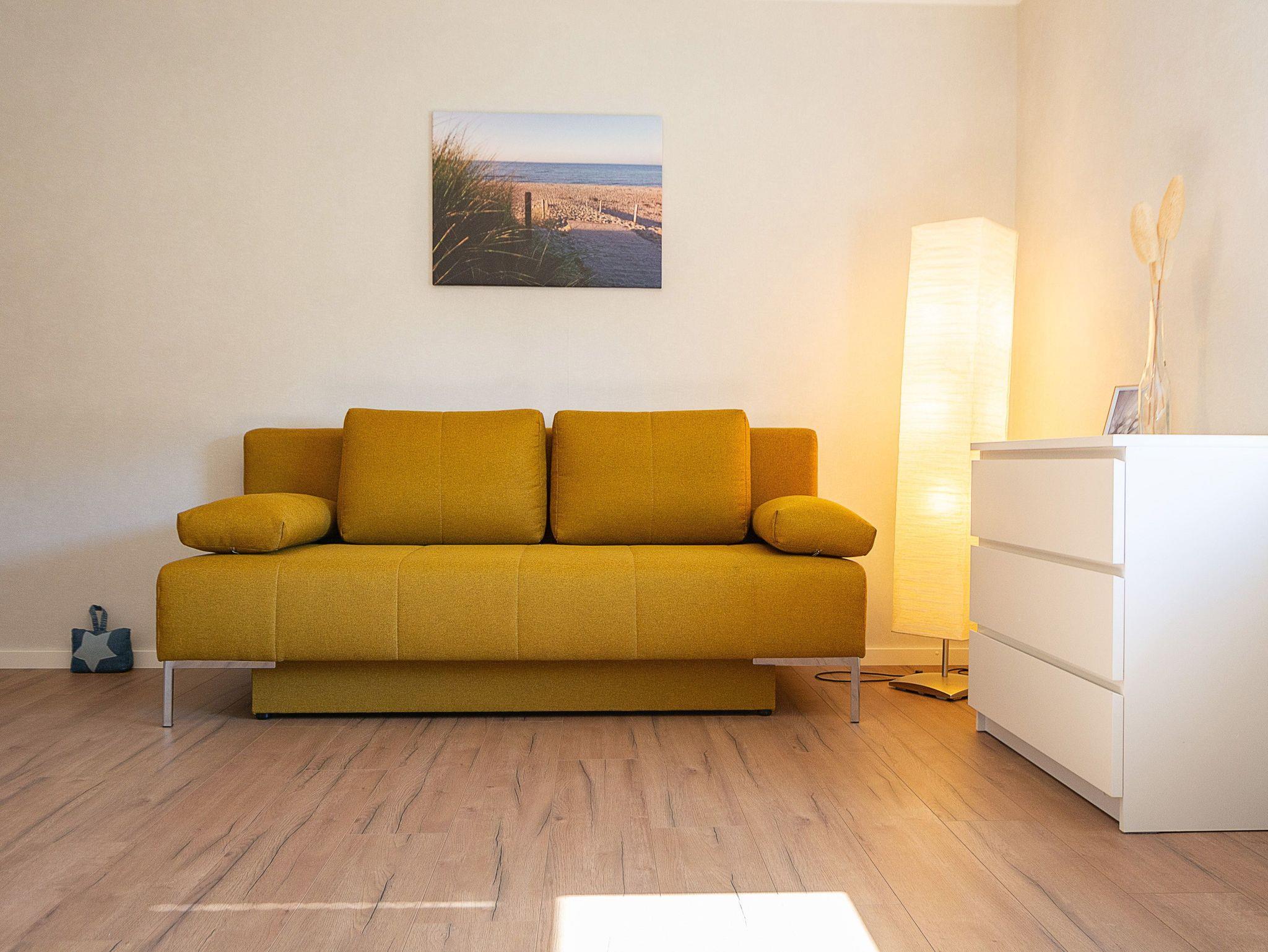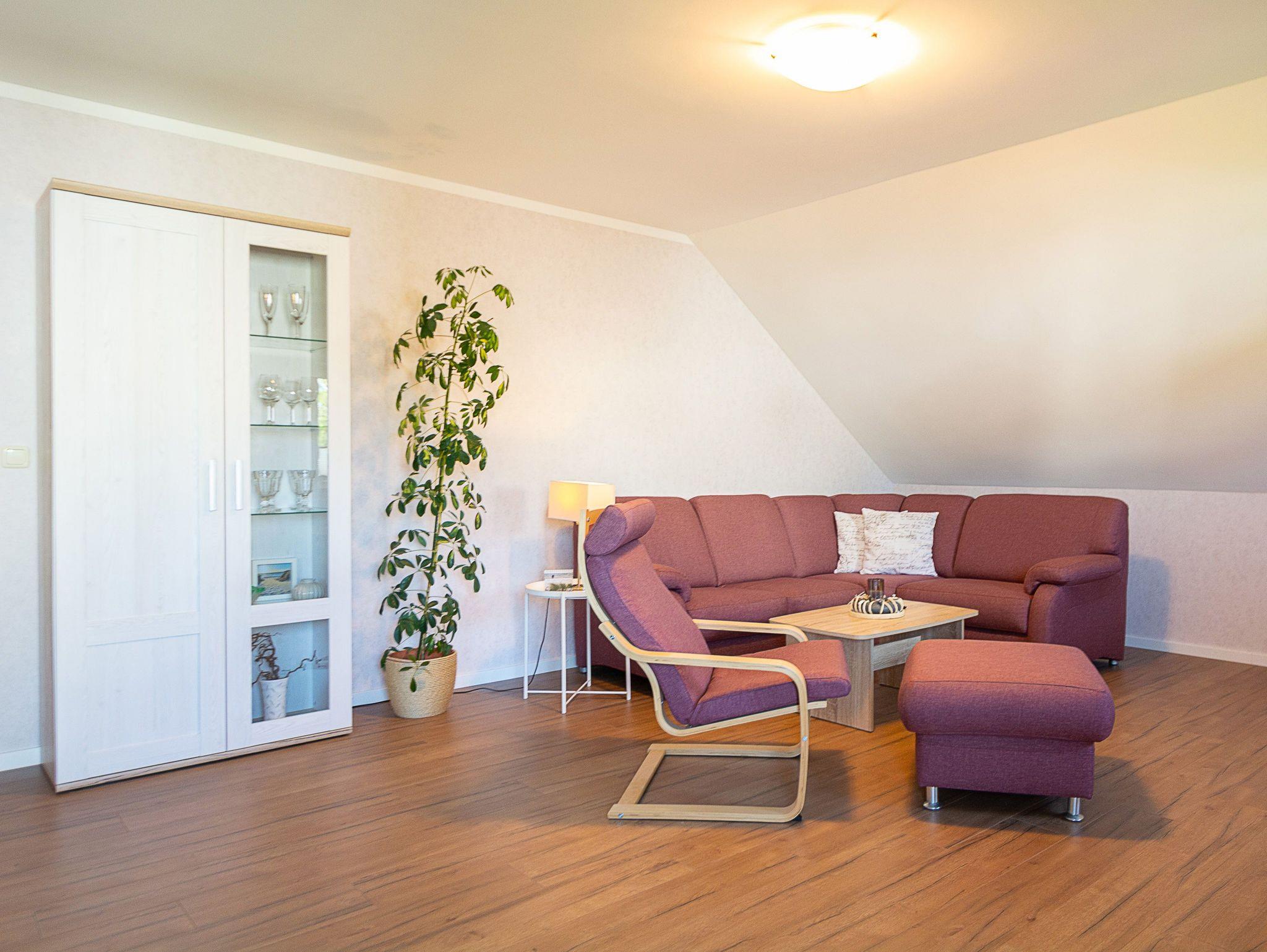 Es begrüßt Sie ein großzügiger Flur sowie ein großer heller und offener Wohn- und Essbereich. Eine gemütliche Wohnlandschaft, ein Flachbild-TV und Radio sowie der Essbereich befinden sich ebenfalls im Wohnraum. Vom Wohnzimmer betreten Sie den kleinen möblierten Balkon (Sitzplatz für 2 Personen). Von hier können Sie einen weiten Blick über die Felder und Wiesen bis hin zum Salzhaff genießen.