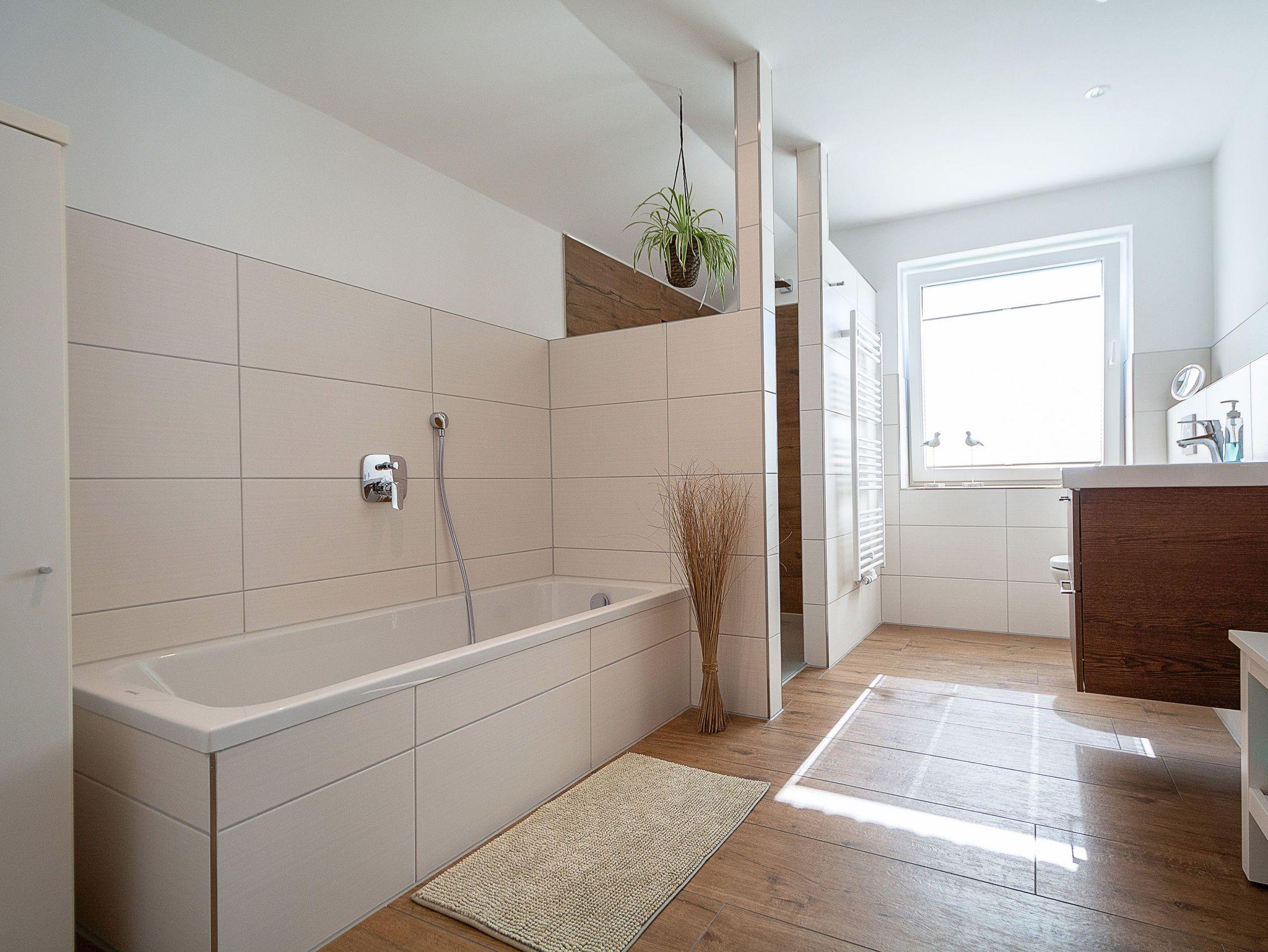 Das moderne geflieste Tageslichtbad verfügt über eine Badewanne, eine bodengleiche Dusche mit Regenwaldfunktion und WC sowie ein Fön, ein Handtuchheizkörper, ein Kosmetikspiegel und genügend Ablagefläche für Ihre Waschutensilien. Das Gäste-WC sowie ein Sitzbereich im Garten runden das Gesamtbild dieser Ferienwohnung ab.