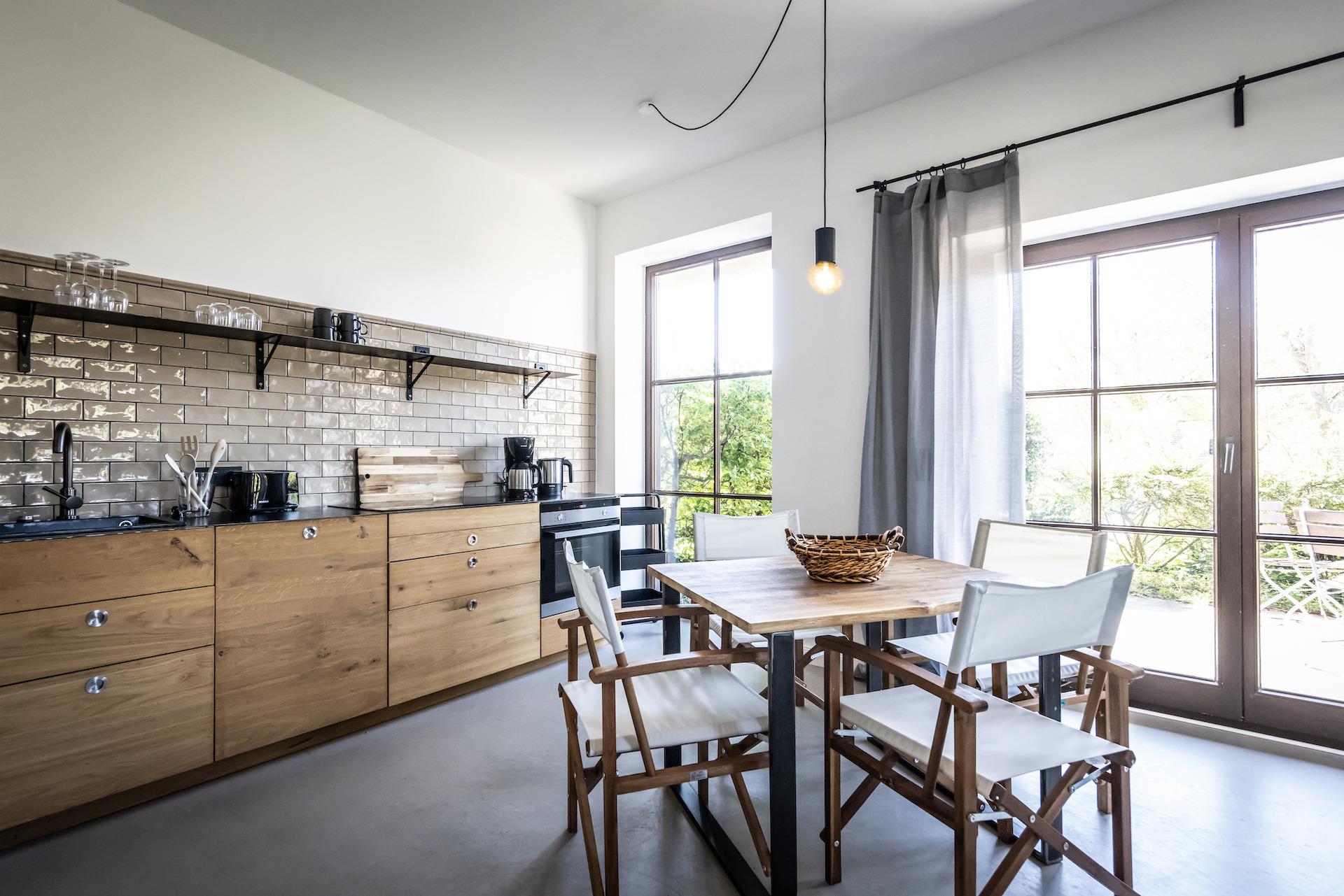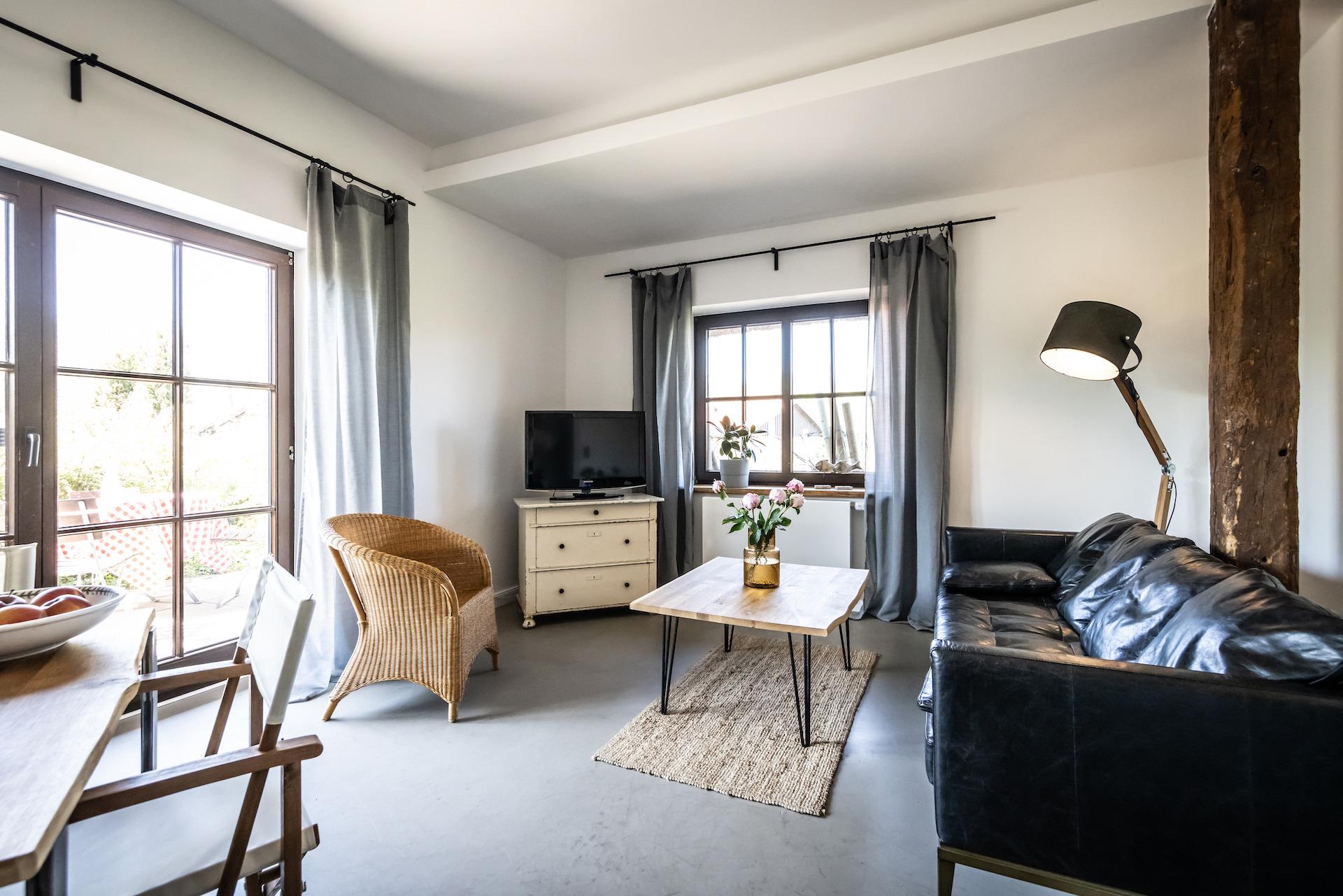 Komplett renovierte Ferienwohnung mit Terrasse auf dem Gutshof Bastorf, ideal für bis zu 4 Personen und Haustiere.
