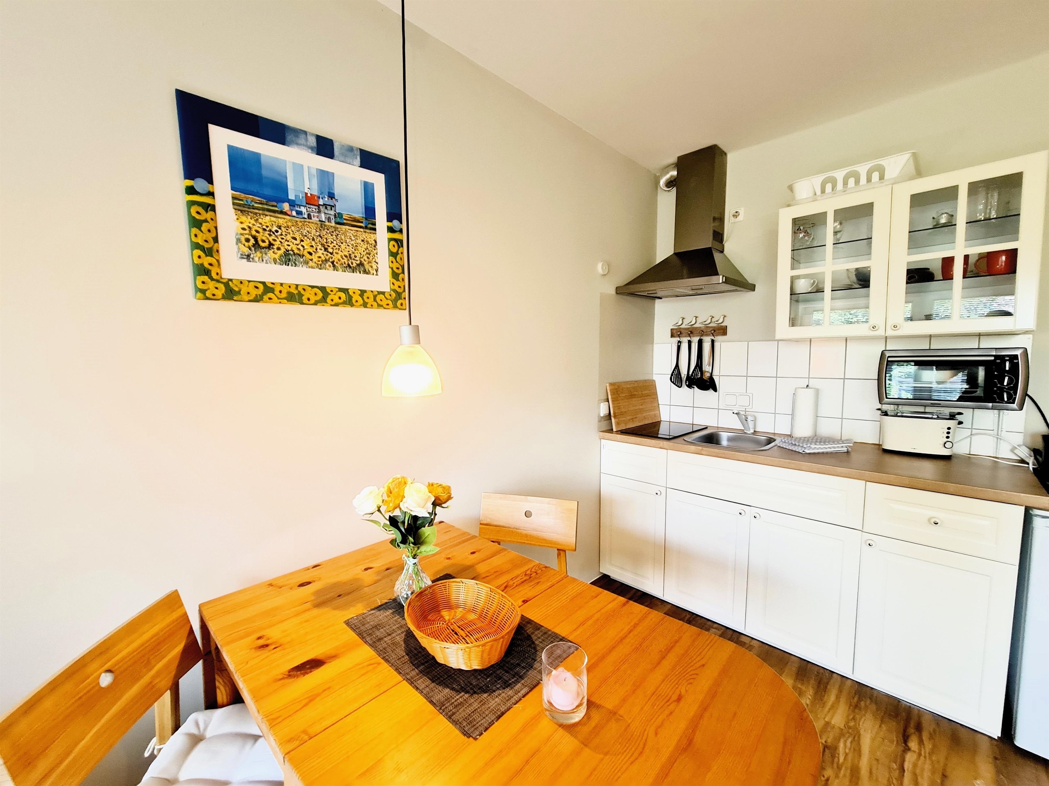 Die Wohnung befindet sich im ersten Stock des Hauses und verfügt über eine kleine Küche, mit allem was man für einen kleinen Urlaub an der Küste braucht.