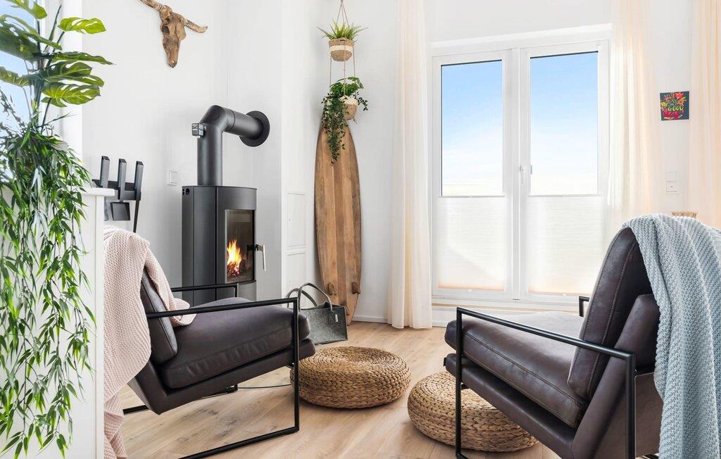 Die Dachterrasse mit Blick auf die Salzwiesen und das Meer ist ein absolutes Highlight und wird euch begeistern. Hier könnt ihr den Sonnenaufgang genießen oder einfach nur entspannen und die frische Seeluft einatmen. Der Kaminofen im angrenzenden Wohnbereich sorgt für eine gemütliche Atmosphäre an kühlen Abenden. Für weitere Unterhaltung sorgt der Smart-TV mit einigen Streaminganbietern wie Magenta TV.
