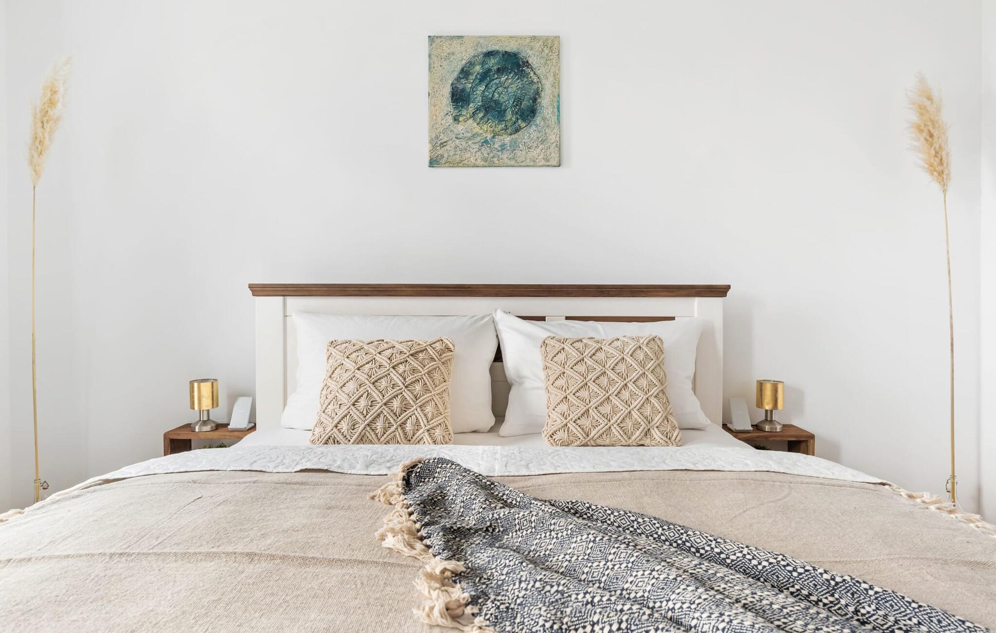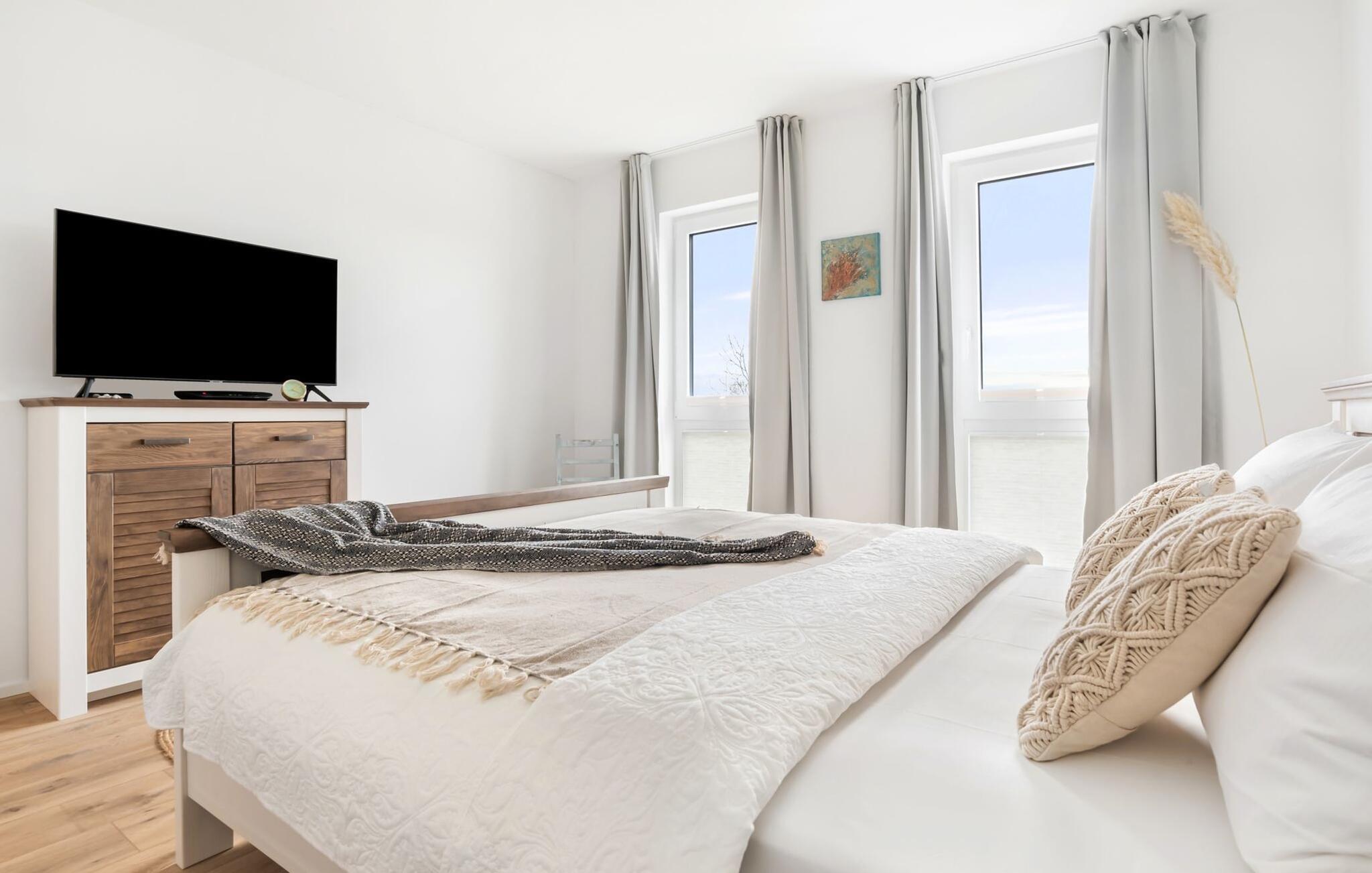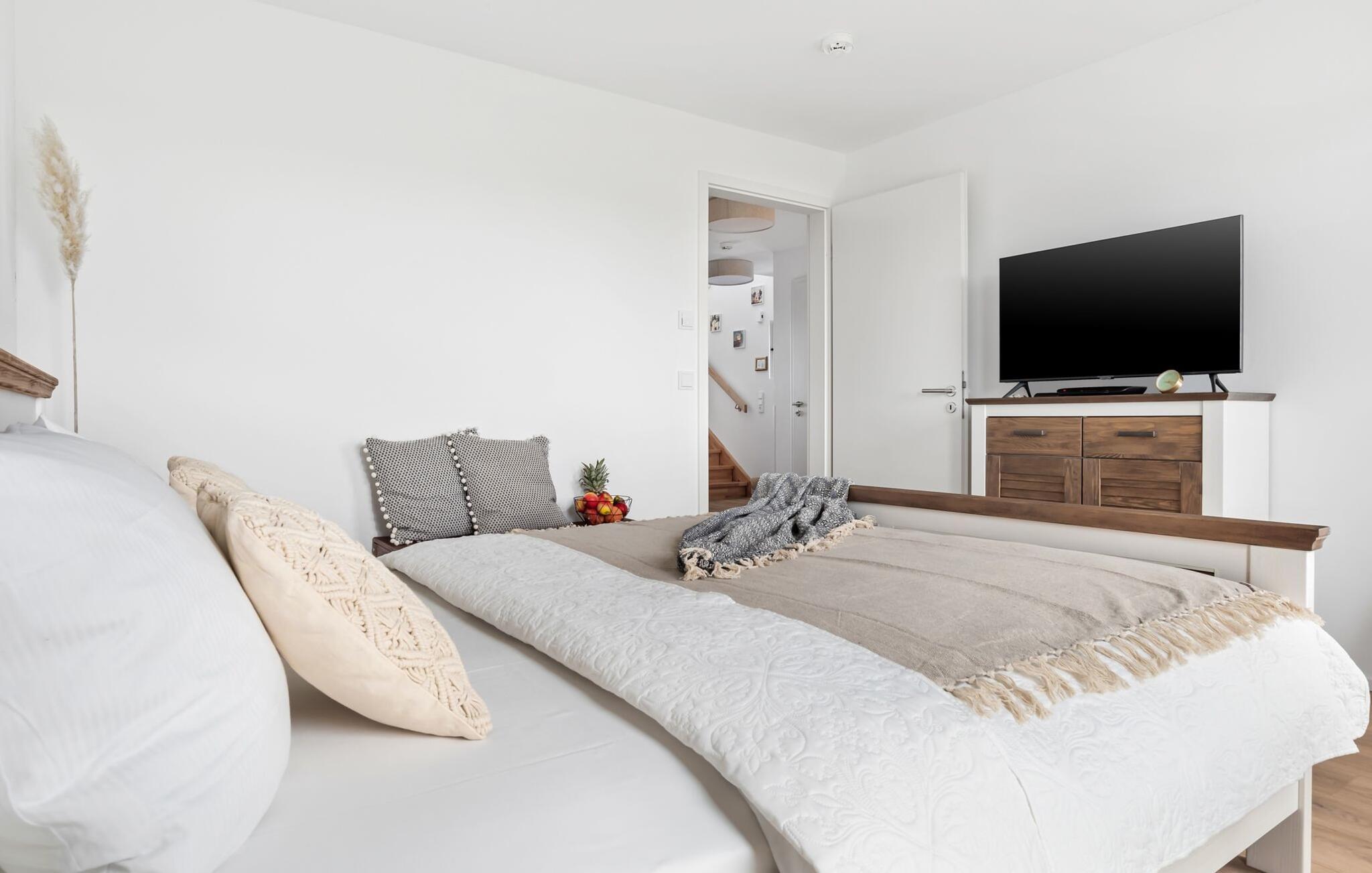Auf der unteren Etage befindet sich der Ruhebereich der Wohnung. Von den drei Schlafzimmern sind zwei mit gemütlichn Doppelbetten ausgestattet (180x200cm und 160x200cm) und eines mit zwei Einzelbetten (je 90x200cm). Zudem verfügen alle Schlafzimmer über einen Smart-TV.