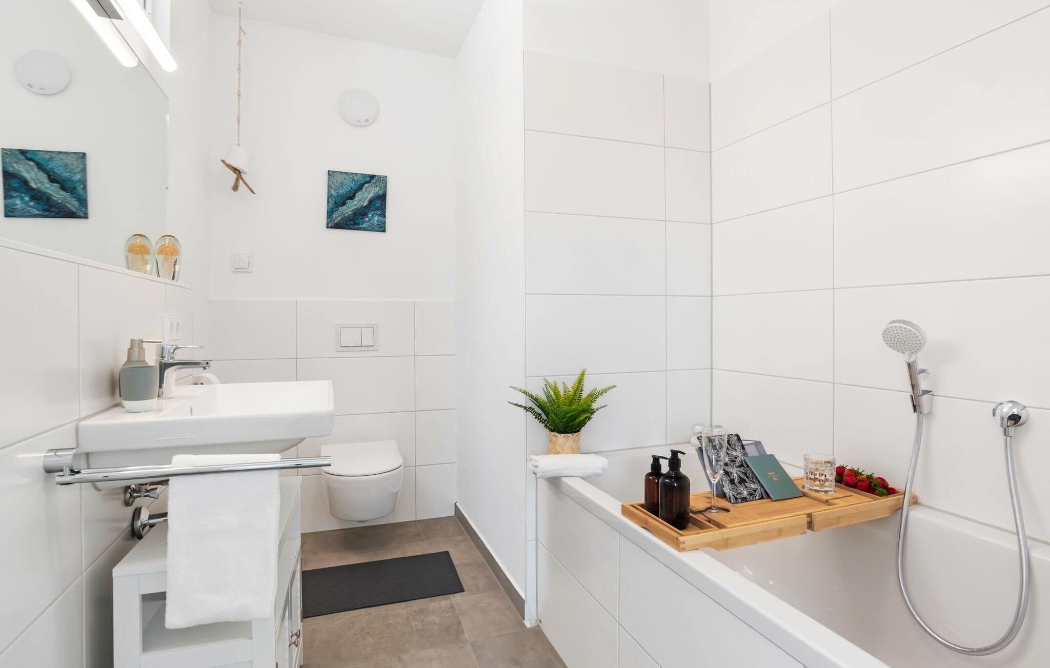 Sollte sich das Wetter mal von der stürmischen Seite zeigen, bietet euch das Bad inkl Badewanne die perfekte Möglichkeit, sich aufzuwärmen und euren Urlaub unbeschwert zu genießen.