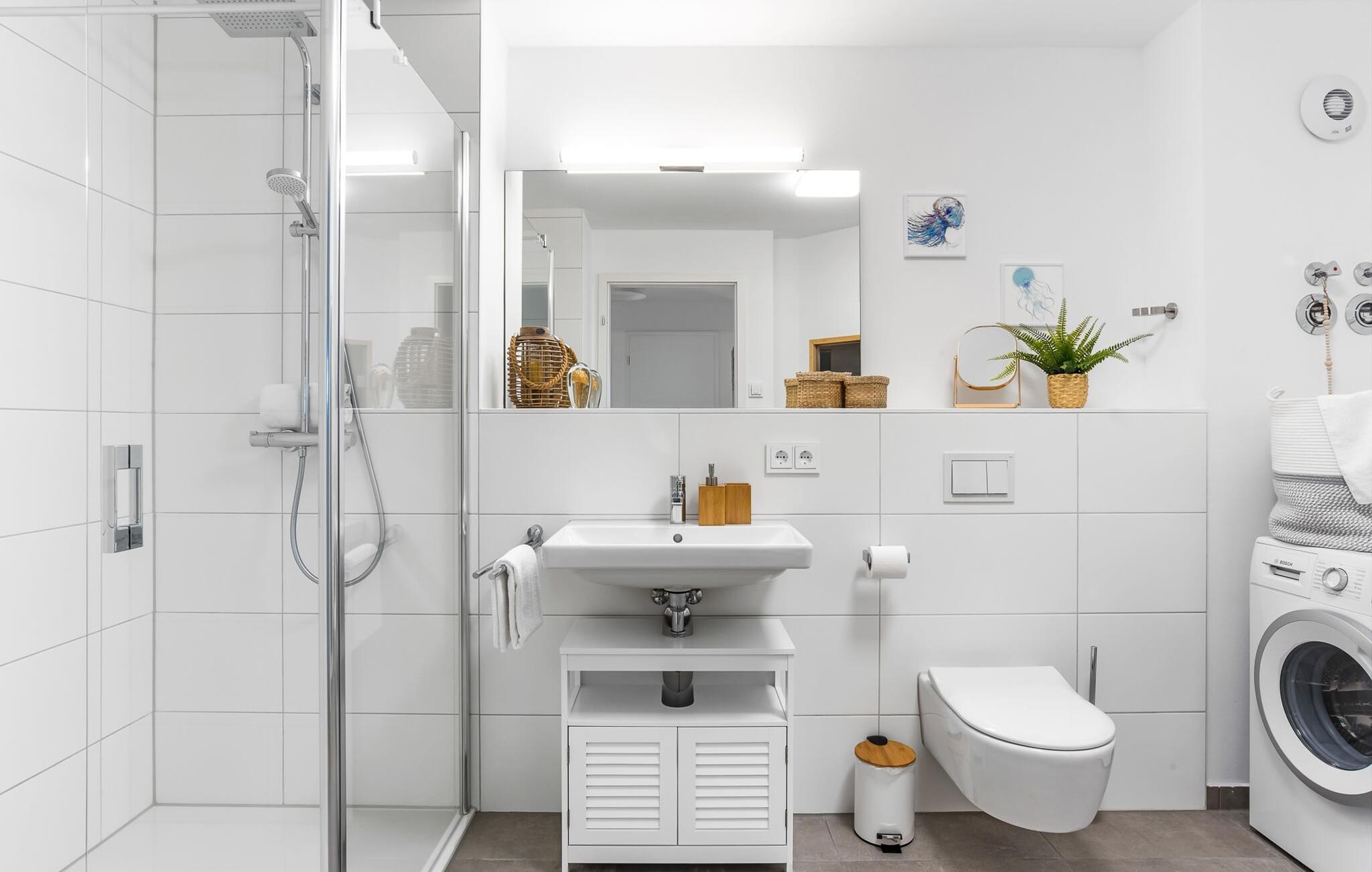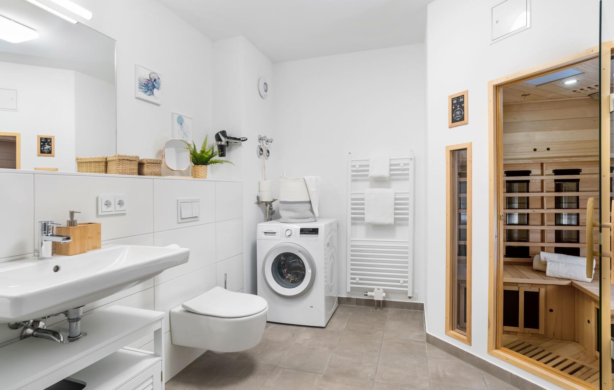 Das angrenzende Hauptbad ist eure eigene kleine Wellnesoase und sorgt dank der InfrarotSauna (Wärmekabine) und der bodengleichen Dusche für die nötige Entspannung nach einem langen Strandtag.