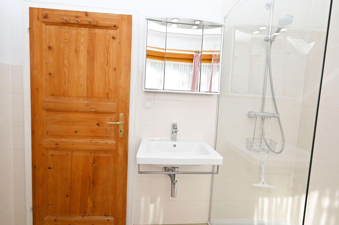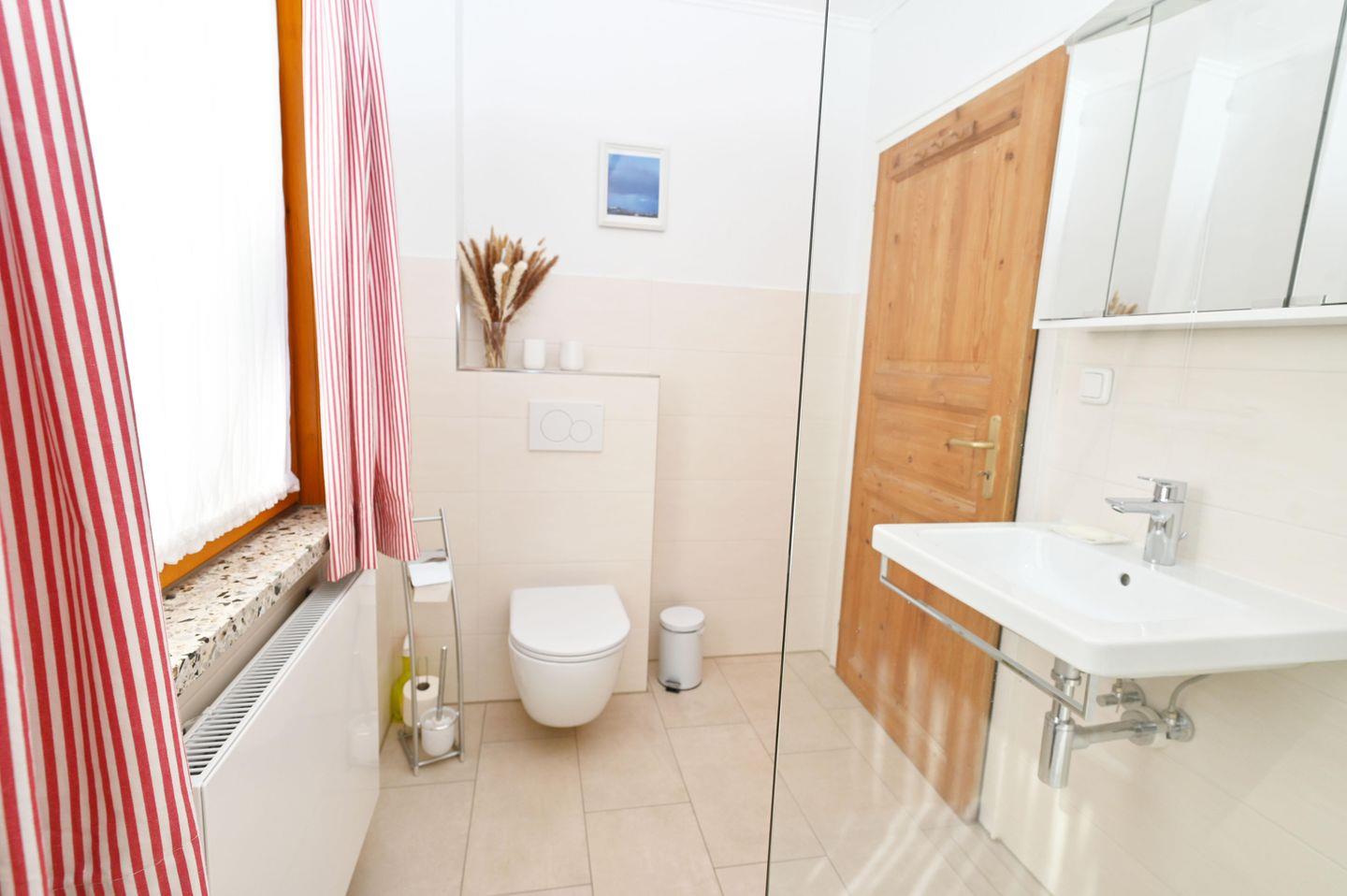 Das helle Badezimmer wurde kürzlich renoviert und überzeugt mit einer modernen Optik und einer bodentiefen Dusche.