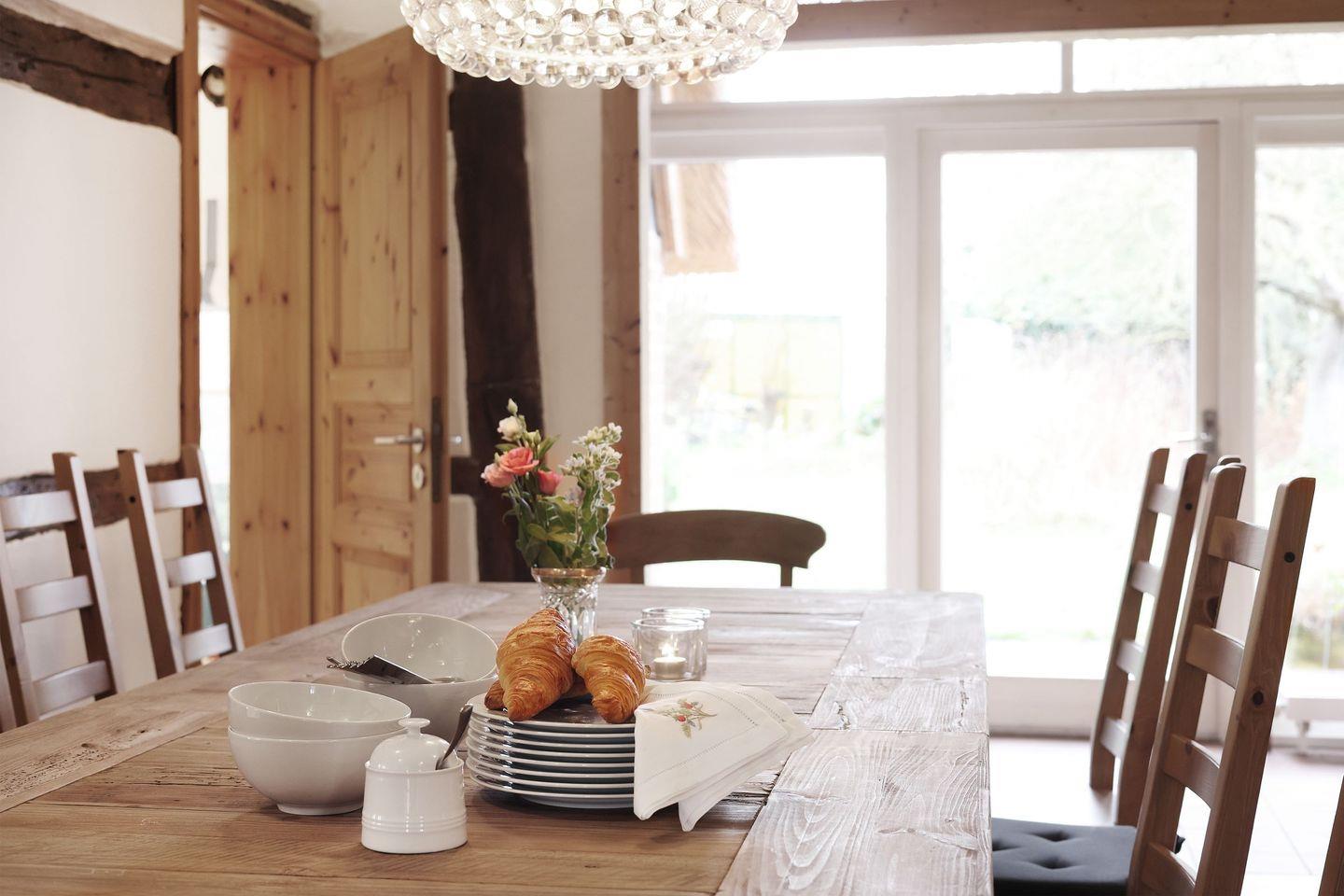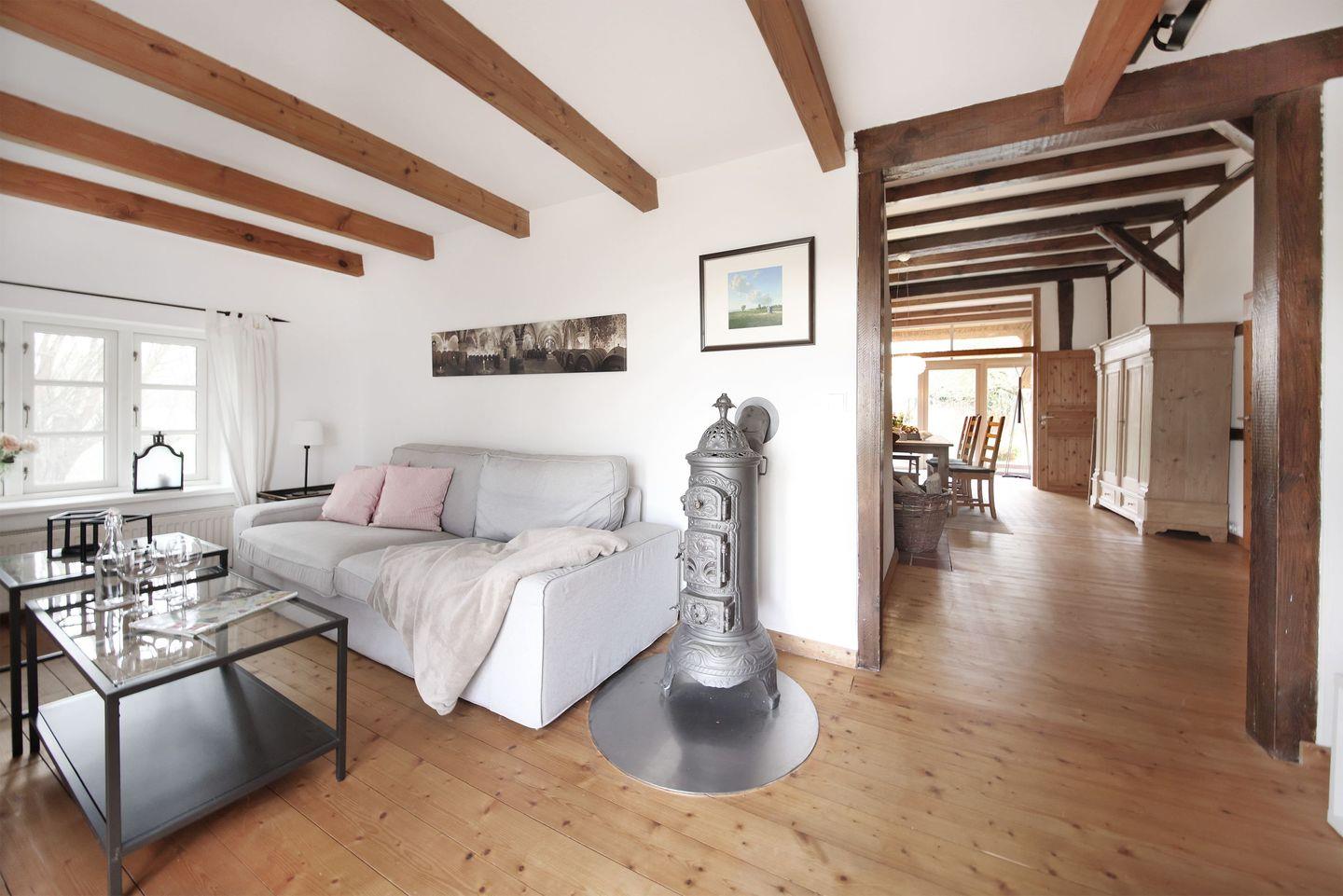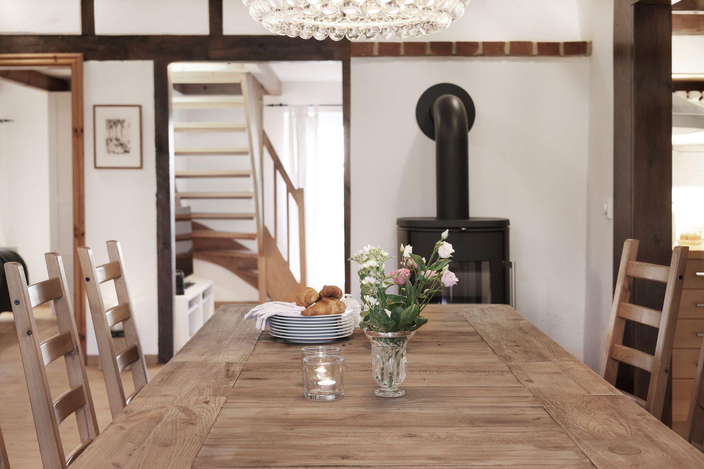 Das historische Fachwerkhaus verbindet traditionellen Landhauscharme mit einer gemütlichen, stilvollen Einrichtung. Hier können Sie den Alltag hinter sich lassen, den Duft von frisch gemähtem Gras genießen und abends bei einem Glas Wein den Sonnenuntergang über den Feldern bestaunen.