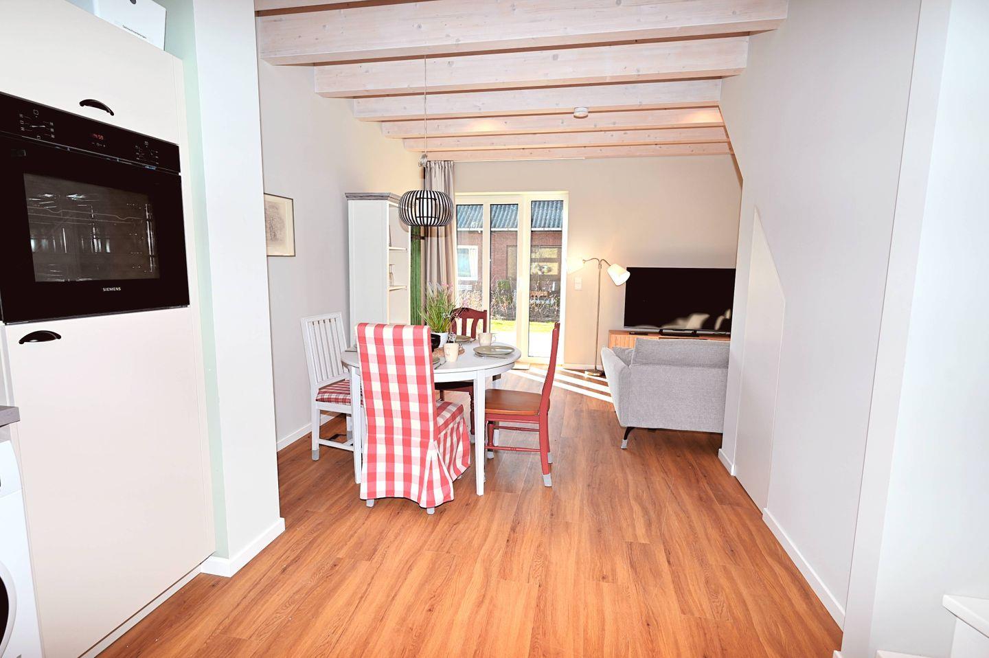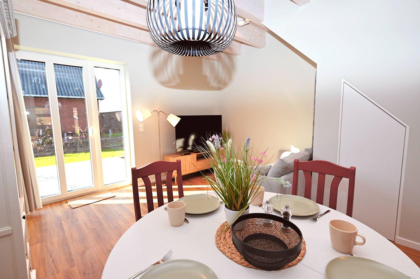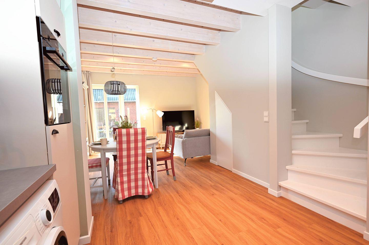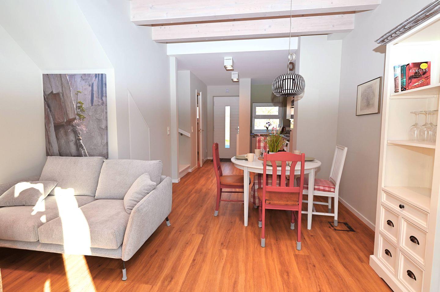 Der Wohnbereich ist offen gestaltet und mit der Küche verbunden. Eine Sofaecke mit Sofa und Sessel, ein Essbereich mit Esstisch sowie TV und WLAN schaffen angenehme Voraussetzungen für erholsame Urlaubstage. Bücher stehen ebenfalls zur Verfügung. Laminatböden in Wohn- und Schlafbereichen unterstreichen den gepflegten, wohnlichen Eindruck. Für ein angenehmes Raumklima sorgen Zentralheizung und Fußbodenheizung.