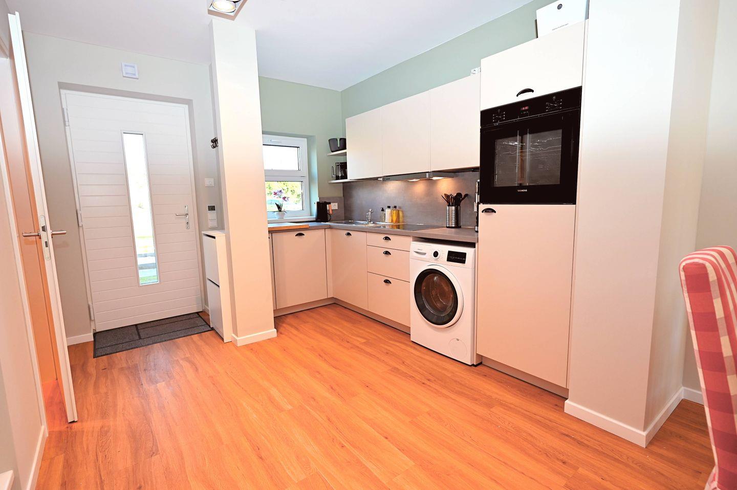 Die offene Küche zum Wohnzimmer ist umfassend ausgestattet und auf eine praktische Selbstversorgung ausgerichtet. Ihnen stehen Cerankochfeld, Backofen mit Elektroanschluss, Kühlschrank mit Gefrierfach, Spülmaschine, Kaffeemaschine, Wasserkocher, Toaster, Mixer sowie Küchenutensilien, Geschirr und Besteck zur Verfügung. So lassen sich Mahlzeiten im Alltag ebenso unkompliziert zubereiten wie ein entspanntes Frühstück oder ein gemeinsames Abendessen.