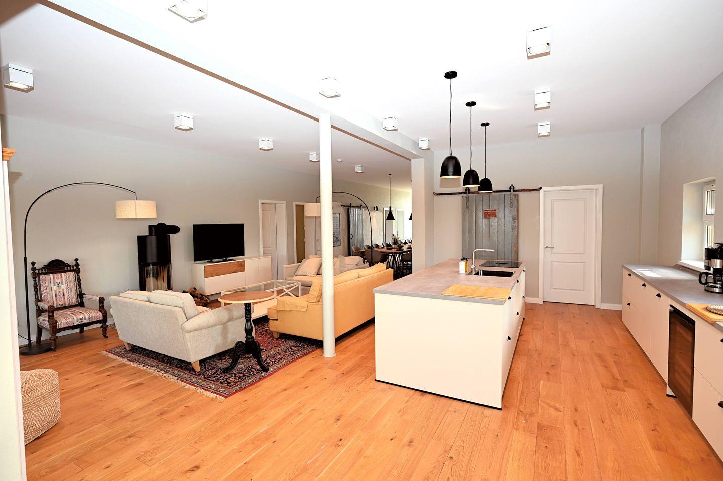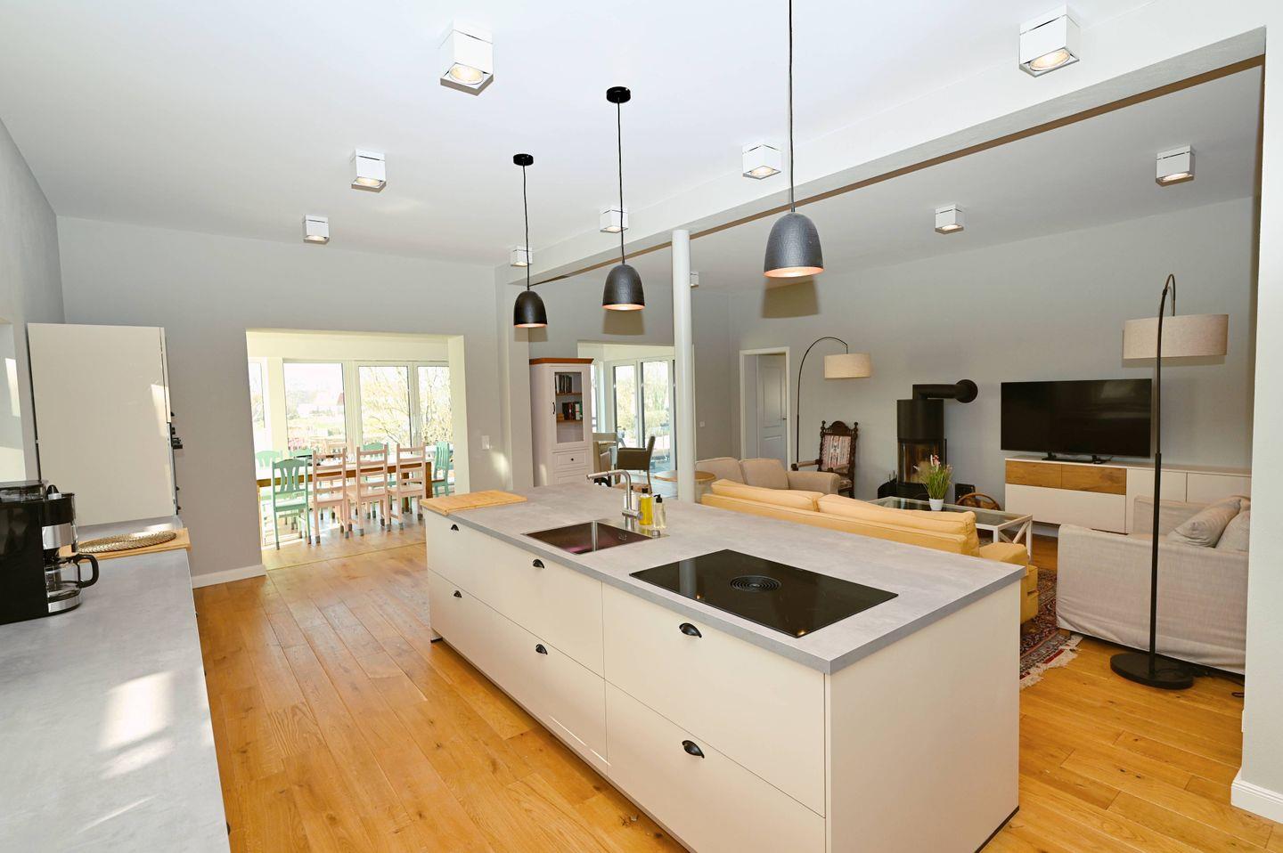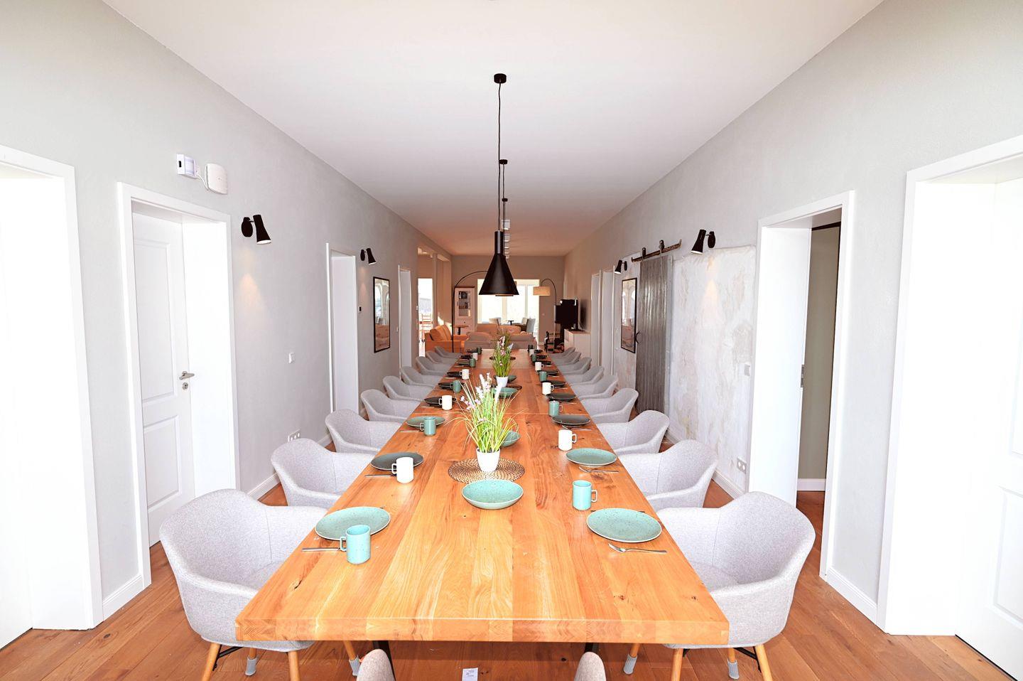 Der Wohnbereich ist offen gestaltet und mit Sofaecke, Sofa, Sesseln, Esstisch für 24 Personen, Essbereich und TV ausgestattet. Die offene Küche ist direkt zum Wohnzimmer hin angelegt und bietet mit Cerankochfeld in einer sehr großen Kochinsel, Backofen, Mikrowelle, Kühlschrank mit Gefrierfach, Weinkühlschrank, Spülmaschine, Wasserkocher, Toaster, Kaffeemaschine, Mixer sowie Geschirr und Besteck eine praktische Grundlage für die Selbstversorgung. Auch Gewürze sind vorhanden. Ein Schreibtisch, Bücher, Garderobe, Kommode, Ganzkörperspiegel und Wäscheständer ergänzen die Ausstattung sinnvoll. Für längere Aufenthalte stehen Ihnen zudem eine Waschmaschine zur Eigennutzung, Staubsauger sowie WLAN und Internet zur Verfügung.