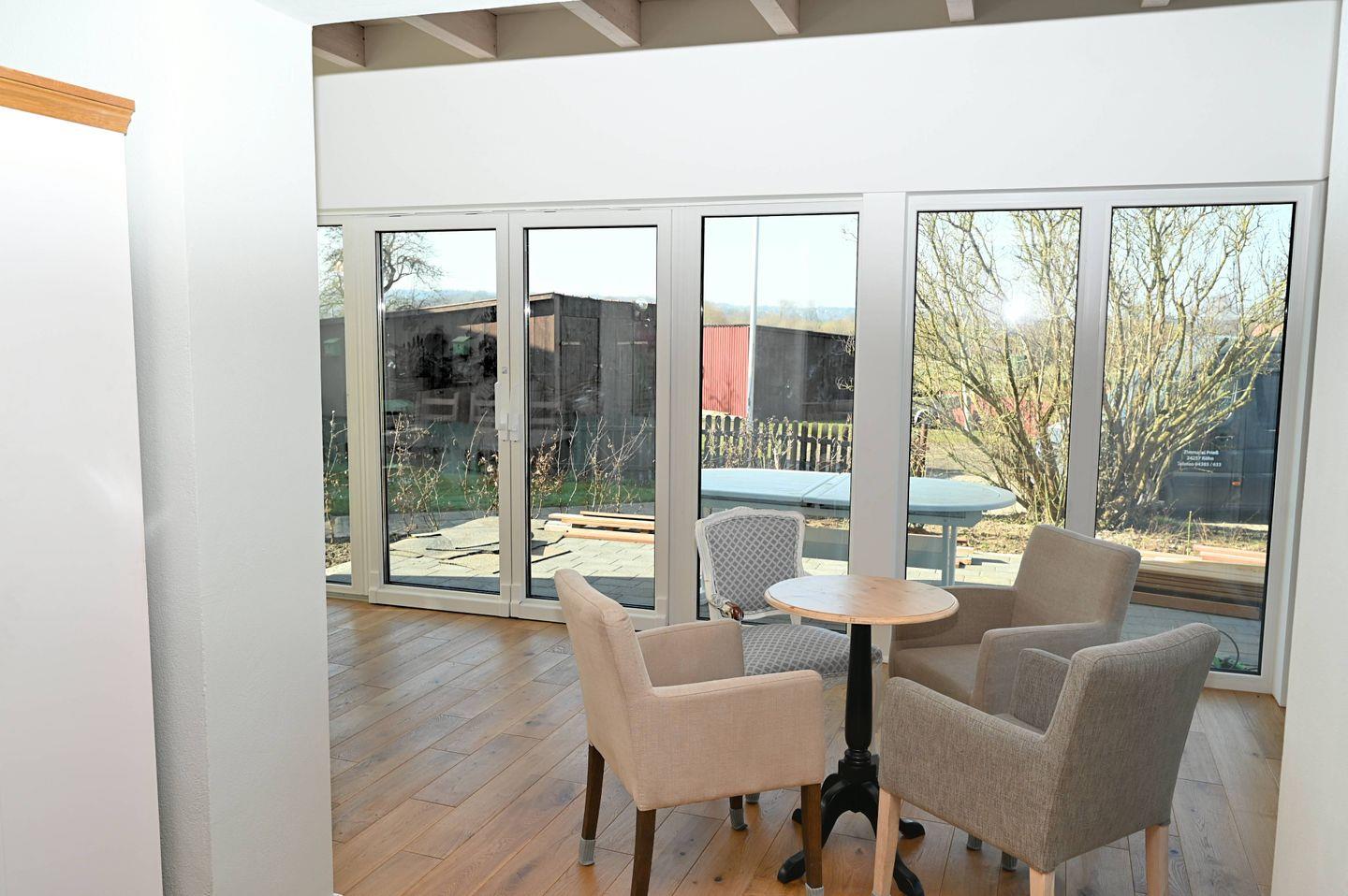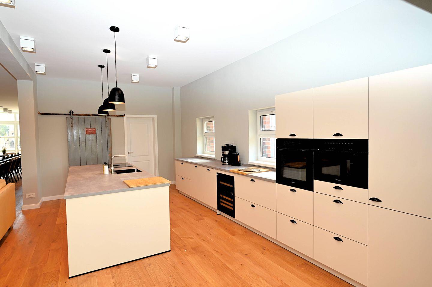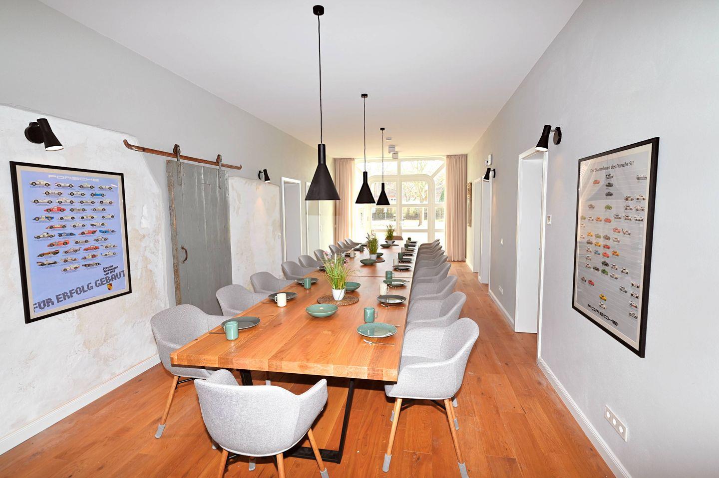 Der Wohnbereich ist offen gestaltet und mit Sofaecke, Sofa, Sesseln, Esstisch für 24 Personen, Essbereich und TV ausgestattet. Die offene Küche ist direkt zum Wohnzimmer hin angelegt und bietet mit Cerankochfeld in einer sehr großen Kochinsel, Backofen, Mikrowelle, Kühlschrank mit Gefrierfach, Weinkühlschrank, Spülmaschine, Wasserkocher, Toaster, Kaffeemaschine, Mixer sowie Geschirr und Besteck eine praktische Grundlage für die Selbstversorgung. Auch Gewürze sind vorhanden. Ein Schreibtisch, Bücher, Garderobe, Kommode, Ganzkörperspiegel und Wäscheständer ergänzen die Ausstattung sinnvoll. Für längere Aufenthalte stehen Ihnen zudem eine Waschmaschine zur Eigennutzung, Staubsauger sowie WLAN und Internet zur Verfügung.