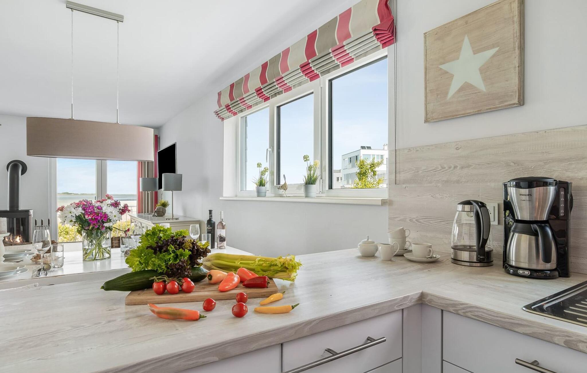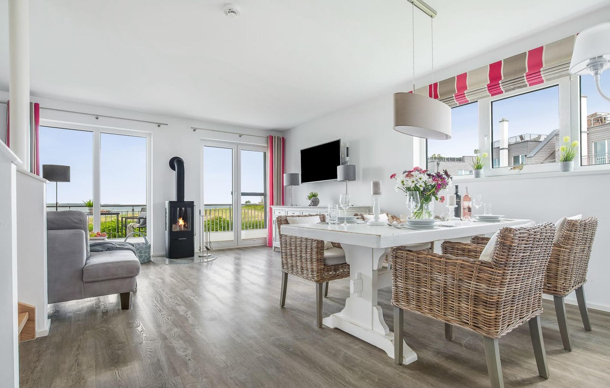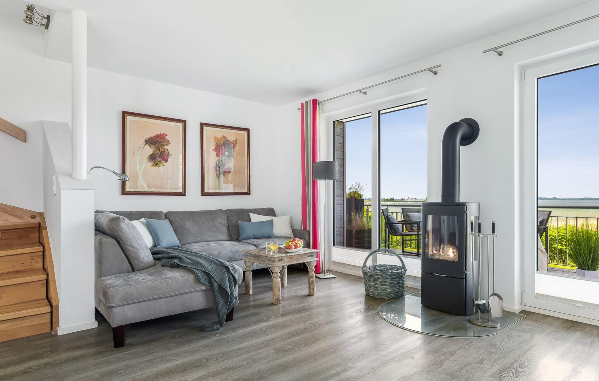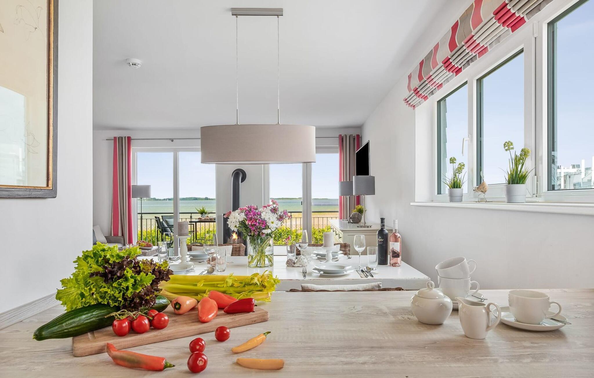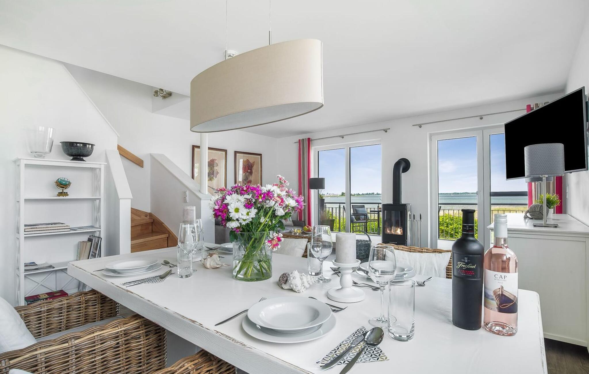 Der offene Wohn- /Essbereich im Erdgeschoss besticht mit bodentiefen Fenstern, durch die der Blick auf die Weite der Schlei fällt, welche direkt vor dem Fenster für ein atemberaubendes Panorama sorgt. Sitzlandschaft, Kaminofen und ein großzügiger Esstisch sorgen für Gemütlich- und Geselligkeit. Direkt angrenzend an das Wohnzimmer befindet sich die Terrasse mit Panoramablick auf die Schlei. Ob bei einem geselligen Grillabend oder mit Wein und Lektüre, das sich im Wind wiegende Schilf des Schleiufers und die Weite der Schlei sorgen für unvergessliche Urlaubsmomente.