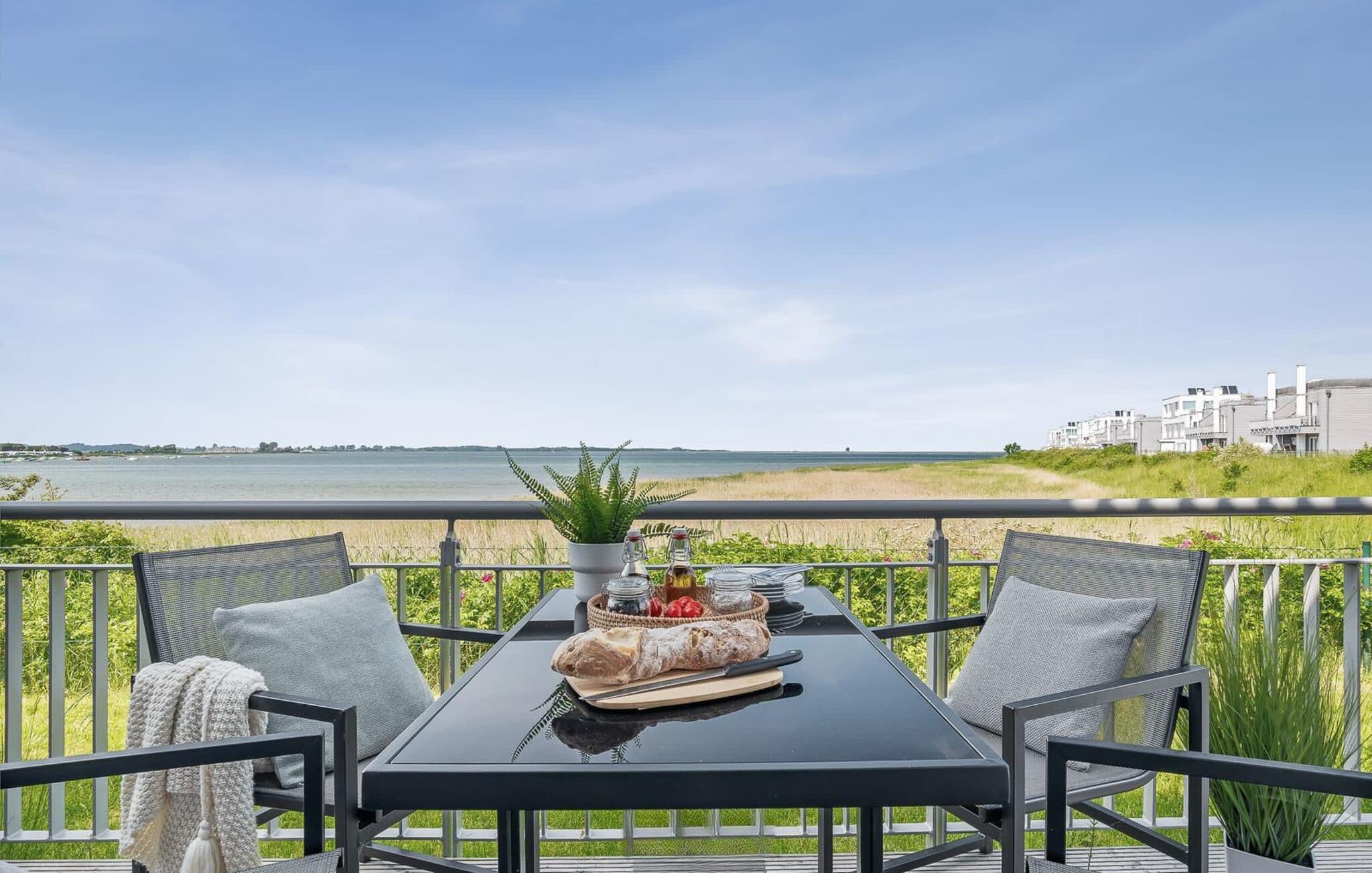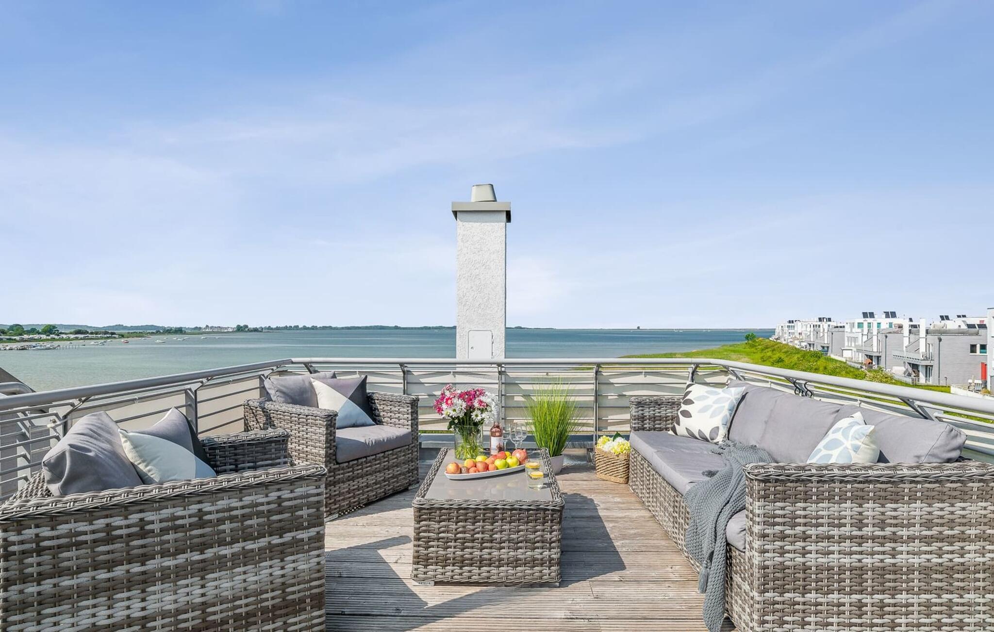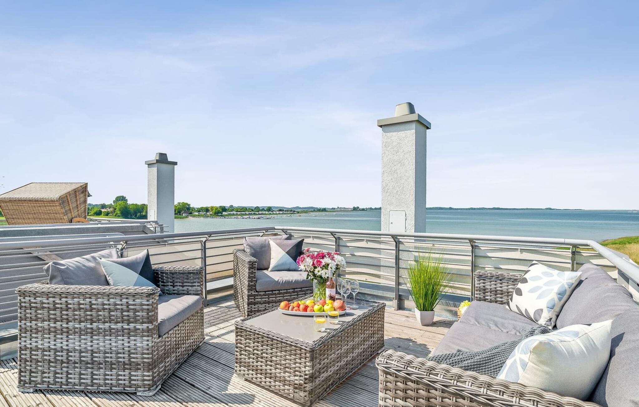 Unser Lieblingsplatz: Die große Dachterrasse mit Loungemöbeln, die einen Rundum-Wasserblick auf die weite Schlei und den Segel-und Sportboothafen des OstseeResorts bietet.