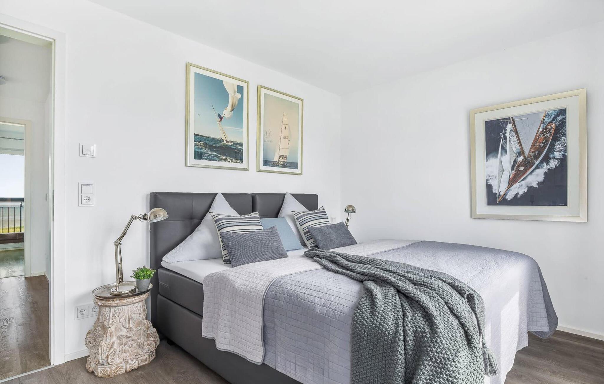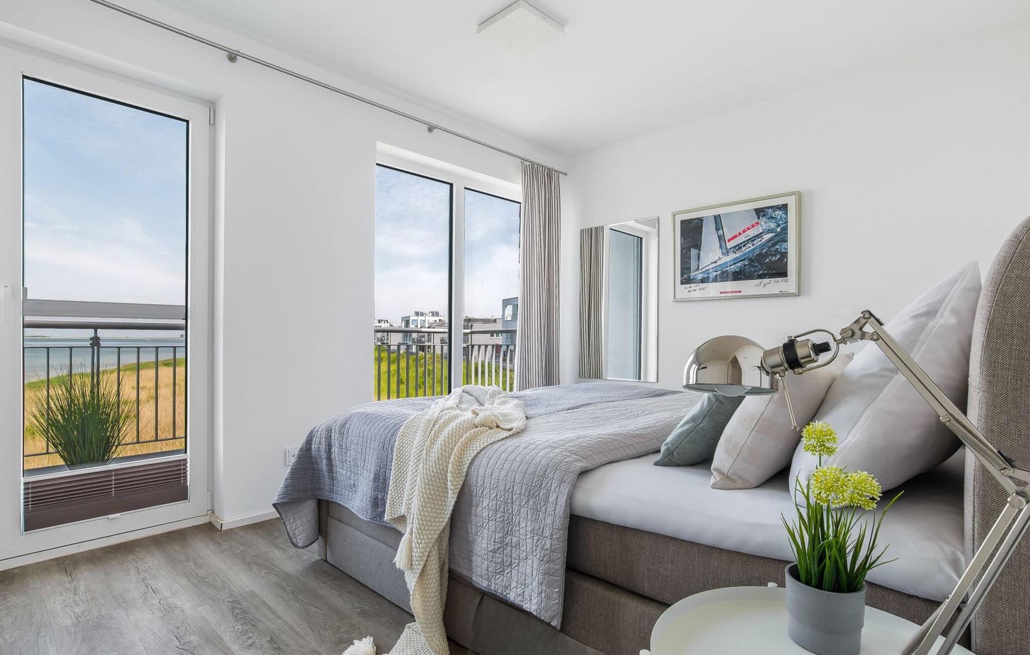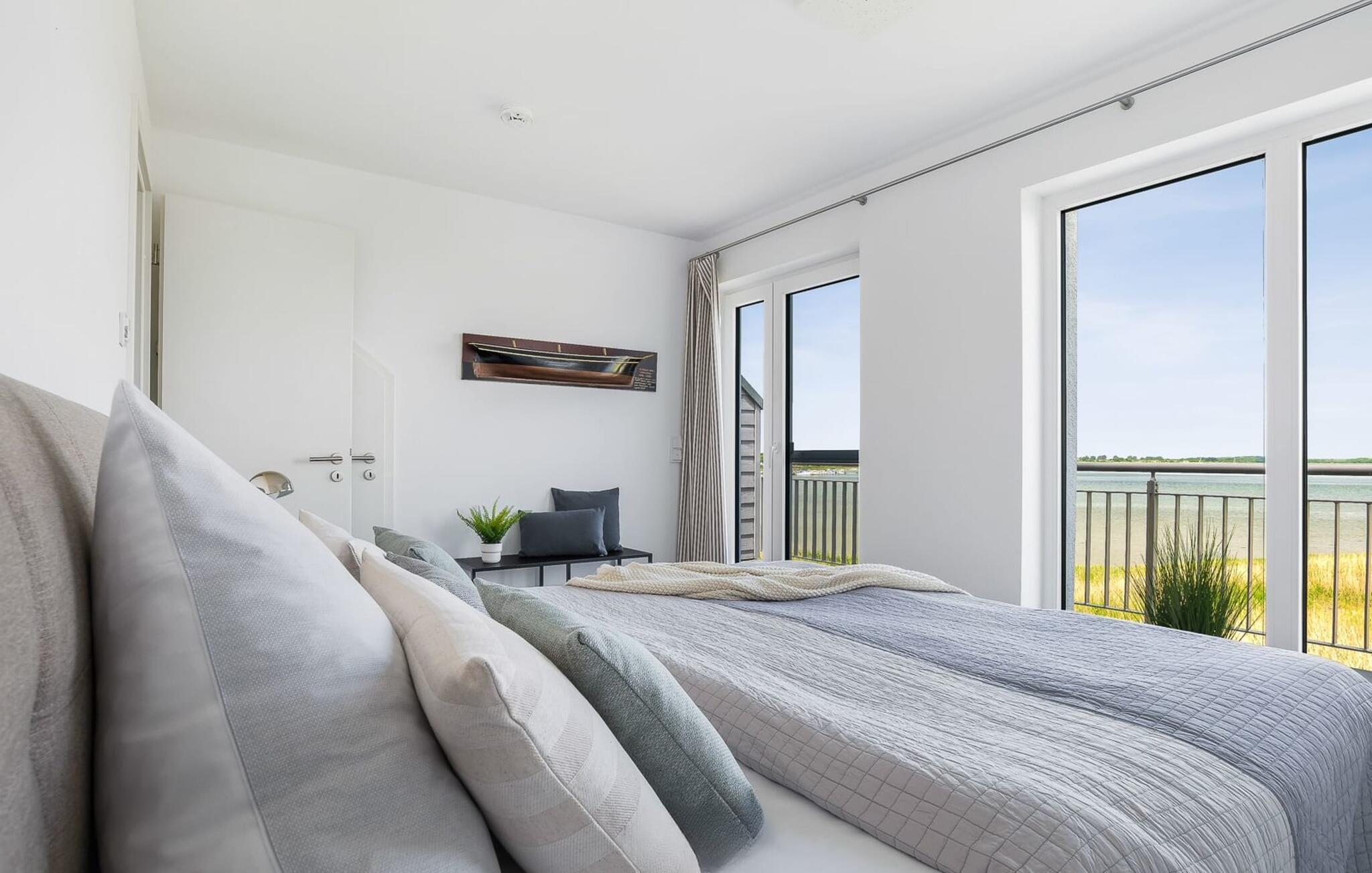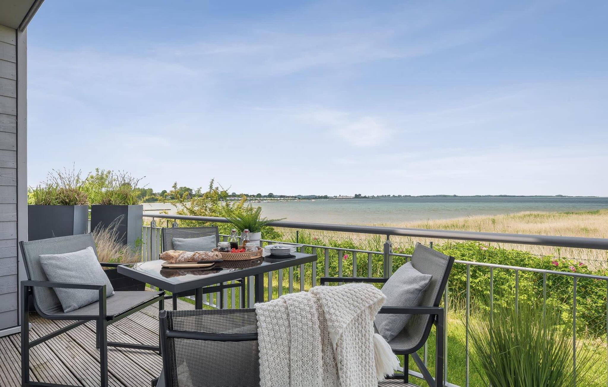 Unser Lieblingsplatz: Die große Dachterrasse mit Loungemöbeln, die einen Rundum-Wasserblick auf die weite Schlei und den Segel-und Sportboothafen des OstseeResorts bietet.