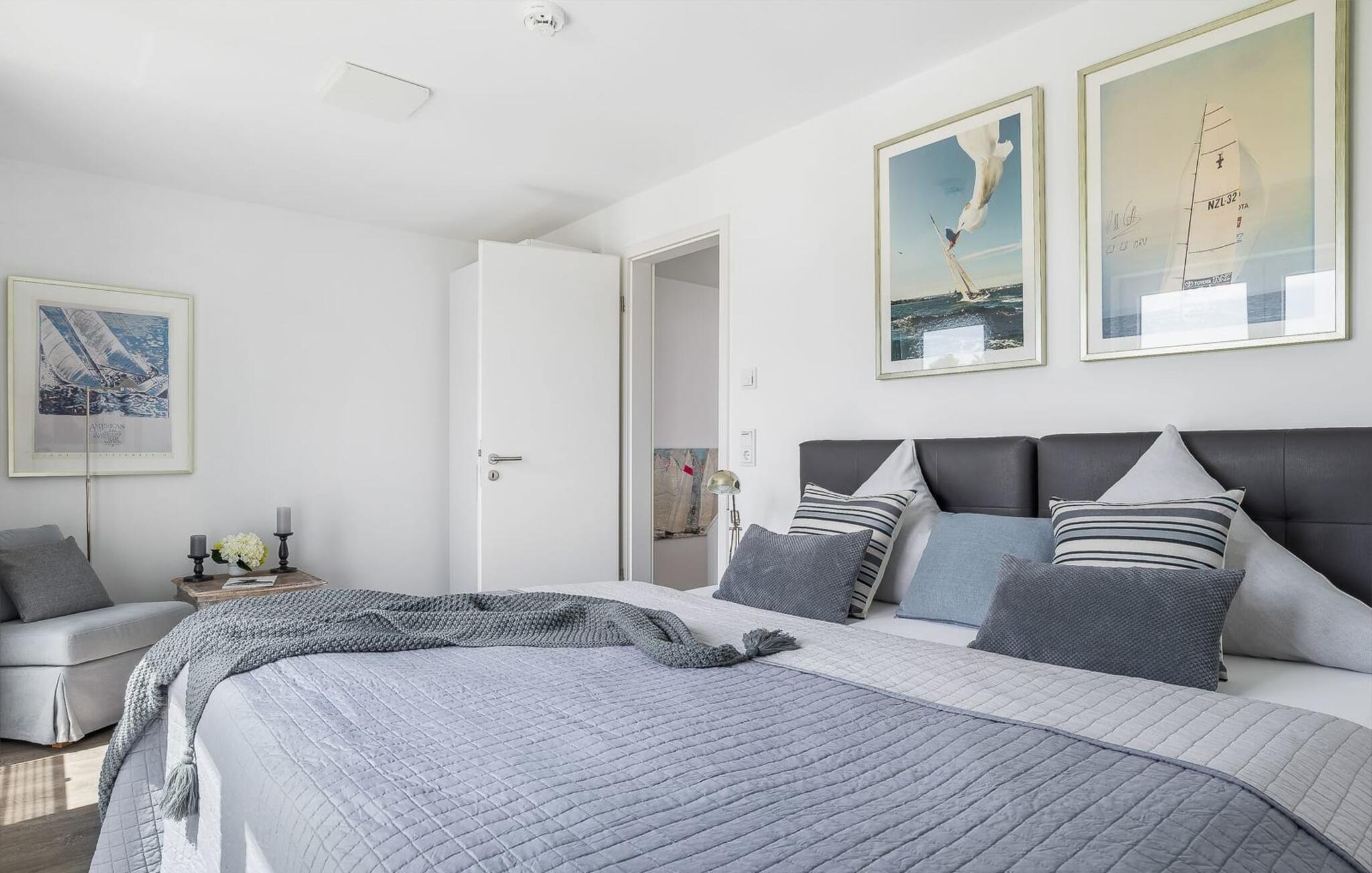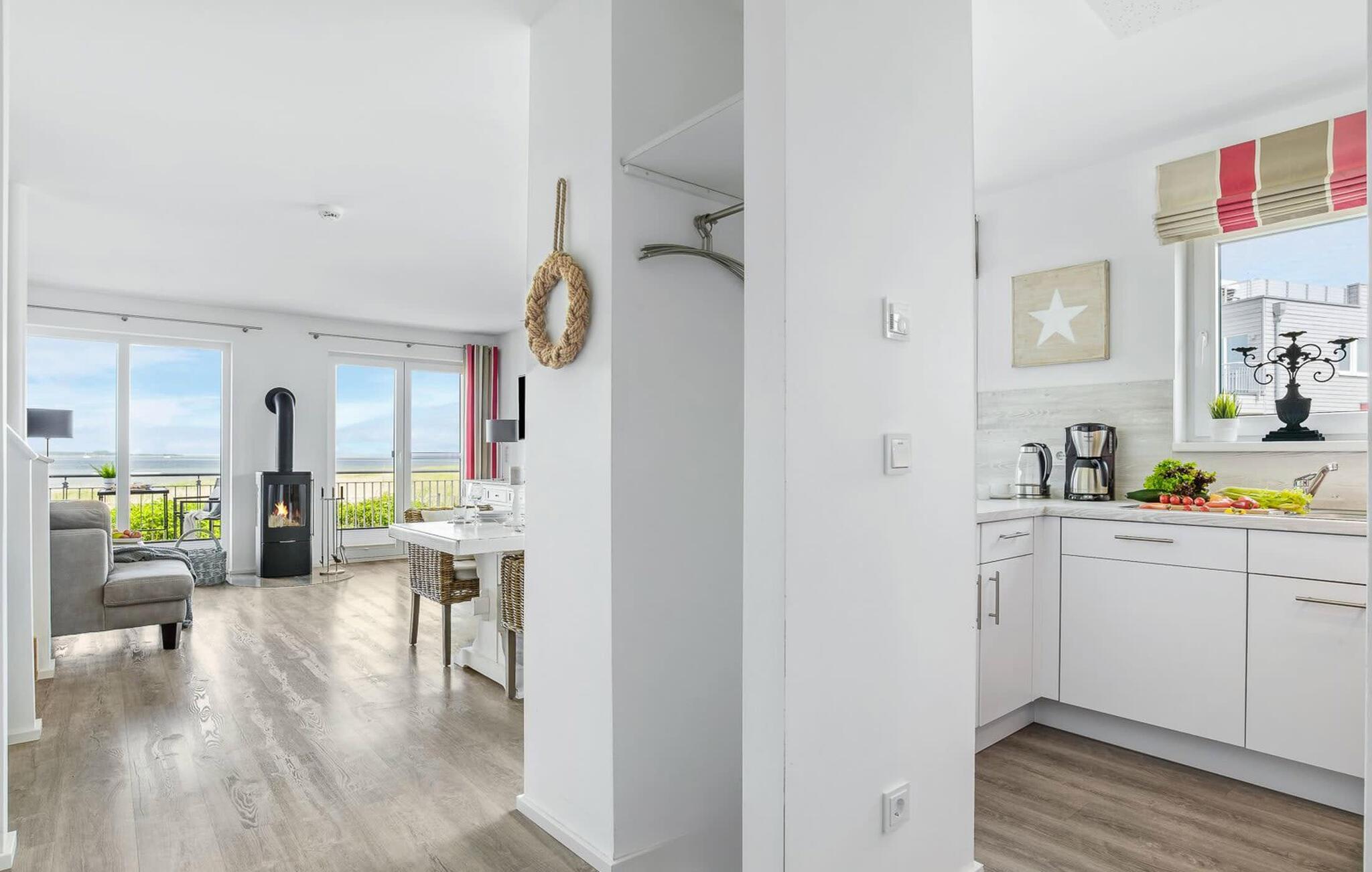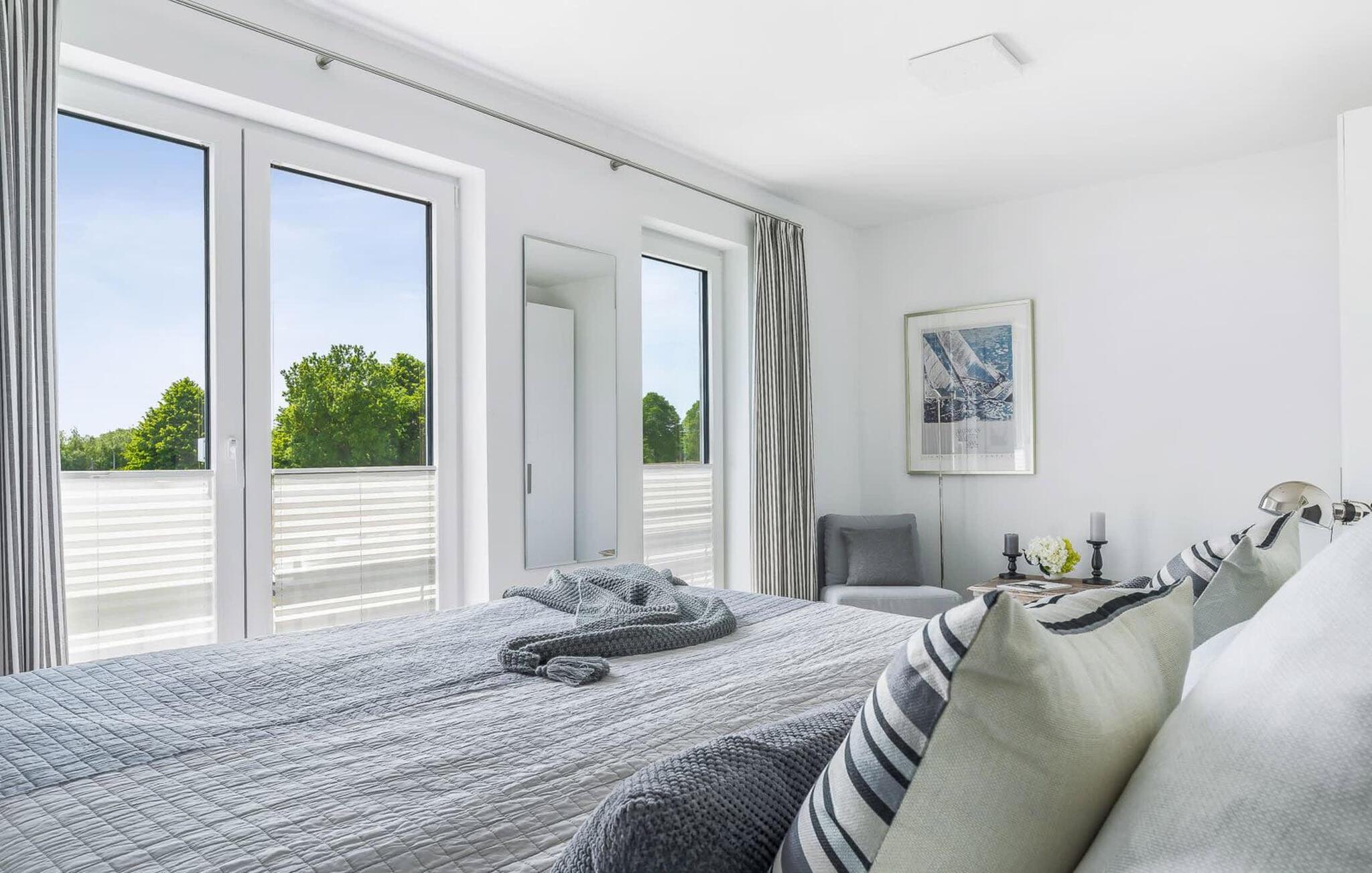 Offen gestaltet befindet sich die Küche direkt angrenzend an den Wohnbereich und lässt dank umfangreicher Ausstattung keine Wünsche offen. Im Obergeschoss werden Träume wahr, denn im Hauptschlafzimmer darf der Gast aufwachen und einschlafen bei atemberaubendem Schleiblick. Morgens bietet das Schleiufer ein wahres Naturspektakel. Wenn die Enten und Schwäne aufwachen, lässt sich der Tag auf der an das Schlafzimmer angrenzenden Terrasse beginnen. Ein weiteres Schlafzimmer bietet Platz für zwei weitere Erwachsene.