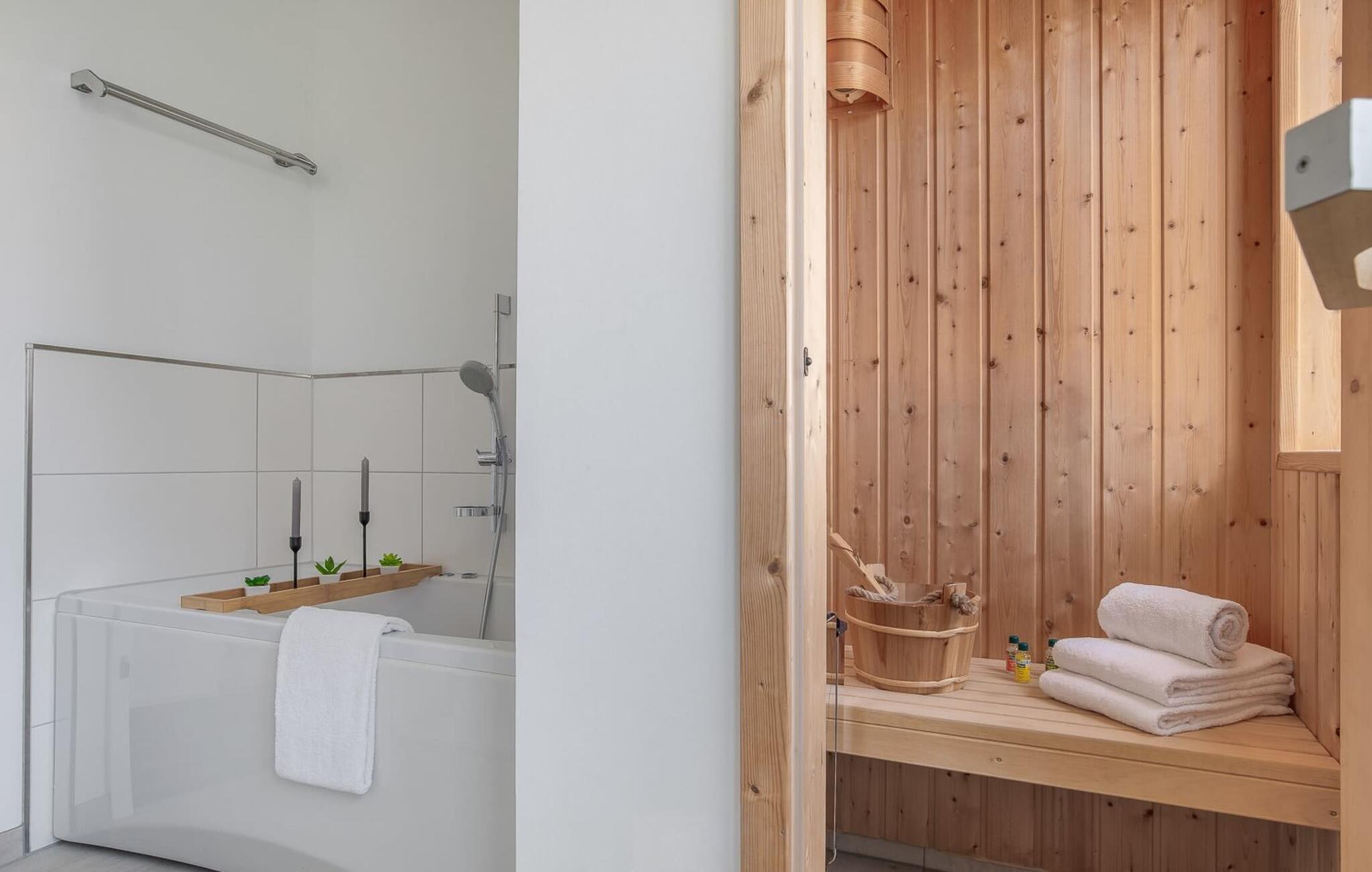 Ebenfalls im ersten Obergeschoss befindet sich das Hauptbadezimmer mit persönlichem Wohlfühlprogramm, Whirlwanne, Sauna mit Wasserblick und Dusche