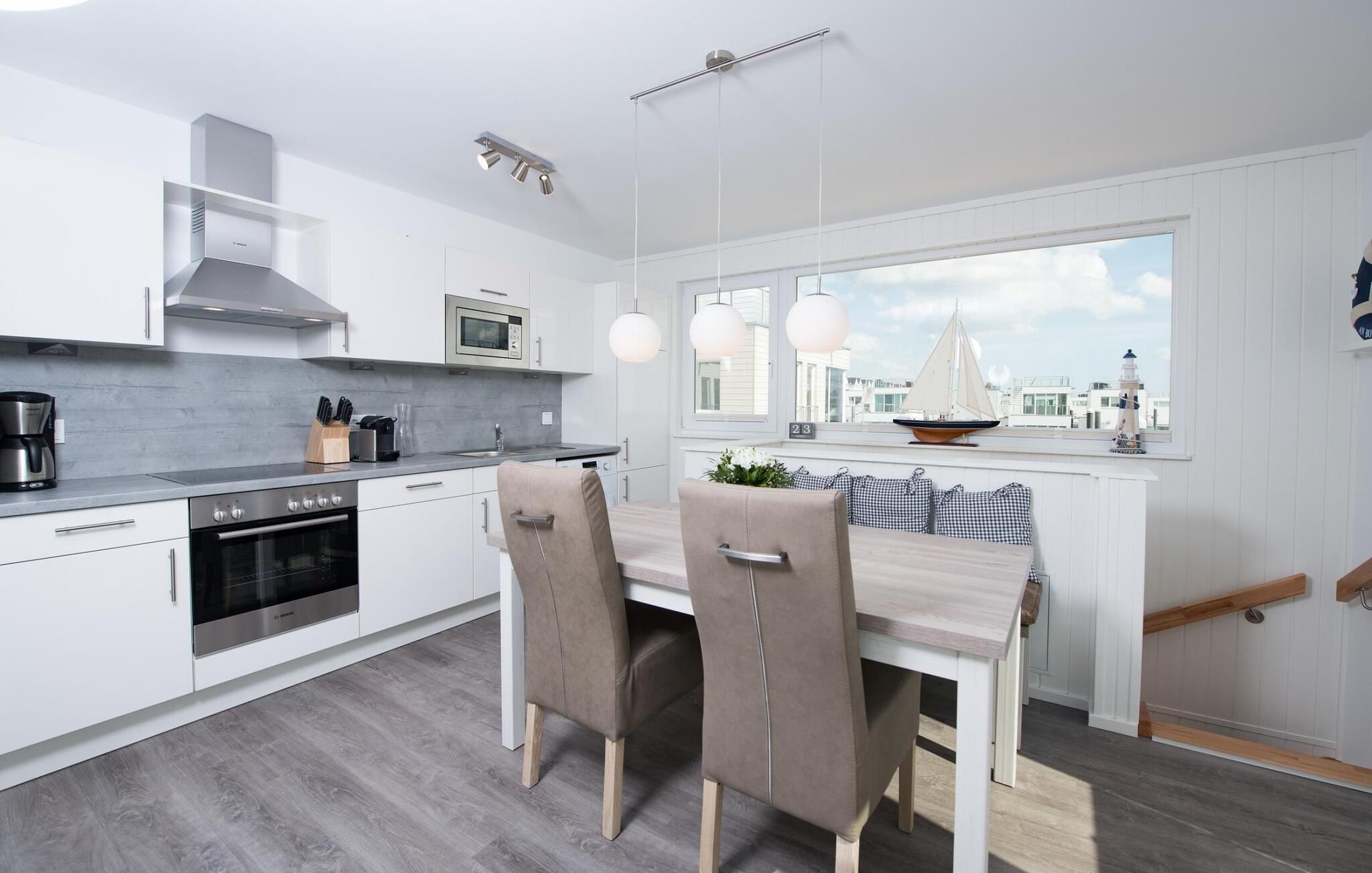 Das schwimmende Haus erstreckt sich über drei Ebenen. Im Obergeschoss befindet sich der offen gestaltete Wohn- und Essbereich mit Rundum-Wasserblick, voll ausgestatteter Wohnküche und angrenzender Terrasse. Von hier aus gelangt man auf die spektakuläre Dachterrasse mit Blick über den Segel- und Sportboothafen, die Schlei und deren Mündung in die Ostsee. Ausgestattet mit hochwertigen Gartenmöbeln und Weber Elektrogrill bieten die Terrassen pures Urlaubsfeeling und atemberaubende Sonnenuntergänge.