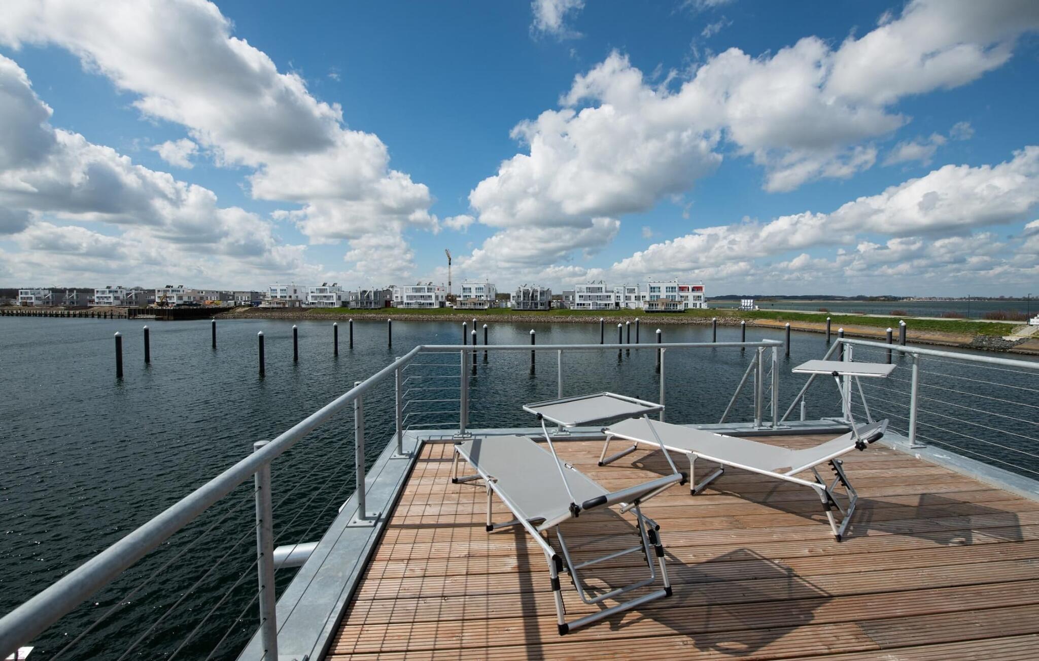 Wasser, wohin das Auge reicht. Durch bodentiefe Panorama-Fensterfronten lässt sich die atemberaubende Kulisse genießen und von der Dachterrasse bieten sich spektakuläre 360-Grad-Ansichten auf Schlei, Ostsee und Marina. Die Ostsee ist nur eine Badeleiter entfernt und der Sandstrand des OstseeResorts zu Fuß zu erreichen. In der dunklen Jahreszeit spenden Fußbodenheizung und Sauna wohligen Komfort, denn an Bord darf das Wellness Programm nicht fehlen. Neben dem Hafenkino sorgt der Smart TV mit Home Entertainment Programm für Unterhaltung.