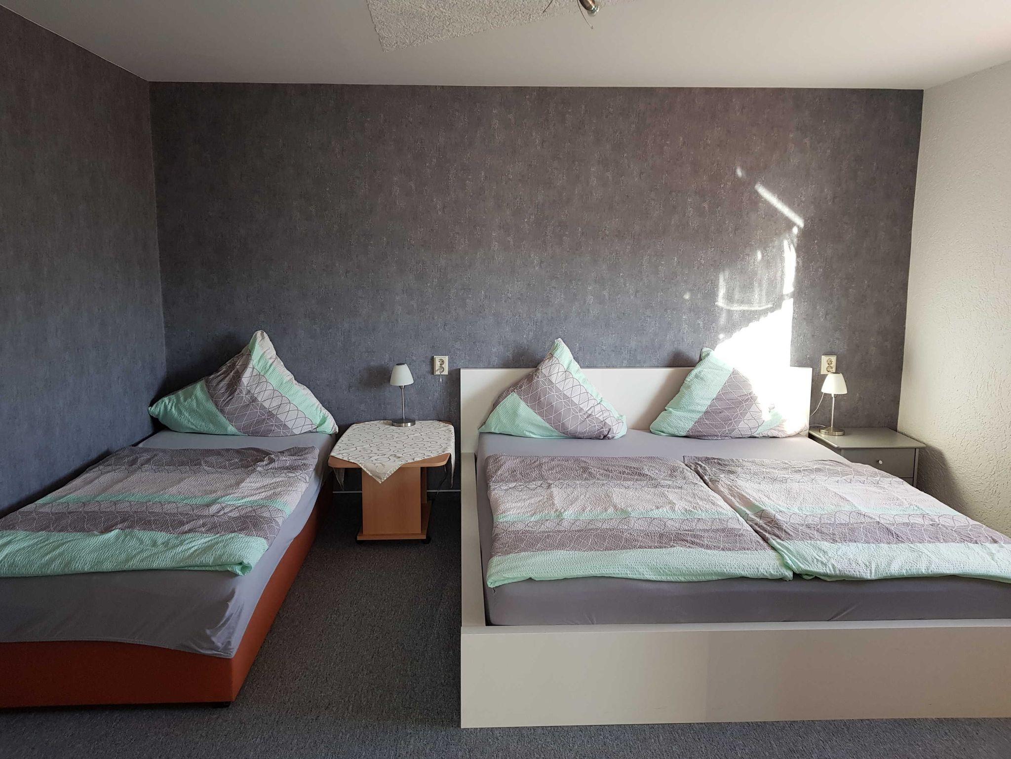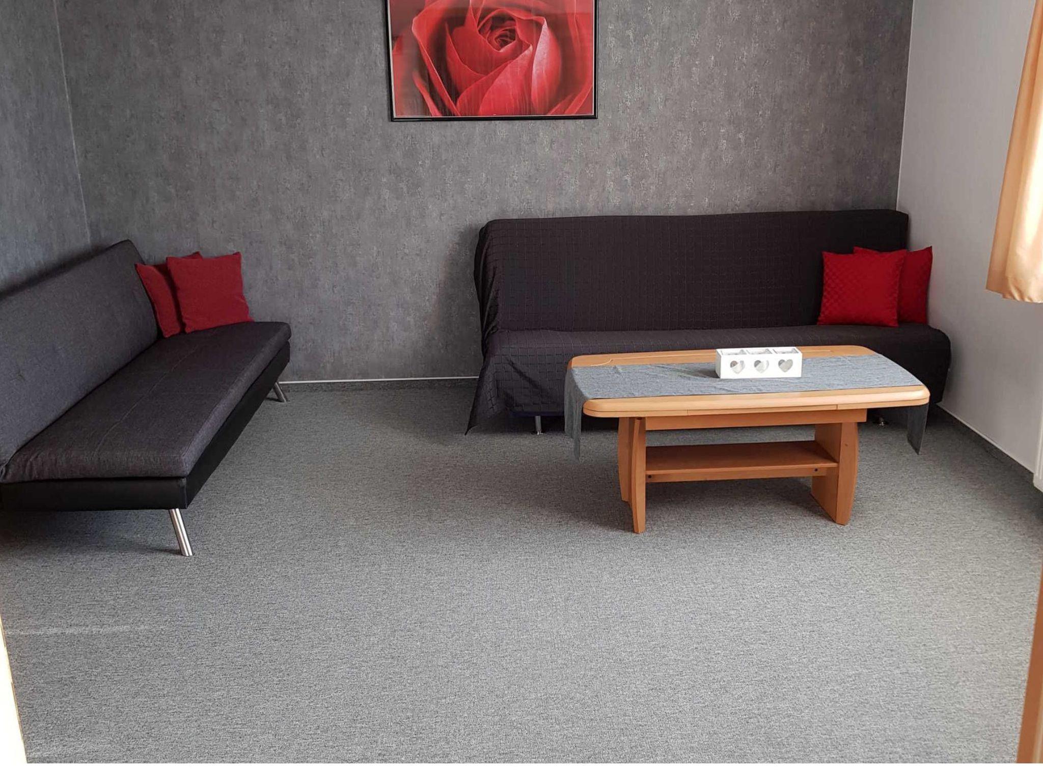 Im ersten Zimmer stehen ein Bett und eine Schlafcouch zur Verfügung, außerdem Kleiderschrank, Tisch und TV - so haben Sie einen gemütlichen Rückzugsbereich zum Entspannen. Das zweite Zimmer ist mit einem Doppelbett und zwei zusätzlichen Schlafliegen ausgestattet und bietet ebenfalls Stauraum sowie einen weiteren TV - praktisch, wenn mehrere Gäste zusammen reisen und jeder seinen Bereich haben möchte.