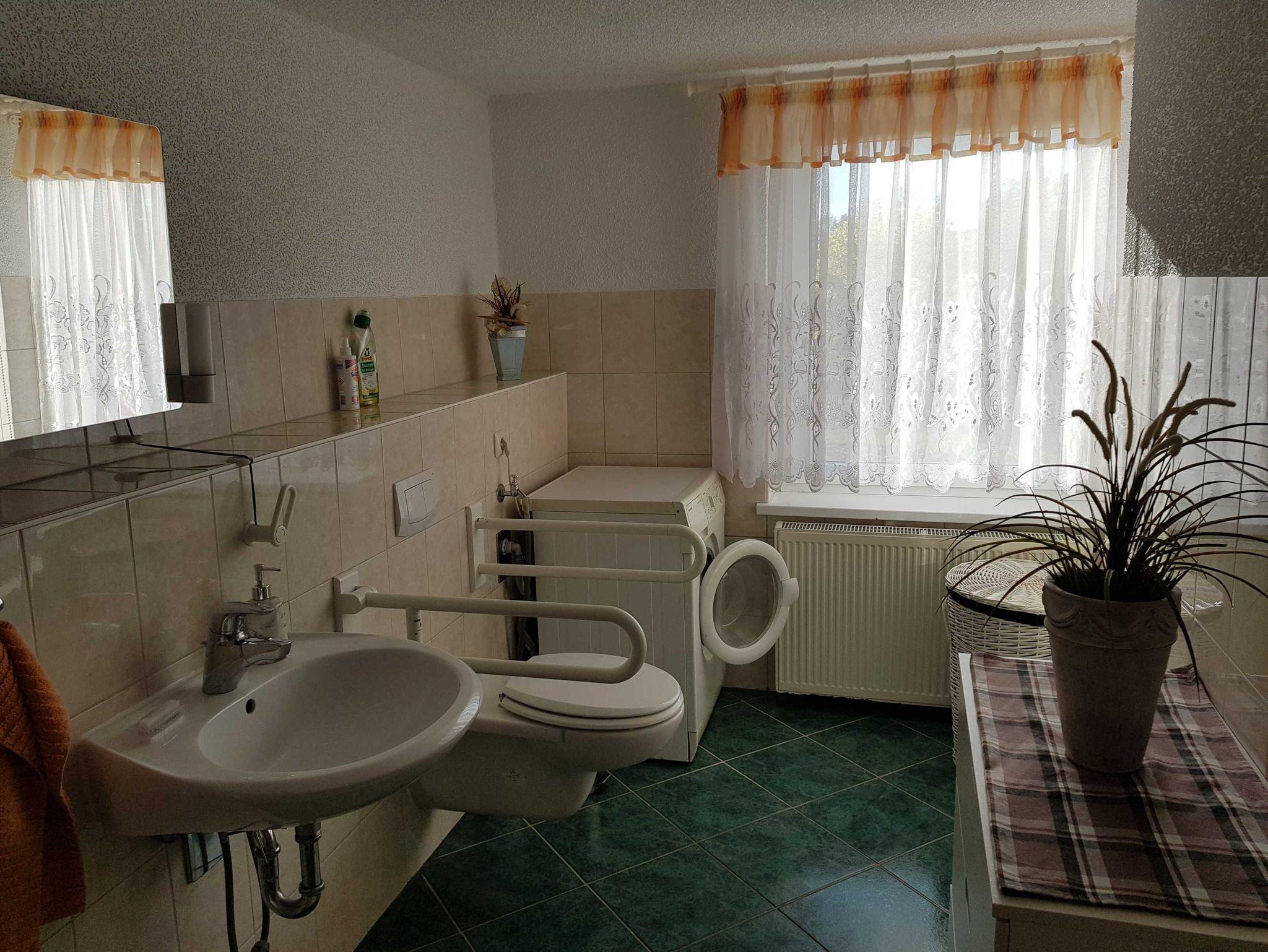 Die große Einbauküche unterstützt die Selbstversorgung unkompliziert und ist mit Herd, Geschirrspüler, Kühlschrank mit Gefrierfach, Mikrowelle, Radio und Sitzecke ausgestattet. Das Bad verfügt über eine ebenerdige Dusche, WC und eine Waschmaschine. Auch der geräumige Flur ist nutzbar und bietet zusätzlich einen Tisch mit Stühlen.