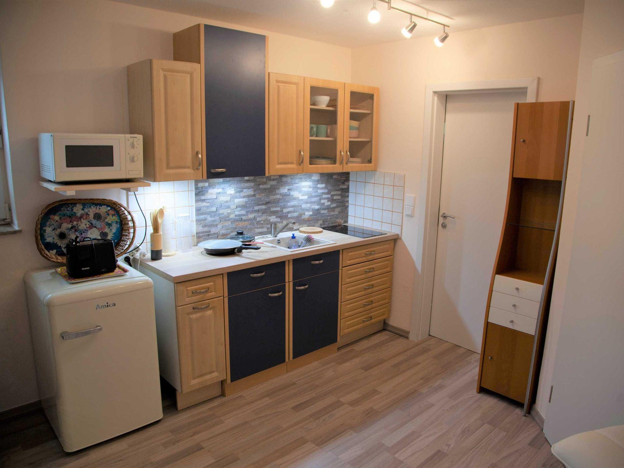 Die ruhige, moderne 2-Raum-Nichtraucherferienwohnung ist für bis zu 3 Personen geeignet. Sie verfügt über ein Wohnzimmer mit gemütlicher Couch (Aufbettungsmöglichkeit 3. Person), LED-Flat-TV, CD/DVD_Player, Radio und einem Hochtisch mit 3 Barstühlen als Essgelegenheit. Die offene Küche ist mit einem zweiflammigen Ceranfeld, Kühlschrank mit Tiefkühlfach, Kaffeemaschine, Wasserkocher, Mikrowelle und Toaster ausgestattet. Das separate Schlafzimmer erwartet Sie mit einem Doppelbett und einem großen Kleiderschrank für Ihre Urlaubsgarderobe. Das moderne Badezimmer ist mit Dusche/WC, Waschtisch und Haartrockner ausgestattet. Auf dem Grundstück steht Ihnen eine sonnige Terrasse mit eigenem Strandkorb, Gasgrill und Sonnenschirm zur Verfügung, um gemütliche Abende zu verbringen. WLAN ist kostenfrei vorhanden.