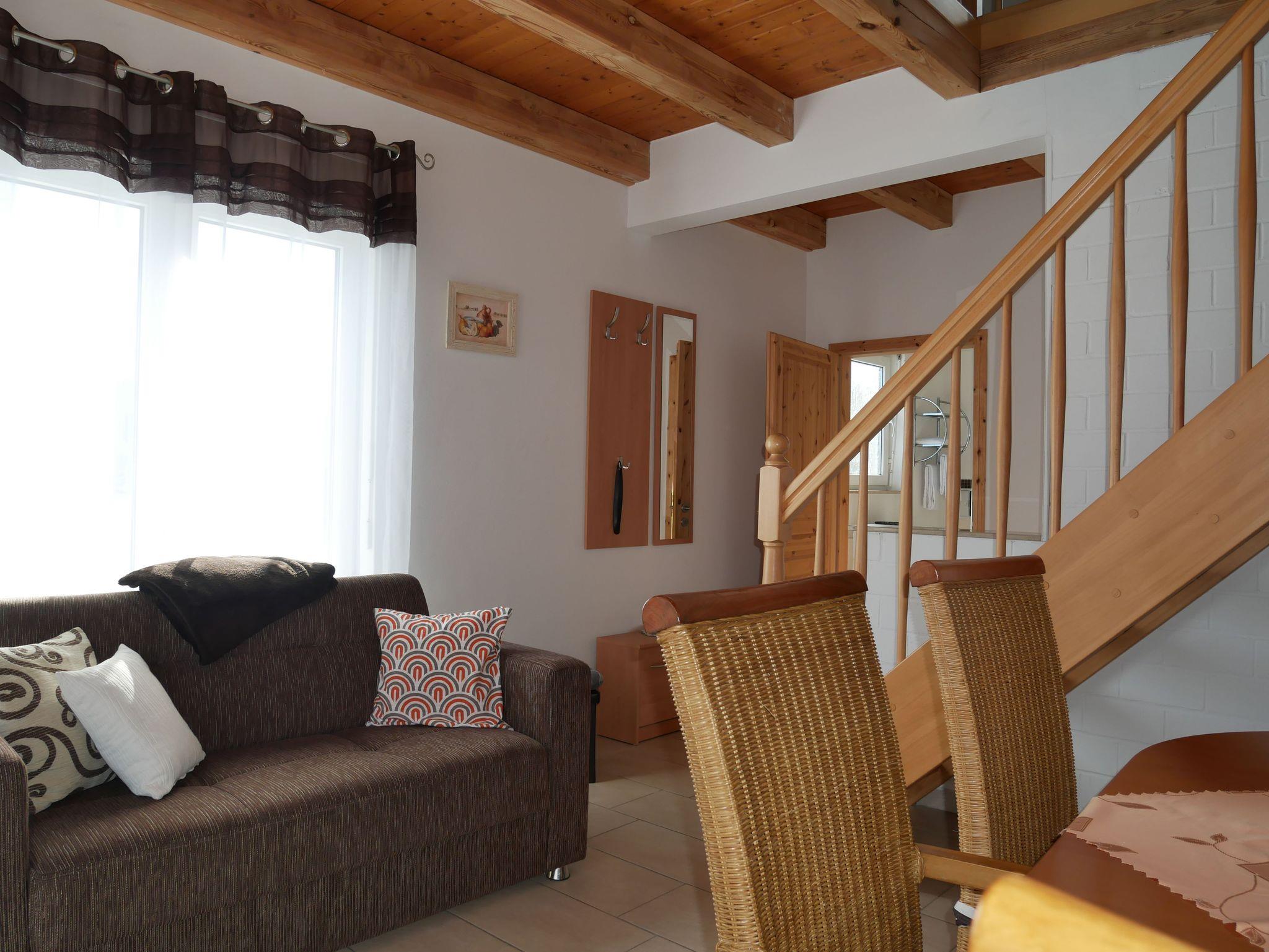 In das Obergeschoss gelangt man über eine offene Buchentreppe. Diese Etage ist offen gestaltet und in einen optisch abgetrennten Schlafbereich mit 2 Einzelbetten und einem großzügigen Wohnbereich mit Flat-TV und Schlafcouch (Aufbettungsmöglichkeit für die 5. Person) aufgeteilt.