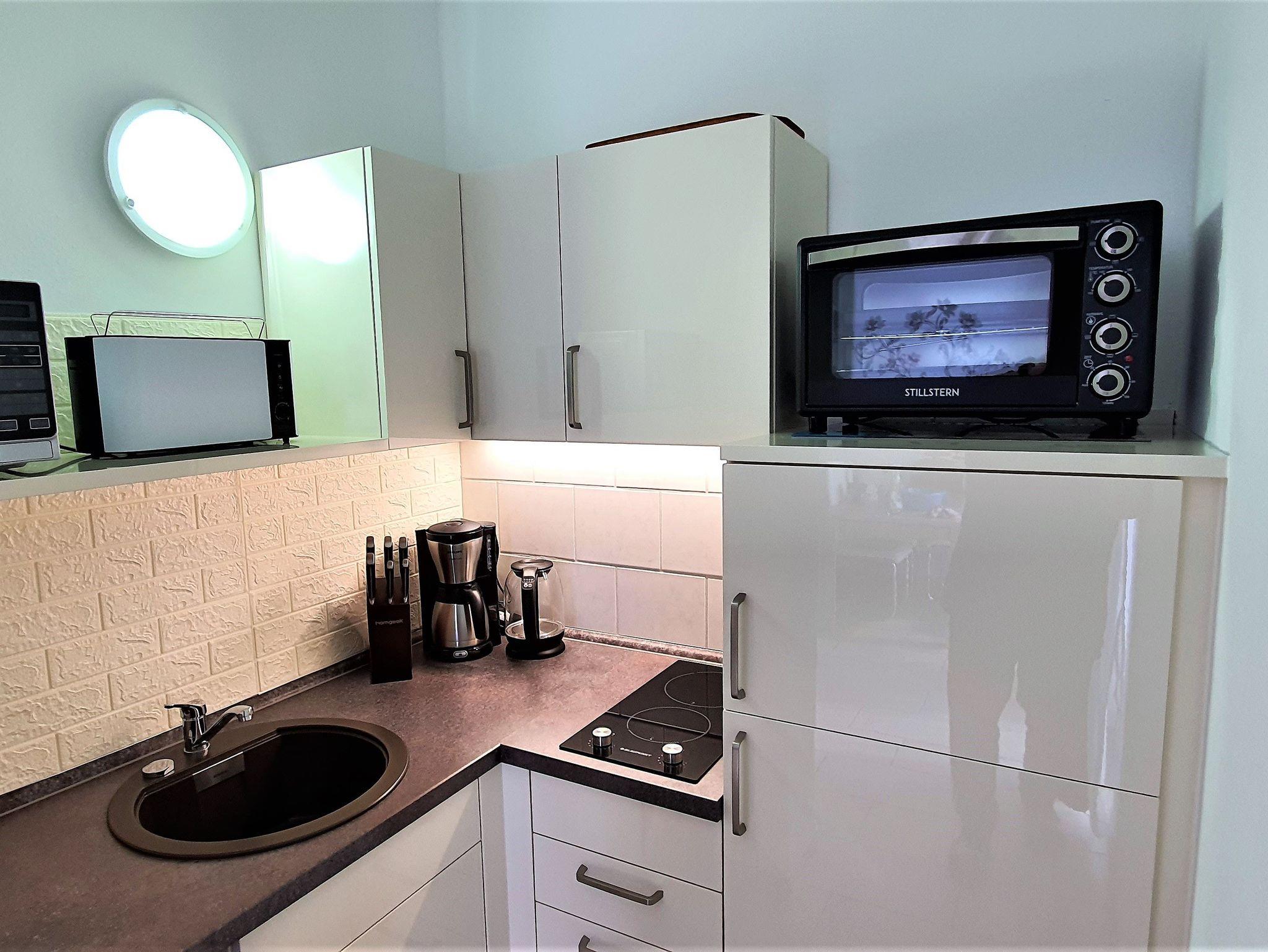 Voll ausgestattete Einbauküche mit Geschirrspüler, Kühlschrank, Herd, Mikrowelle u.v.m.