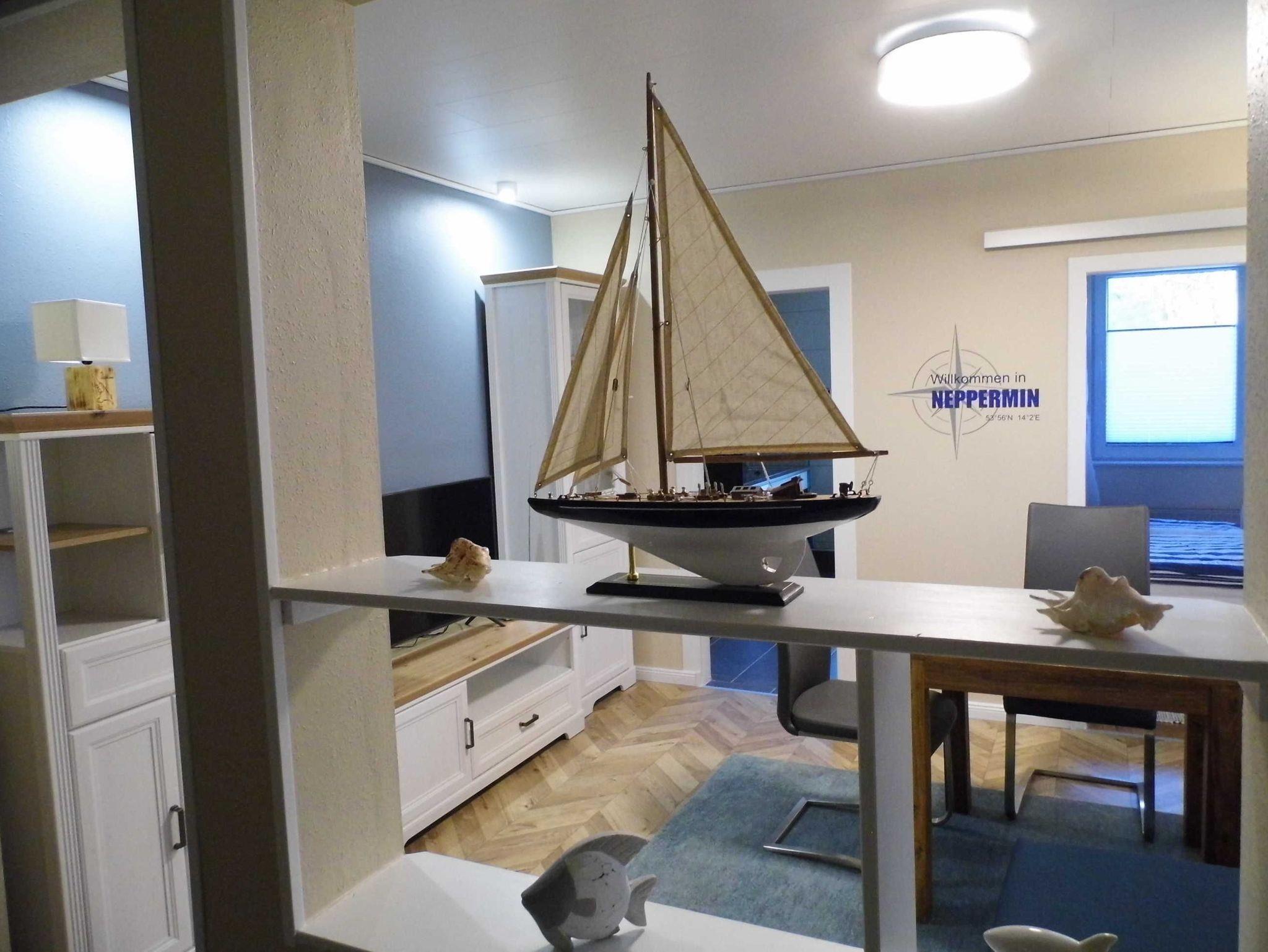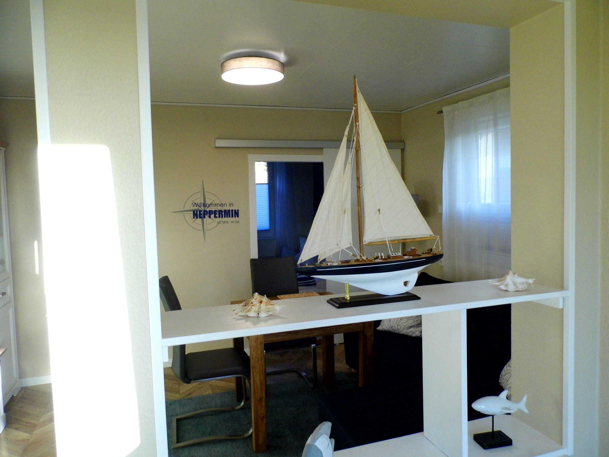 Gemütliche Ferienwohnung mit Seeblick am Nepperminer See, ideal für zwei Personen mit privatem Seezugang und Ruderboot.