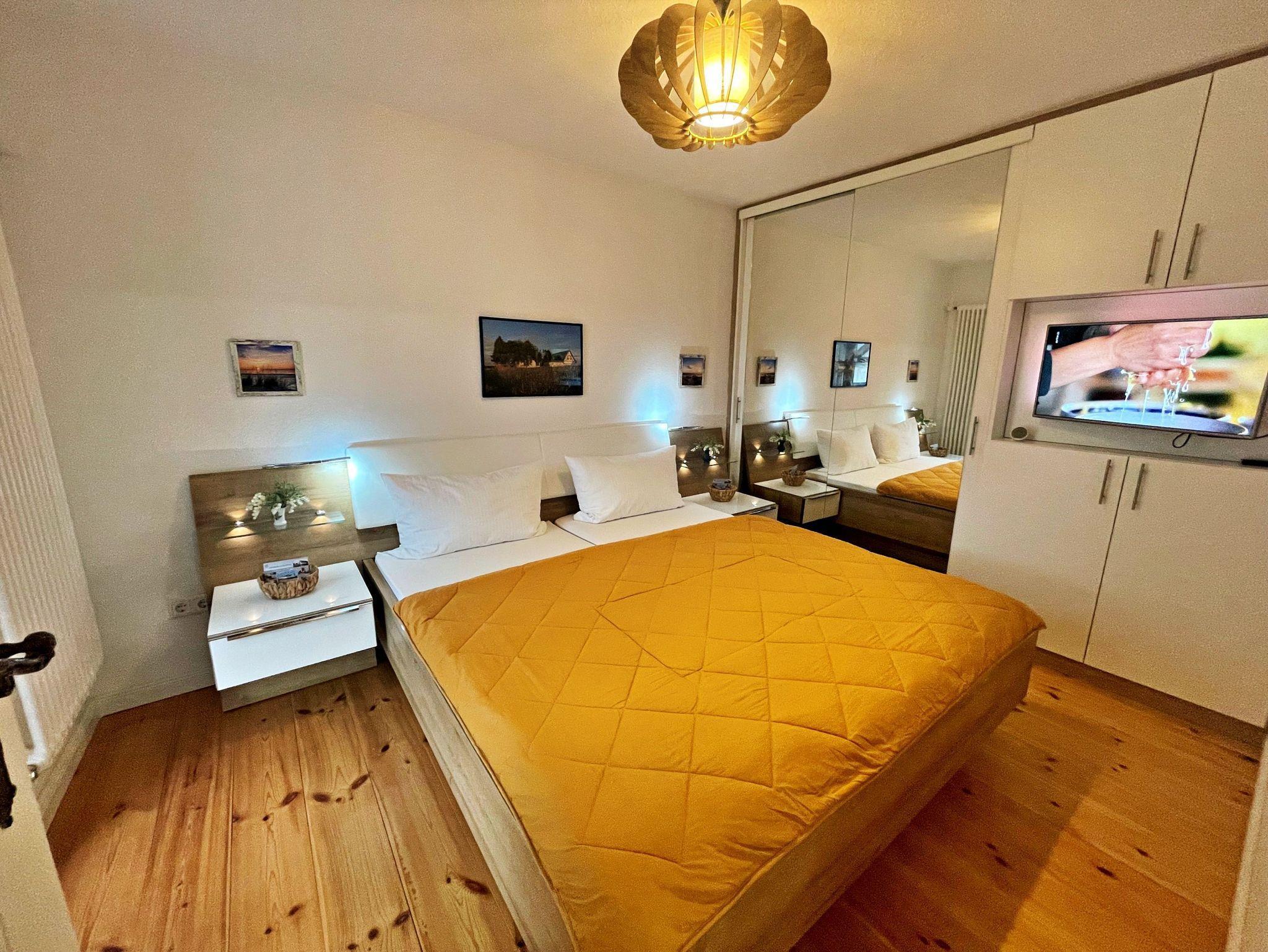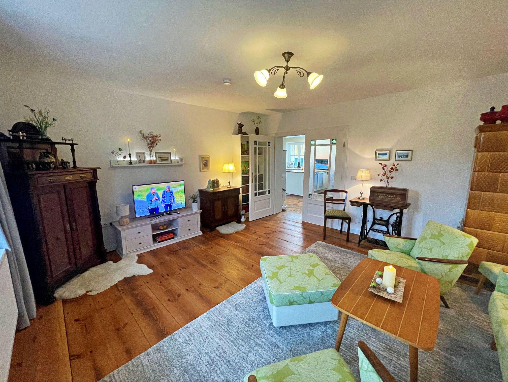 Herzlich willkommen in dieser charmanten Doppelhaushälfte! Die ca. 70 qm große Unterkunft bietet Platz für maximal 2 Personen und befindet sich auf einem großzügigen 2000 qm großen Grundstück, das Ihnen zur alleinigen Nutzung zur Verfügung steht. Das ehemalige Bauernhaus aus dem 19. Jahrhundert wurde im Jahr 2021 liebevoll kernsaniert und hochwertig ausgestattet, um Ihnen einen komfortablen Aufenthalt zu ermöglichen. Die Ferienwohnung verfügt über ein separates Schlafzimmer, ein gemütliches Wohnzimmer, eine voll ausgestattete Küche sowie ein Badezimmer mit Dusche, Badewanne und WC. Über den Flur gelangen Sie direkt in die einladende Küche, die mit einem großen Essplatz, einem Kamin und einem Fernseher ausgestattet ist. Von hier aus haben Sie Zugang zu den weiteren Räumen. Das großzügige Wohnzimmer lädt mit einer behaglichen Sitzecke und einem Kachelofen zum Entspannen ein. Das Schlafzimmer bietet Ihnen nicht nur ein komfortables Doppelbett und einen großen Kleiderschrank, sondern auch einen direkten Zugang zur Terrasse und zum Garten. Im Badezimmer finden Sie eine Waschmaschine, eine Dusche und eine Badewanne - ideal für entspannte Momente. Genießen Sie die überdachte und möblierte Terrasse, nutzen Sie die Grillmöglichkeiten oder parken Sie bequem auf dem bereitgestellten Parkplatz. WLAN steht Ihnen ebenfalls zur Verfügung. Für Ihre Erkundungstouren in der Umgebung stehen zwei Fahrräder kostenfrei zur Verfügung. Die Erstausstattung mit Bettwäsche und Handtüchern ist selbstverständlich ebenfalls kostenfrei.