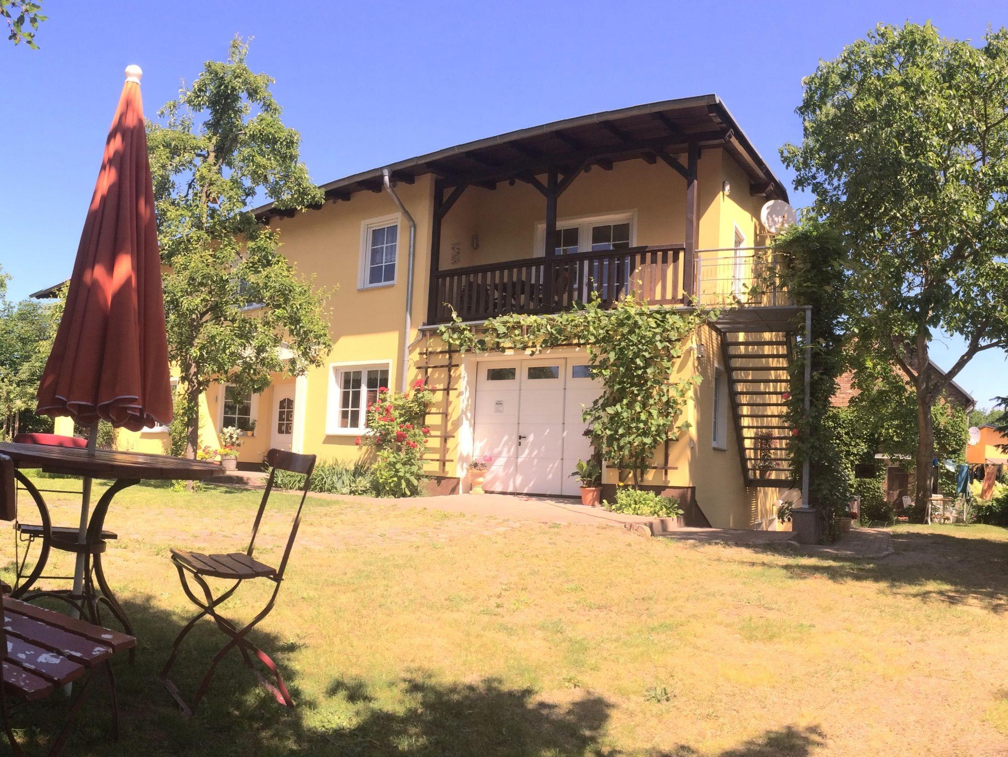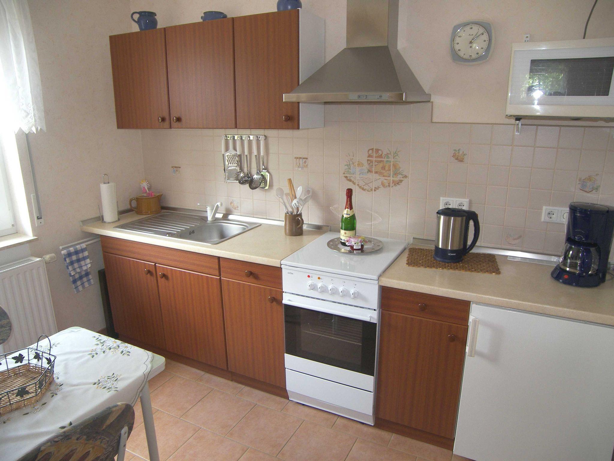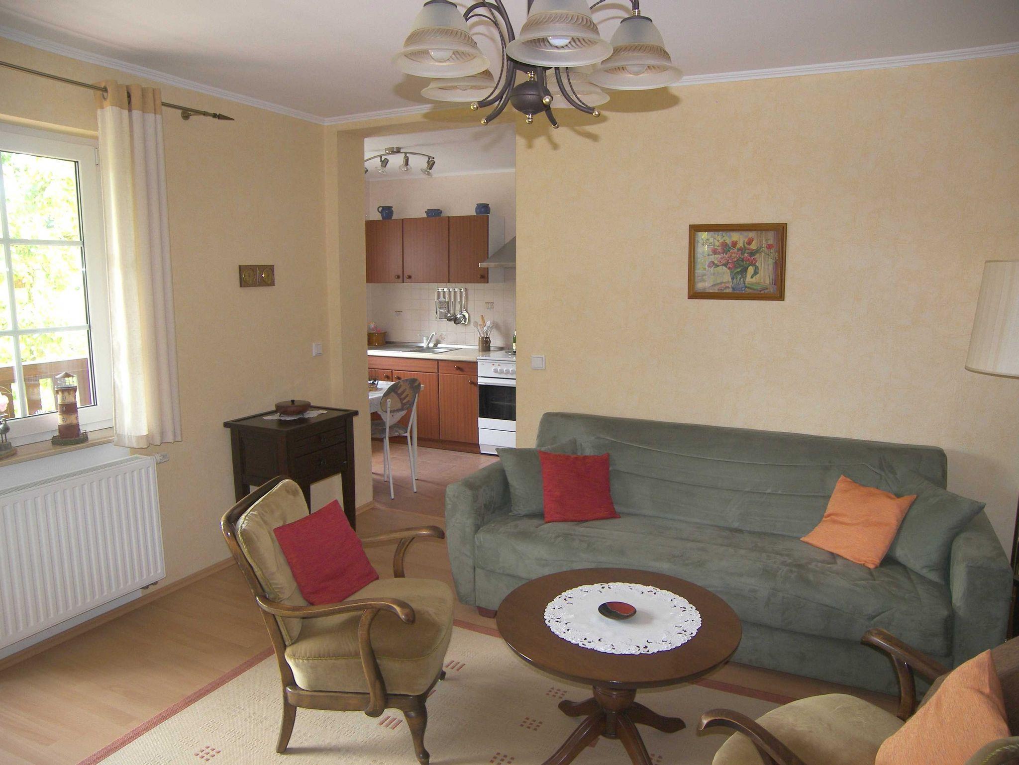 Die modern und gemütlich eingerichtete Nichtraucher-Ferienwohnung befindet sich im 1. Obergeschoss eines Wohnhauses. Die Ferienwohnung erreichen Sie über eine separate Außen Treppe. Sie verfügt über ein großes Wohnzimmer mit Couchsitzgruppe (Couch ist ausziehbar 140x200 für 1 Erw.), Esstisch mit 3 Stühlen, TV, Radio und CD-Player. Eine separate komfortable Küche mit 4-Platten-Herd mit Backofen, Mikrowelle u. Kühlschrank ist ebenfalls vorhanden. Die Wohnung verfügt über ein großzügiges Schlafzimmer mit Doppelbett und Kleiderschrank. Das Tageslichtbad ist mit Dusche und WC ausgestattet. Vor dem Eingang ist ein möblierter Balkon mit einer Sitzgelegenheit für zwei Personen, weiterhin ist im Garten eine Sitzecke nutzbar und auch grillen ist möglich. Die Erstausstattung Bettwäsche und Handtücher, W-Lan und ein Parkplatz auf dem abgeschlossenen Grundstück sind im Preis inklusive. Haustiere sind nicht erlaubt. Auf Anfrage kann ein Kinderbett und ein Hochstuhl kostenfrei zur Verfügung gestellt werden. Es können beim Vermieter 3 Fahrräder kostenfrei ausgeliehen werden.