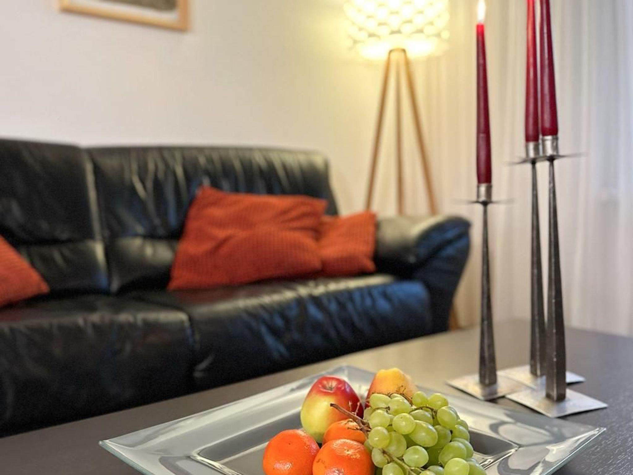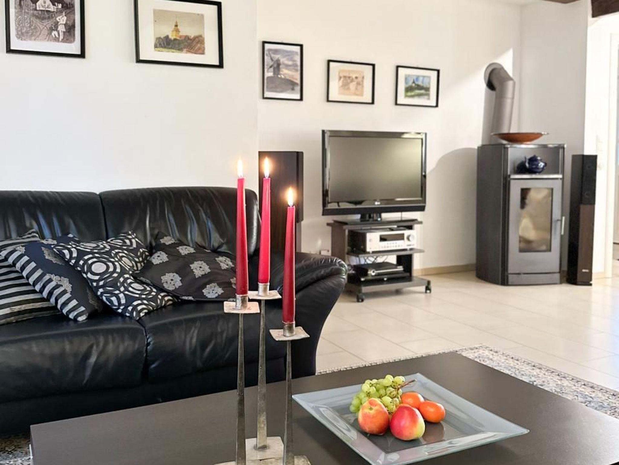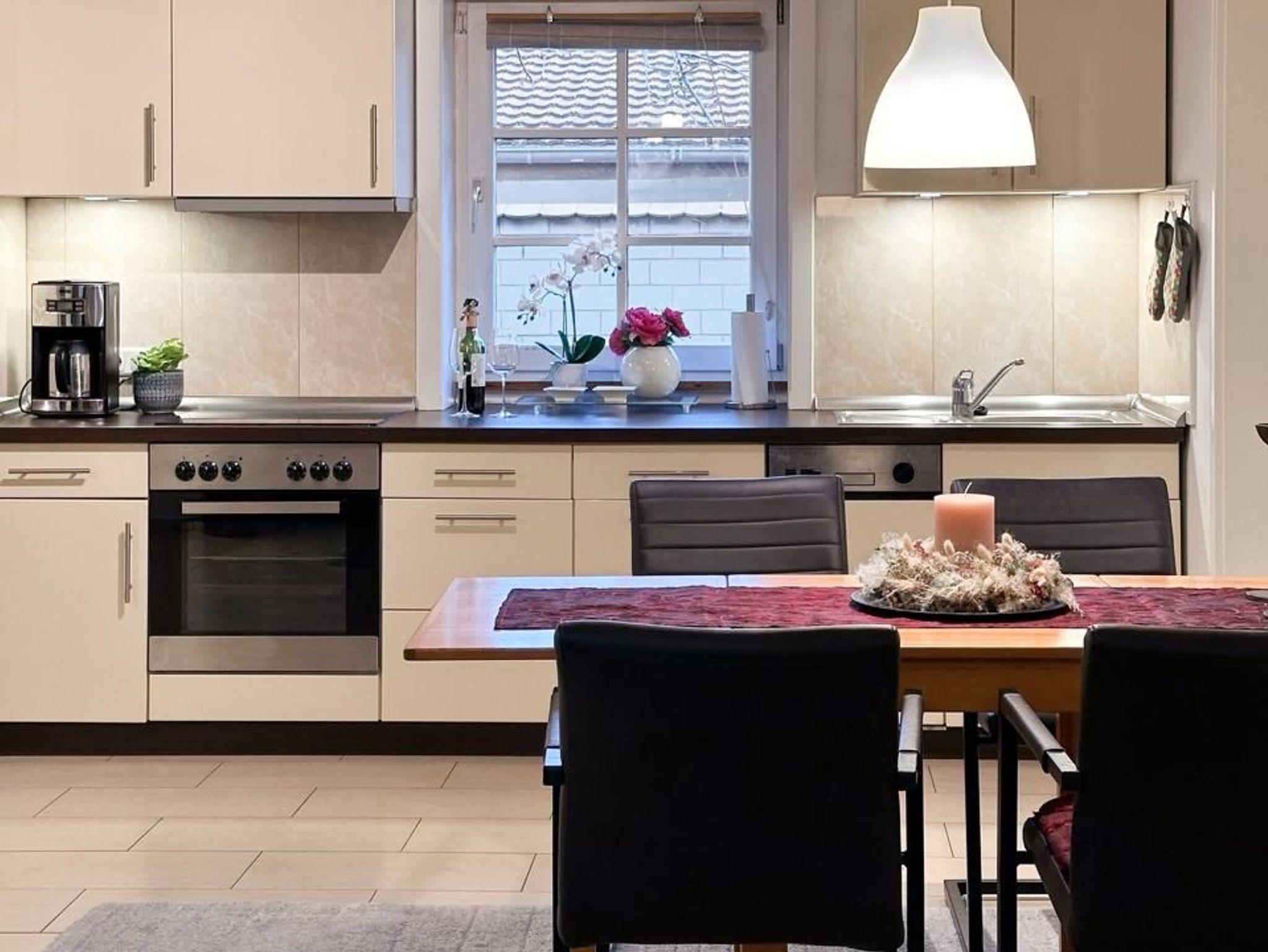 Im großzügigen Wohnbereich mit Einbauküche finden Sie einen gepflegten Essbereich für 4 Personen sowie einem gemütlichen Wohnbereich, der mit seiner Ledercouch, TV, Stereoanlage und Kaminofen zu gemütlichen Stunden, auch in der kälteren Jahreszeit, einlädt. Die Küche ist mit Herd und Backofen, Spülmaschine, Kühlschrank, Kaffeemaschine, Toaster, Wasserkocher, um nur Einiges zu nennen, ausgestattet.
