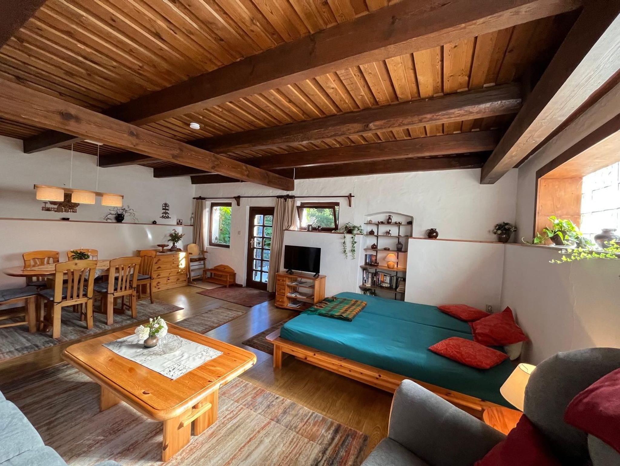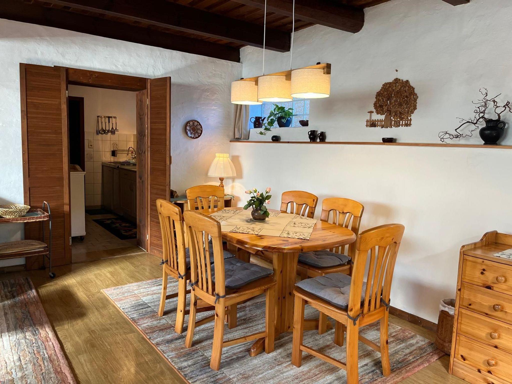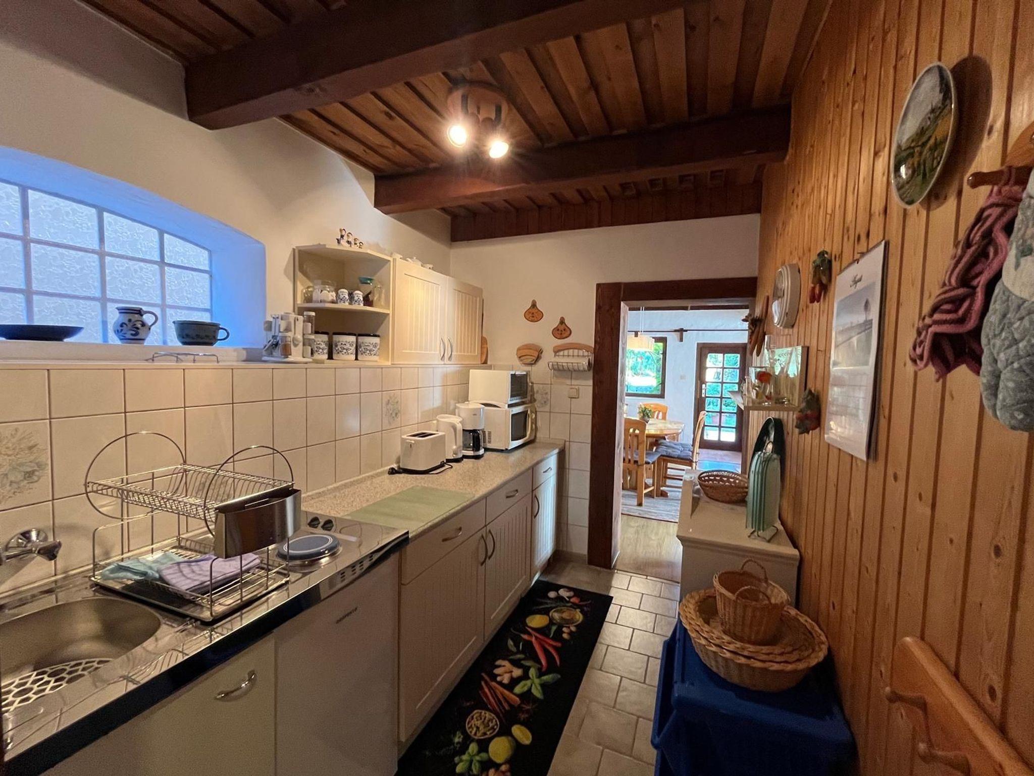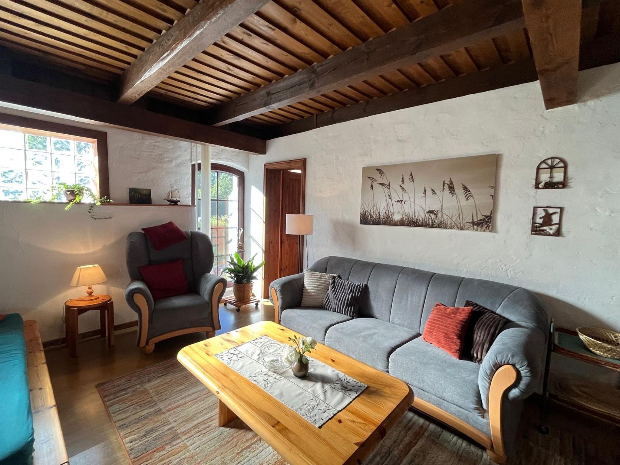 Die rustikal eingerichtete Ferienwohnung überzeugt durch ihren gemütlichen Landhausstil mit sichtbarer Holzbalkendecke. Es handelt sich um eine ebenerdige Nichtraucherwohnung (nicht rollstuhlgerecht), in der ein Laminatboden verlegt ist; Teppiche sorgen zusätzlich für eine warme und behagliche Atmosphäre.