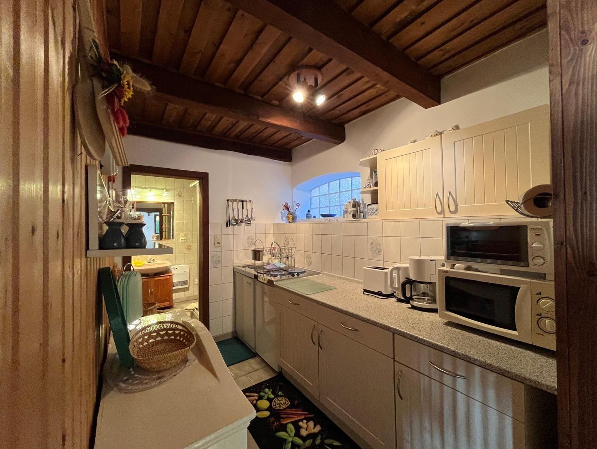 Da die Wohnung nur in den Sommermonaten vermietet wird, ist keine feste Heizung vorhanden. Das Bad mit Dusche und WC kann bei Bedarf jedoch mit einer mobilen Heizung temperiert werden.