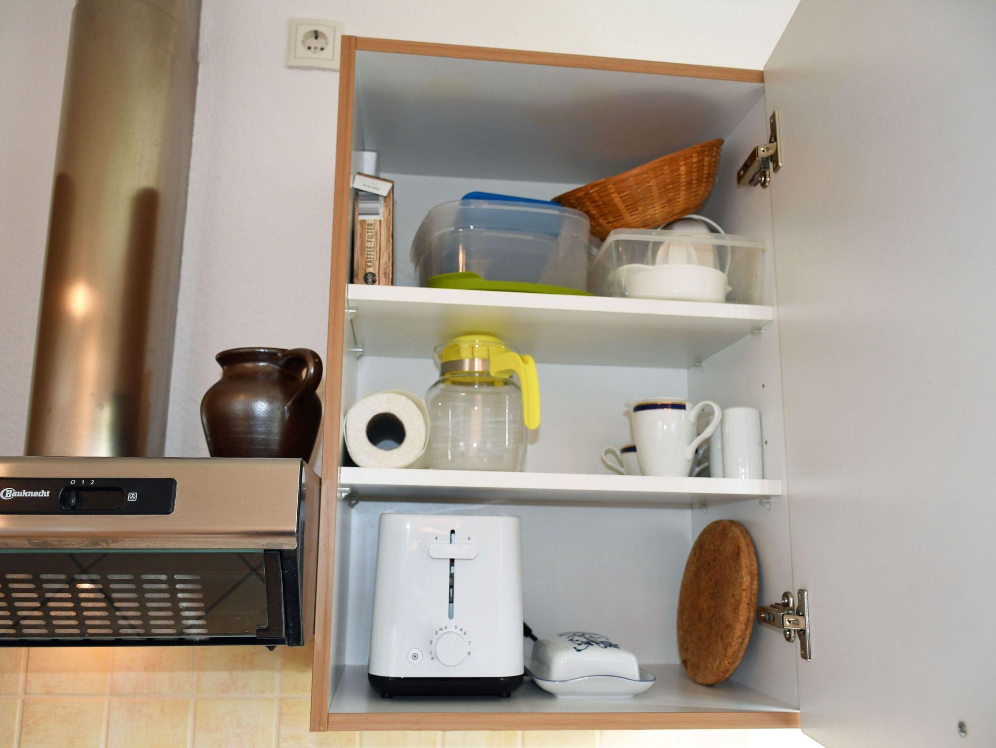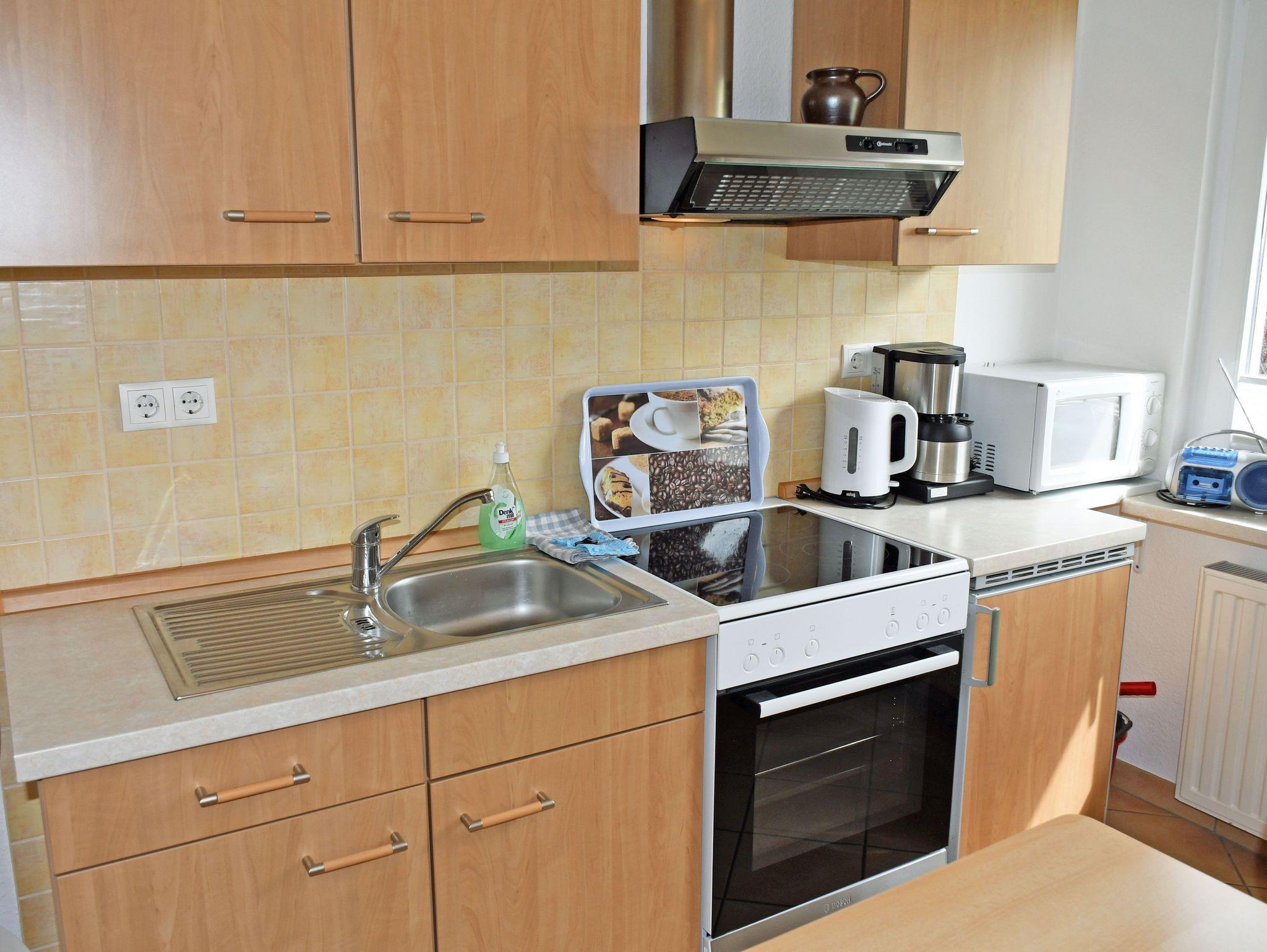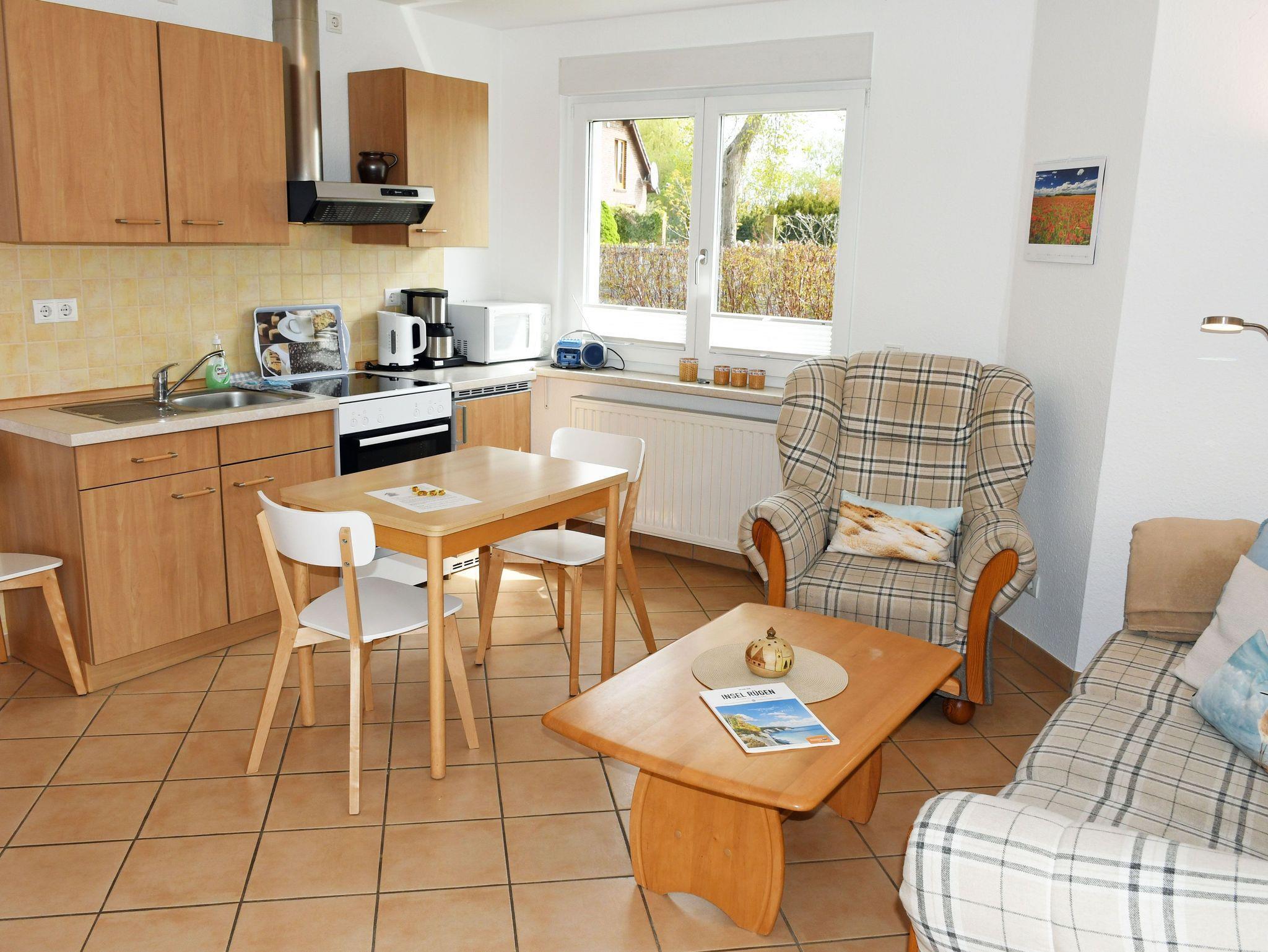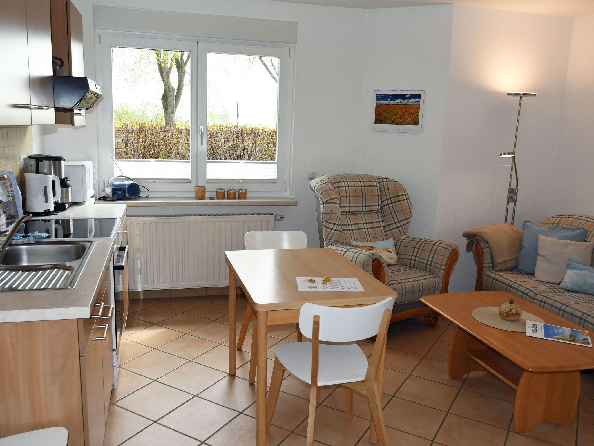 o einen Wohnbereich mit heller Wohnküche und Esstisch für 4 Personen, Ofen, Kochfeld, Kühlschrank mit Gefrierfach, Mikrowelle, Kaffeemaschine, Wasserkocher, Toaster, SAT-TV