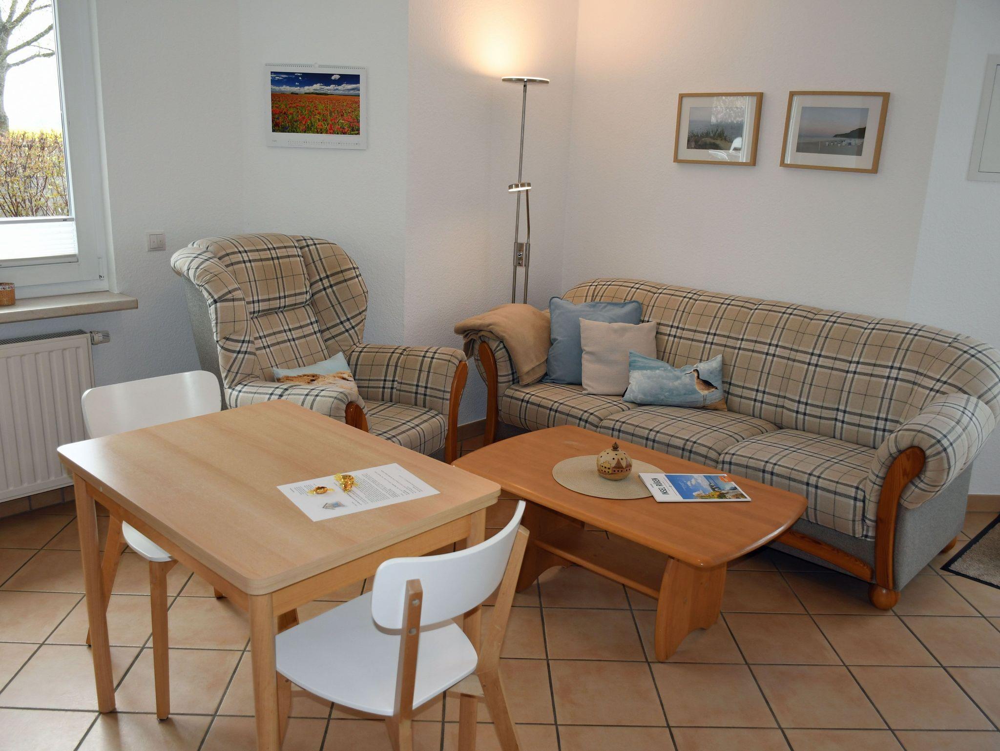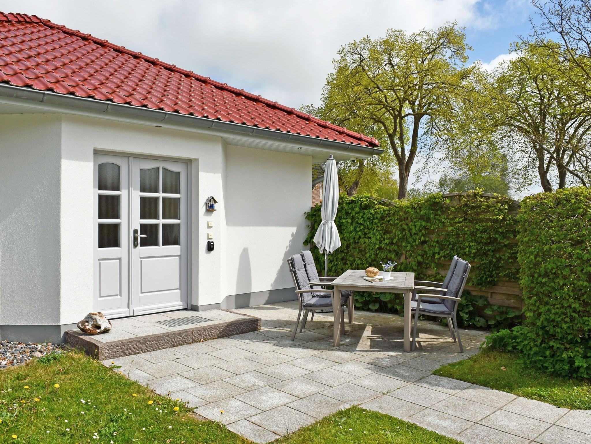 Moderne 2-Raum-Ferienwohnung mit Terrasse und Gartenmöbeln im Zentrum von Rügen für entspannte Urlaubstage.