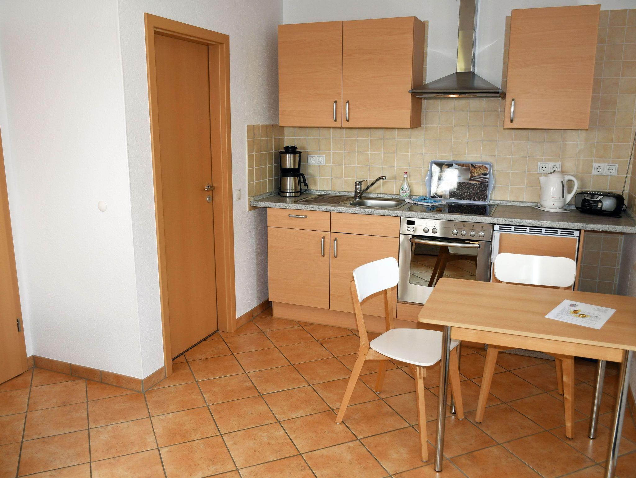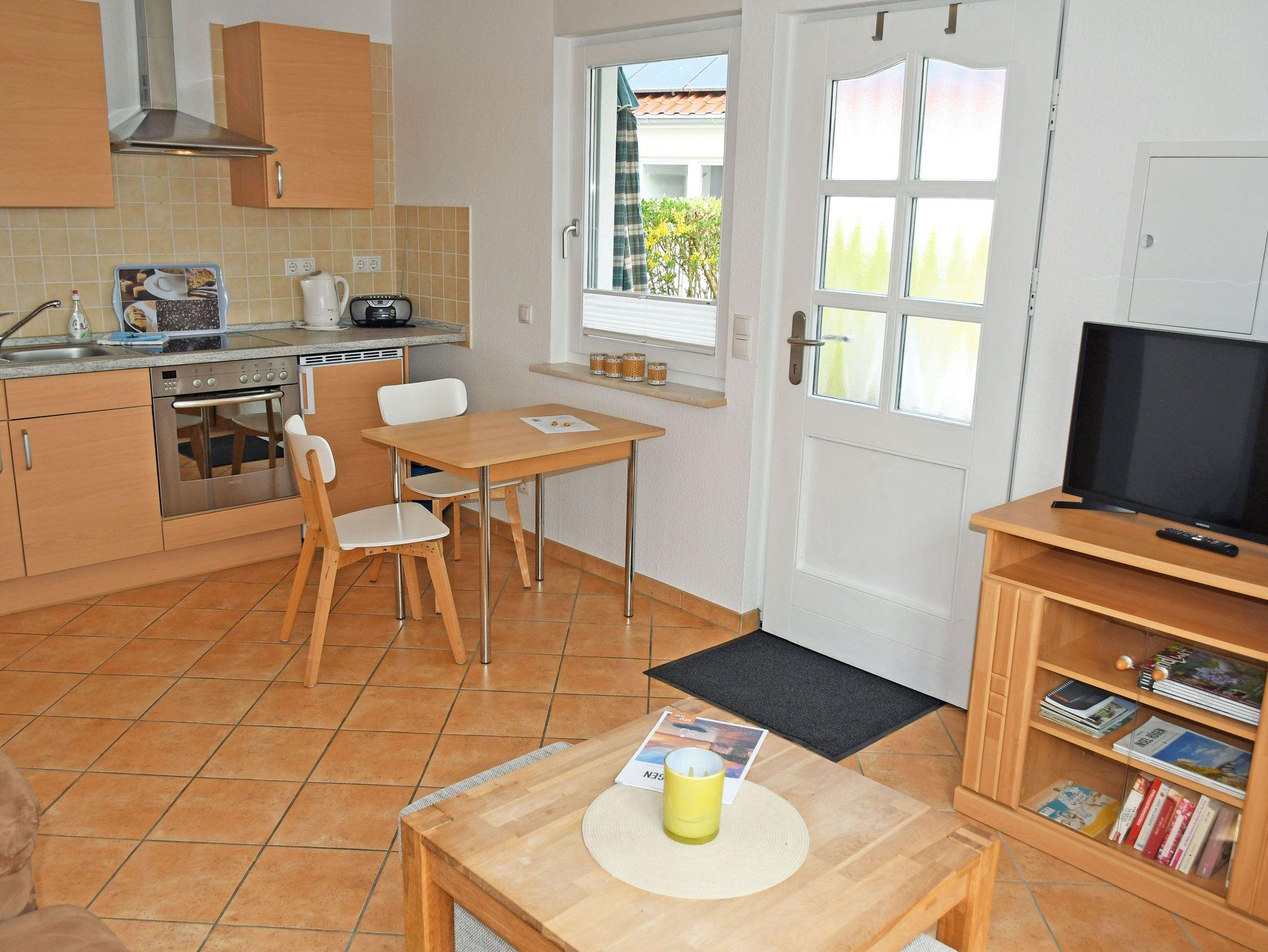 o einen Wohnbereich mit heller Wohnküche und Esstisch für 2, Ofen, Kochfeld, Kühlschrank mit Gefrierfach, Kaffeemaschine, Wasserkocher, Toaster, SAT-TV
