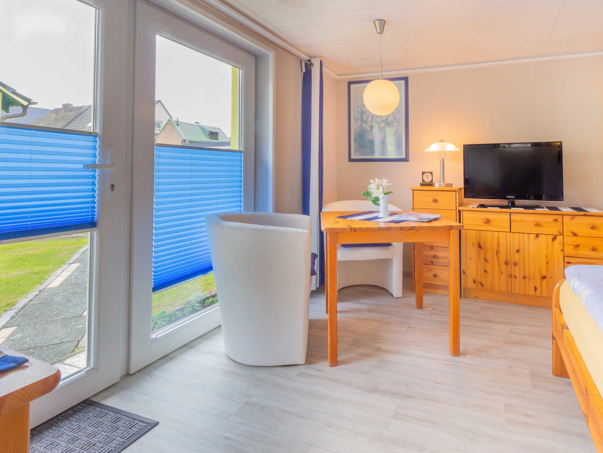 • ein kombiniertes Wohn-/ Schlafzimmer mit einem Doppelbett, Essplatz, Radio, SAT-TV sowie Heizung