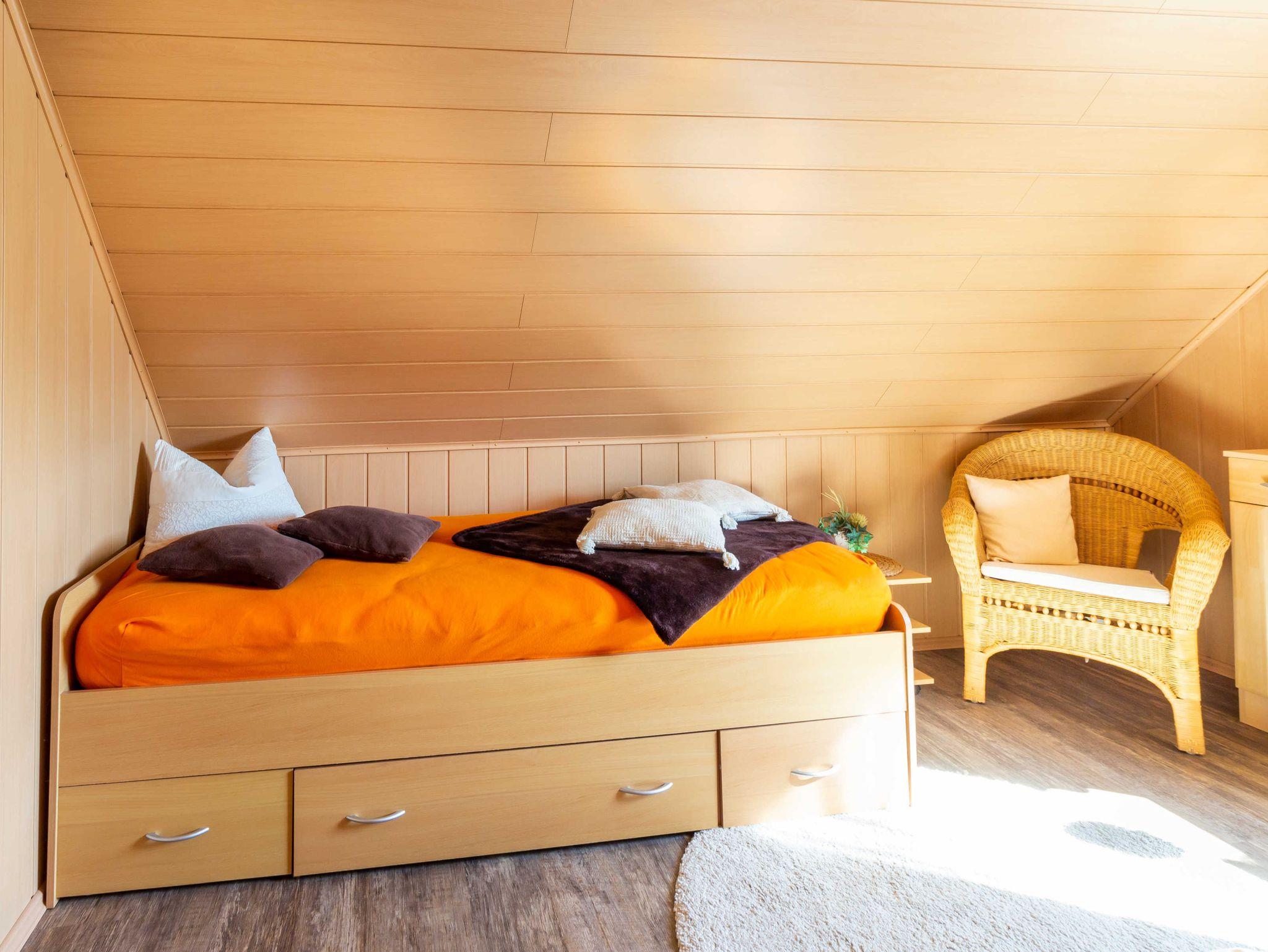 • ein Schlafraum mit einem Doppelbett (180x200 cm) in der 1. Etage (Dachschrägen)