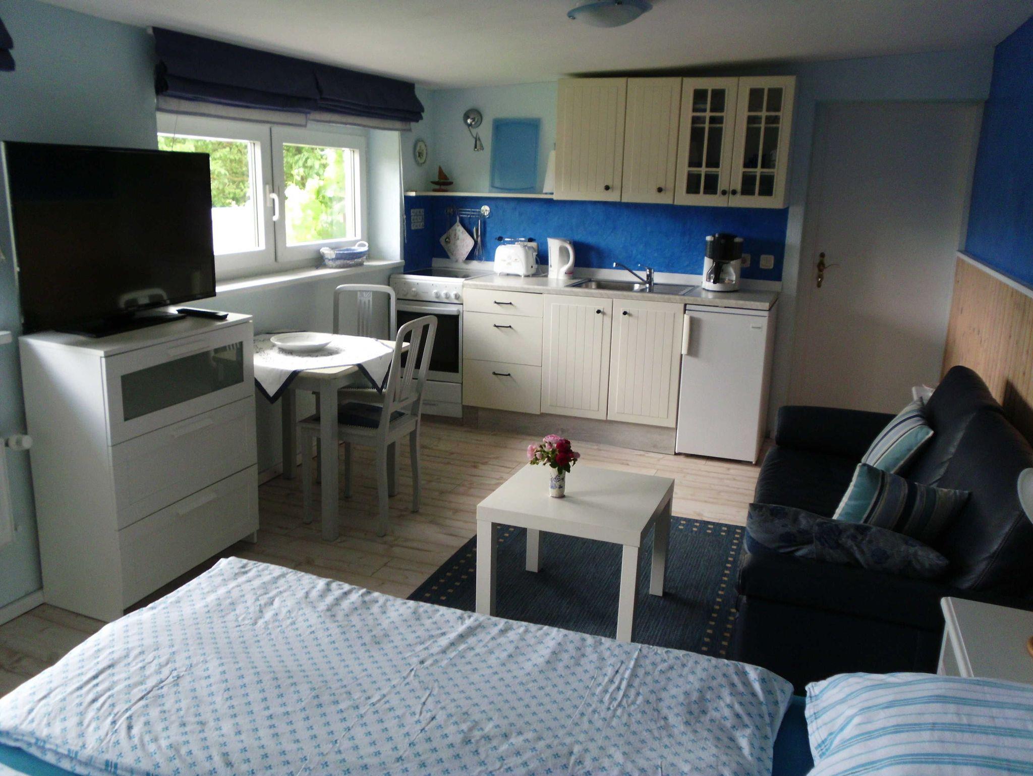 Zur Ausstattung gehören ein kombinierter Wohn- und Schlafraum mit Küche und Essecke sowie ein kleines Duschbad.