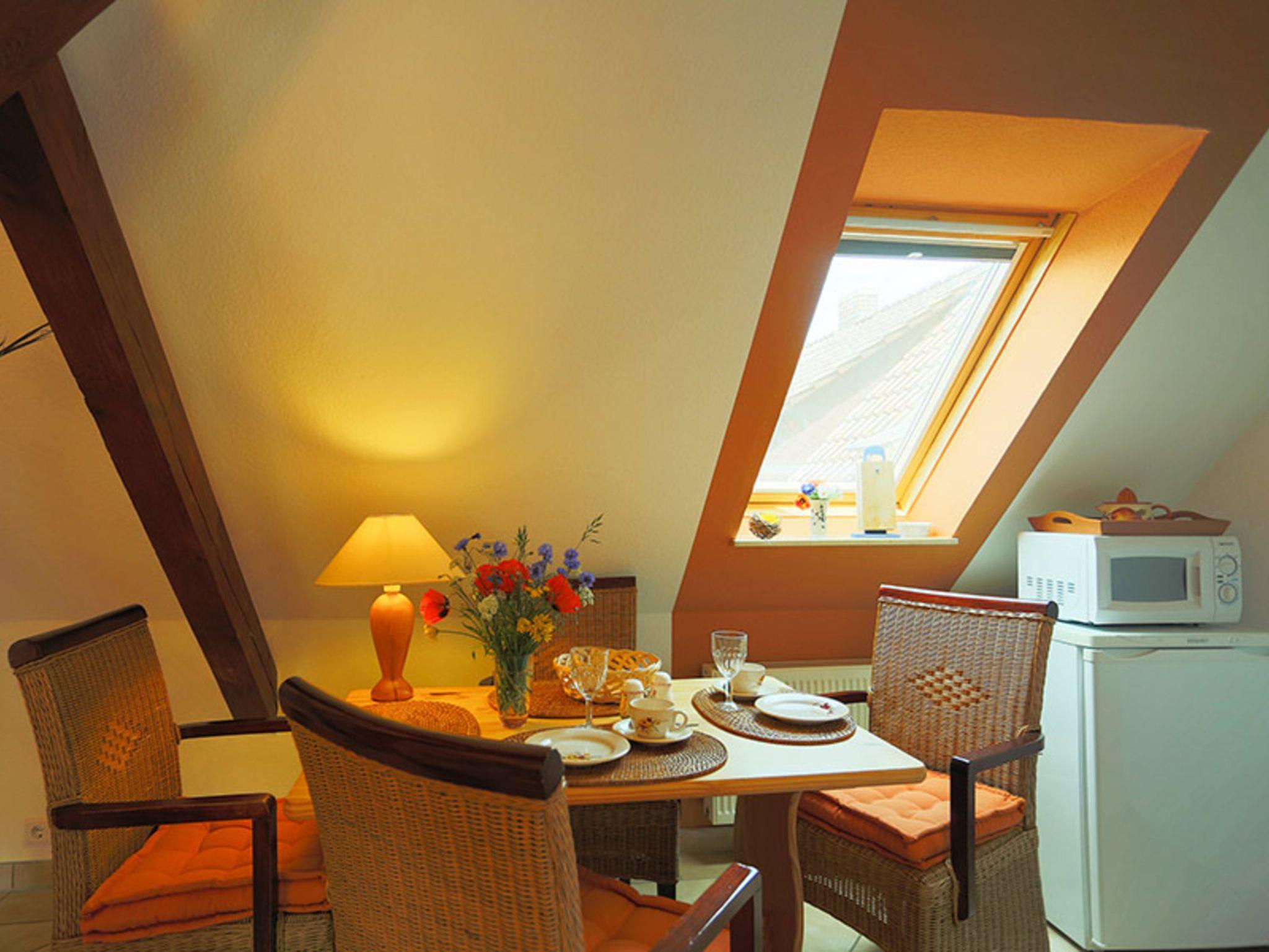 Unsere gemütlichen 2-Raum-Ferienwohnungen befinden sich im Dachgeschoss. Sie haben ein separates Schlafzimmer, einen offenen Wohn- und Küchenbereich und Dusche/WC. Zur Ausstattung zählen in unseren Ferienwohnungen moderne HD-TV-Geräte mit Kabel-TV-Anschluss. Im Schlafzimmer steht ein Doppelbett. Die Küche ist mit Kühlschrank, Cerankochfeld (ohne Backofen) und Geschirrspüler ausgestattet. Kaffemaschine, Wasserkocher und Toaster sind ebenso selbstverständlich wie ausreichend Geschirr und Besteck. Bettwäsche und Handtücher sind im Preis enthalten.