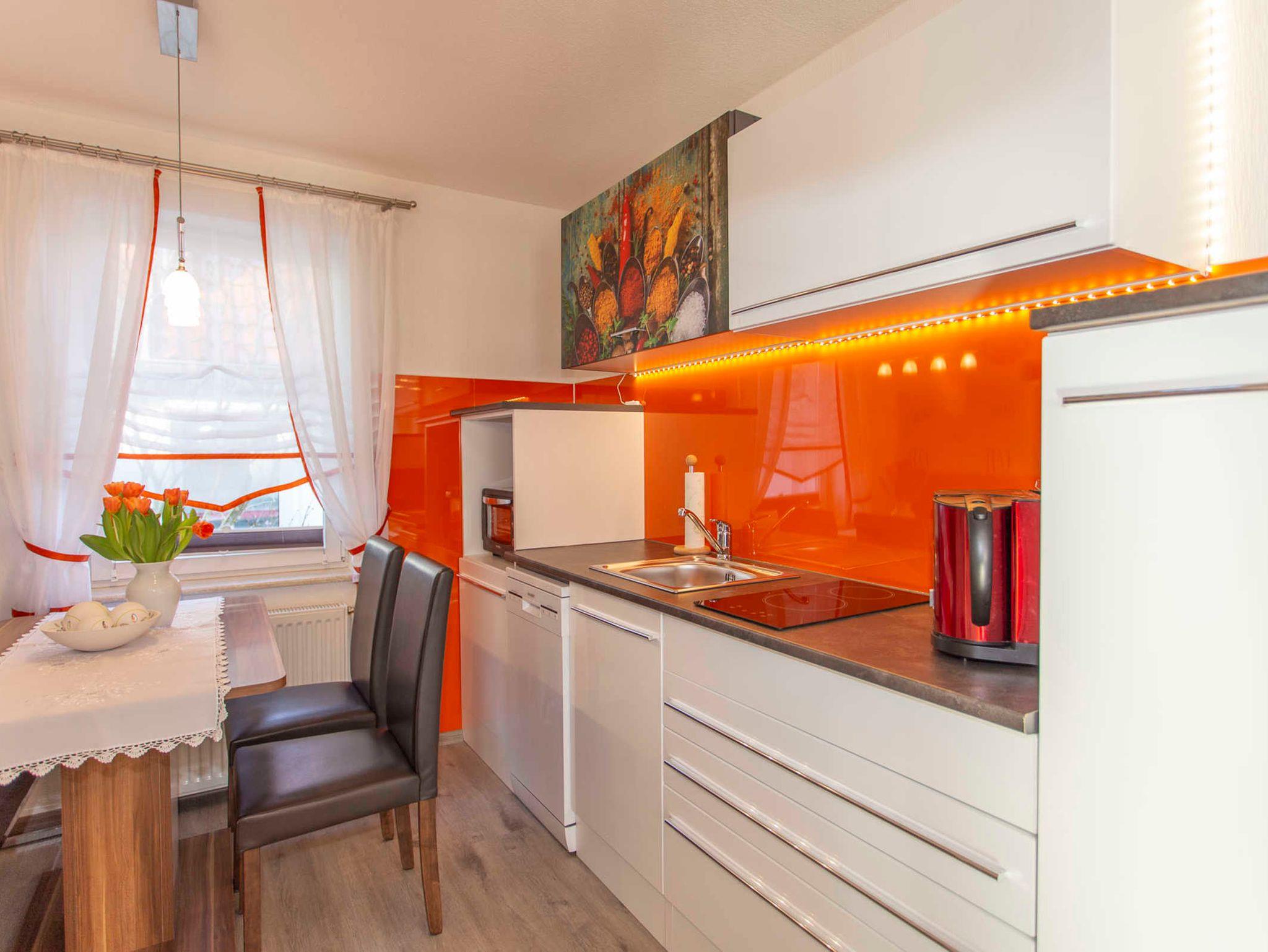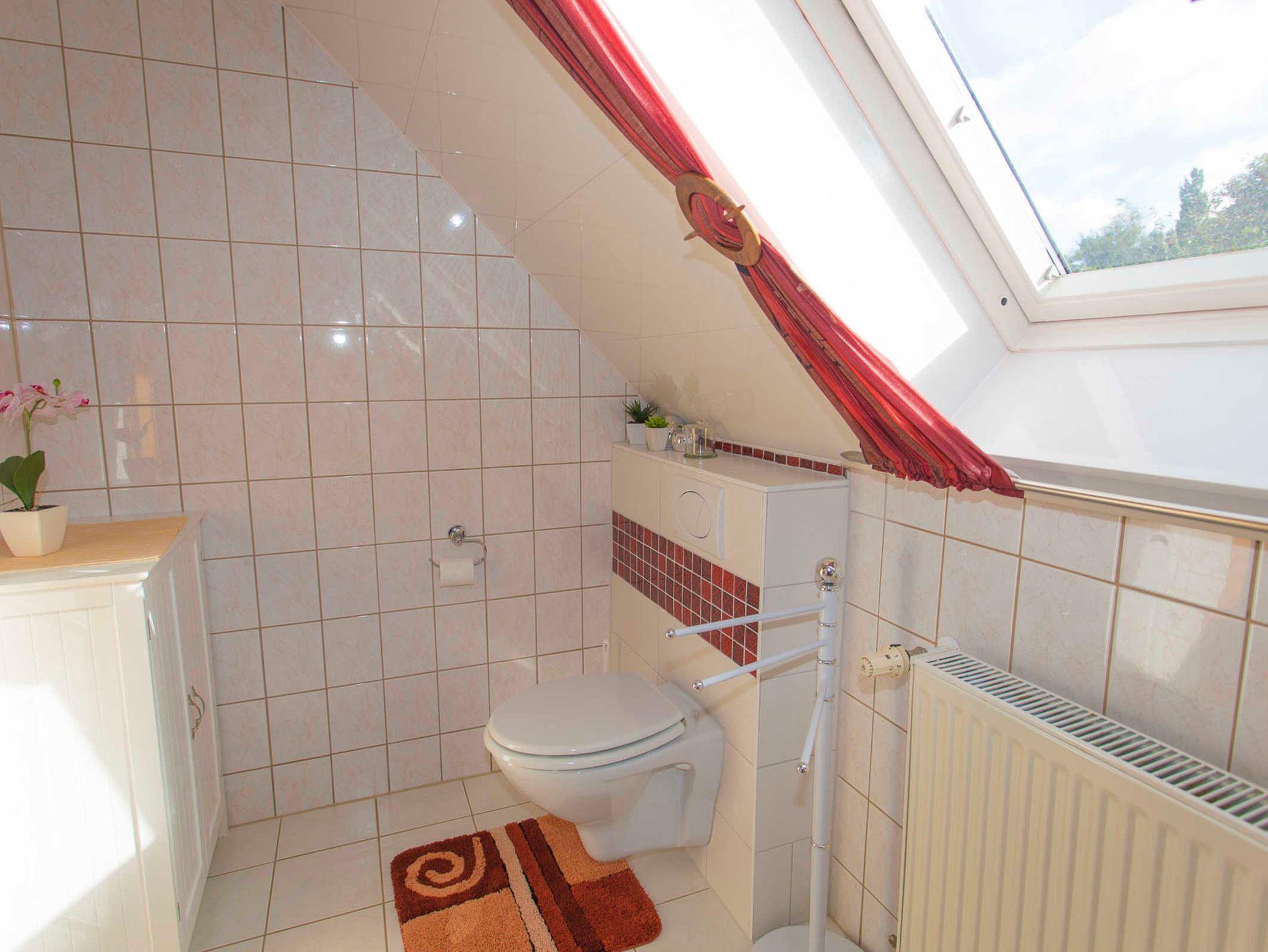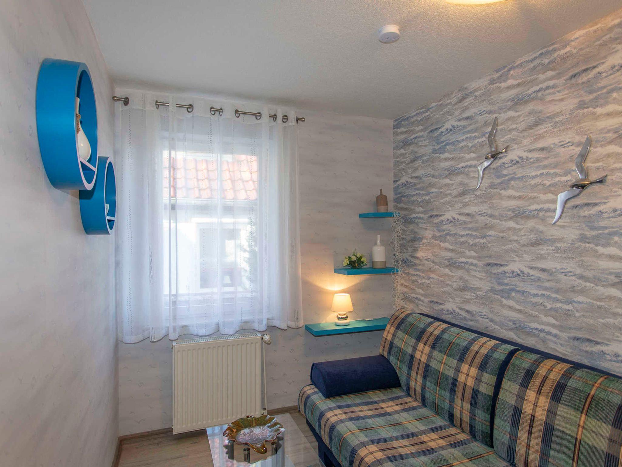 Im Erdgeschoss befindet sich neben dem Eingangsbereich das Wohnzimmer, ein kleineres Schlafzimmer (für 2 Personen), die offene Küche und ein Gäste-WC. Das Obergeschoss, welches über eine Wendeltreppe erreichbar ist, umfasst Bad mit Dusche, ein großes Schlafzimmer (2 Personen plus Aufbettung für 2 Personen) und eine Leseecke. Alle Räume sind hell, freundlich und modern eingerichtet. Die Küche ist ausgestattet mit mit 2-Platten-Ceranfeld und Minibackofen, Kühlschrank, Geschirrspüler, einem Frühstückscenter und allem notwendigen Geschirr.