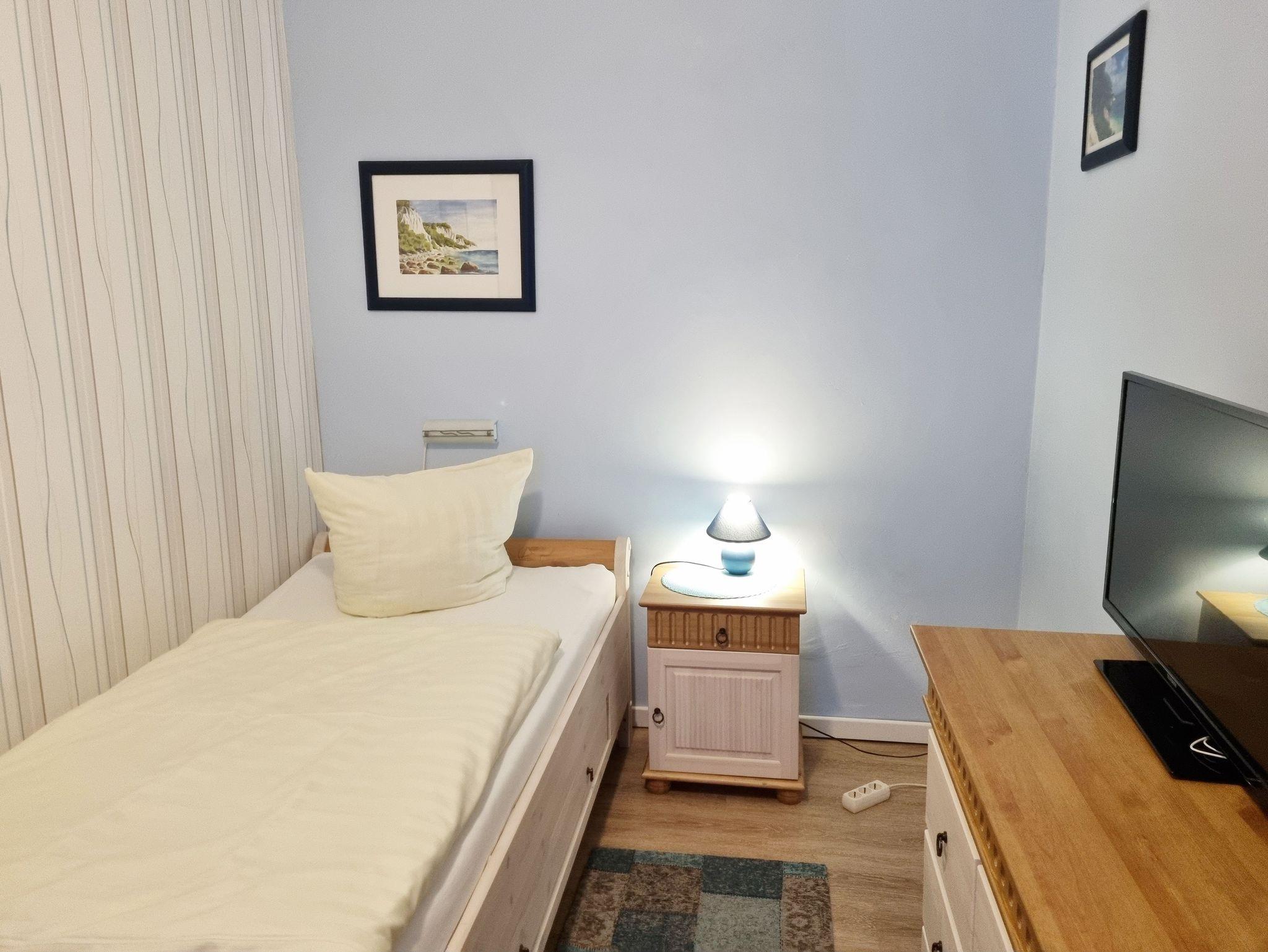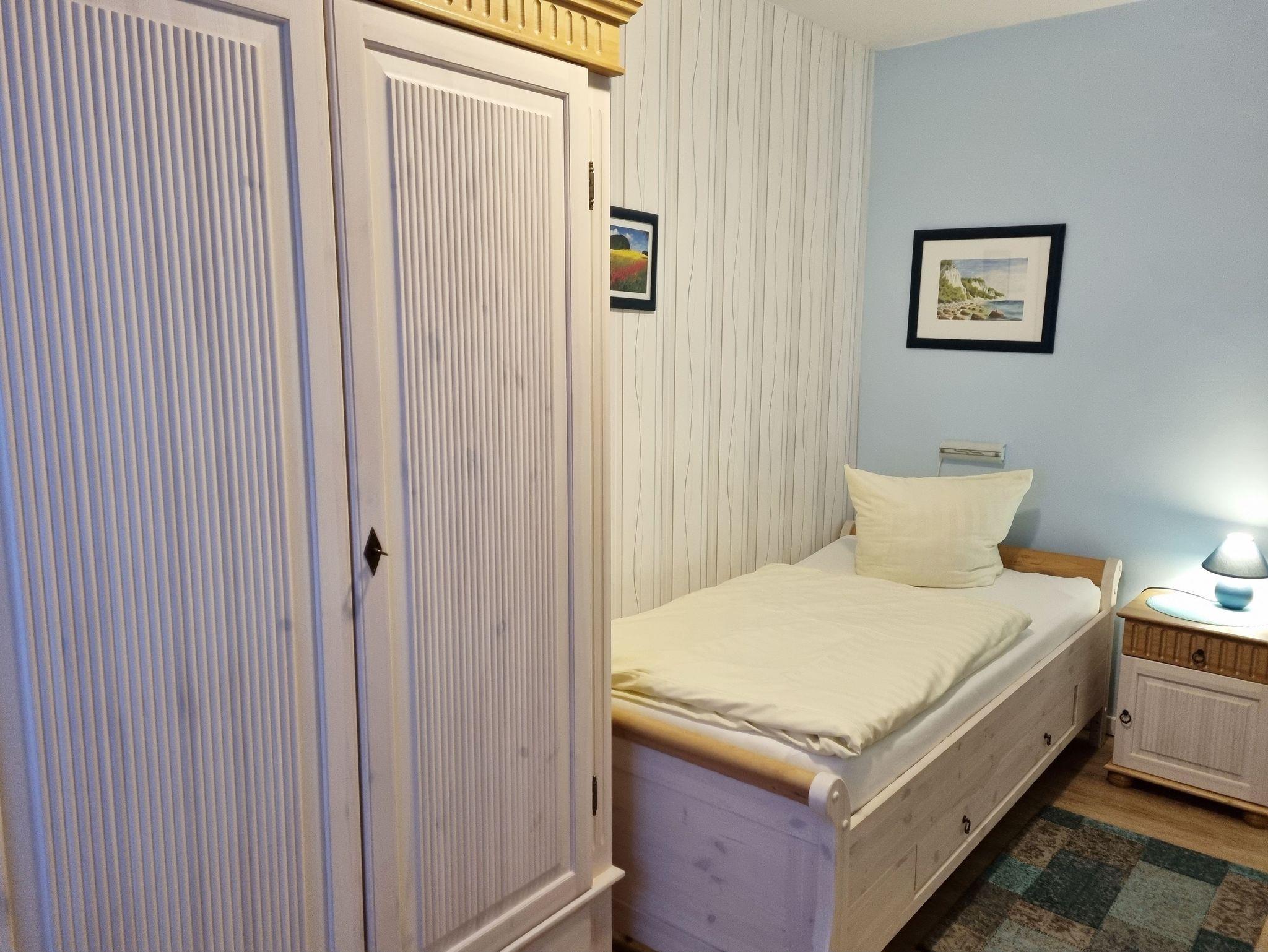 Schlafzimmer 3 - Zugang über Hausflur: Einzelbett, Nachttisch, Kleiderschrank, Kommode mit TV, Stuhl, CD-Musikanlage