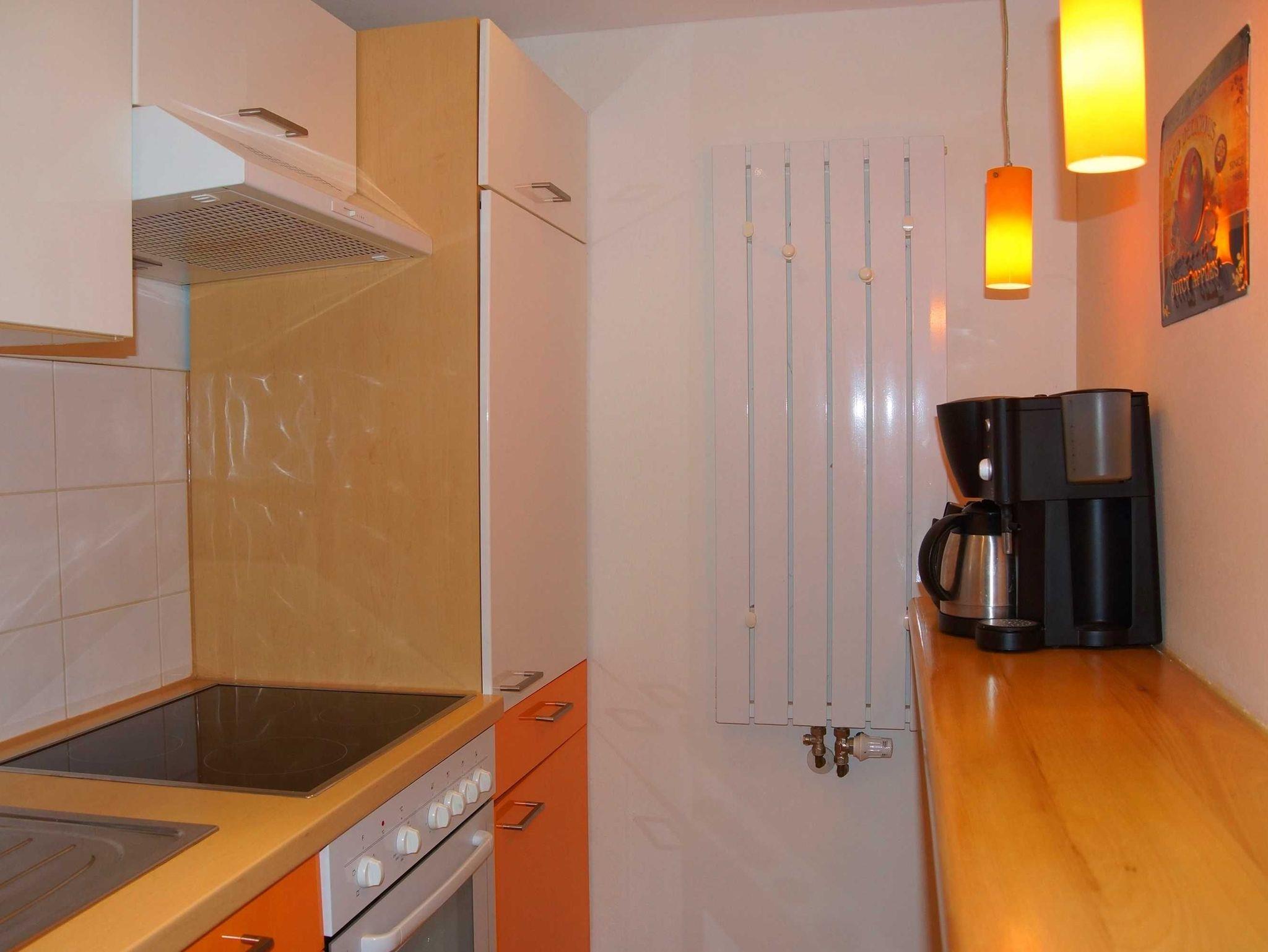 Die Einbauküchenzeile ist mit Backofen, Induktionskochfeld, Kühlschrank, Kaffeemaschine, Wasserkocher, Mikrowelle und Toaster ausgestattet.