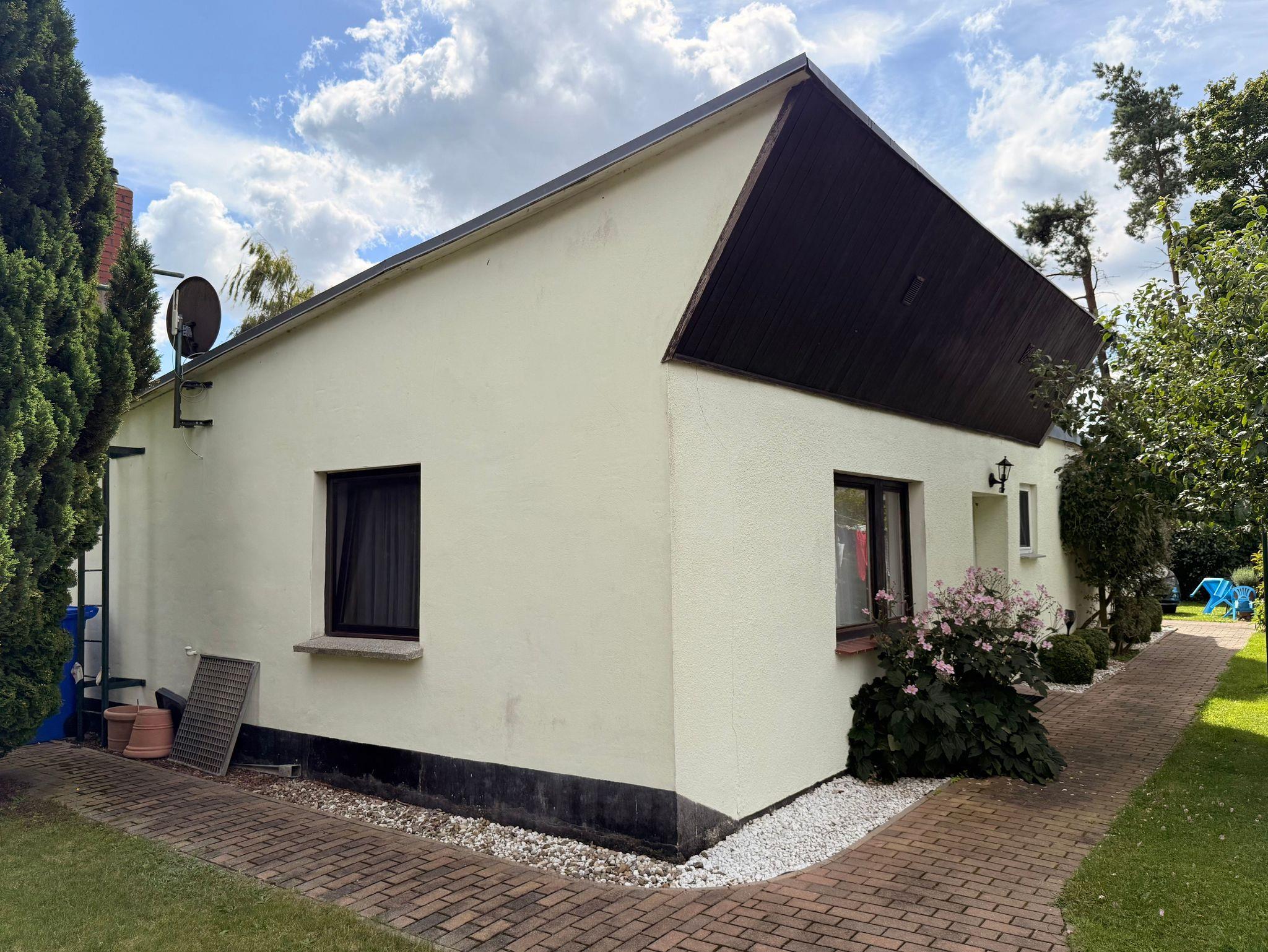 Auf dem Grundstück gibt es eine überdachte Sitzecke sowie eine Parkmöglichkeit unter dem Carport. Einkaufsmöglichkeiten befinden sich ganz in der Nähe.