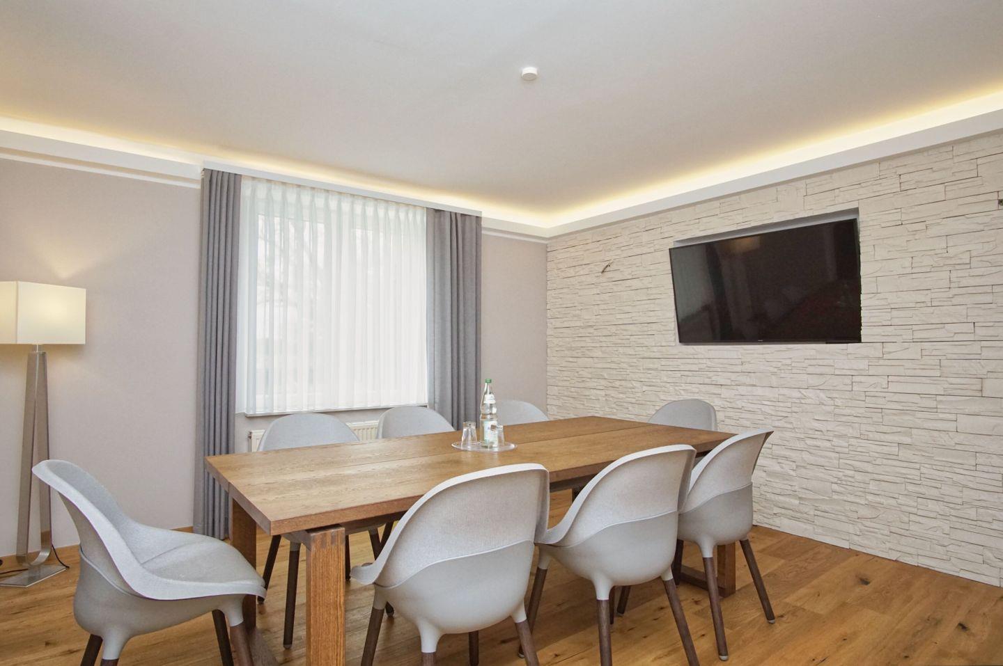 WOHNEN // Wohnraum mit bequemer Couch (Schlaffunktion), Flachbild-TV, separates Esszimmer mit großem Tisch und Flachbild-TV ++