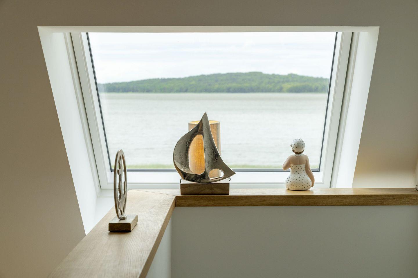 Von der Galerie mit Loggia eröffnet sich ein beeindruckender Blick über die Boddenlandschaft bis hin nach Lietzow – nachts ist sogar das Leuchtfeuer von Kap Arkona zu sehen.