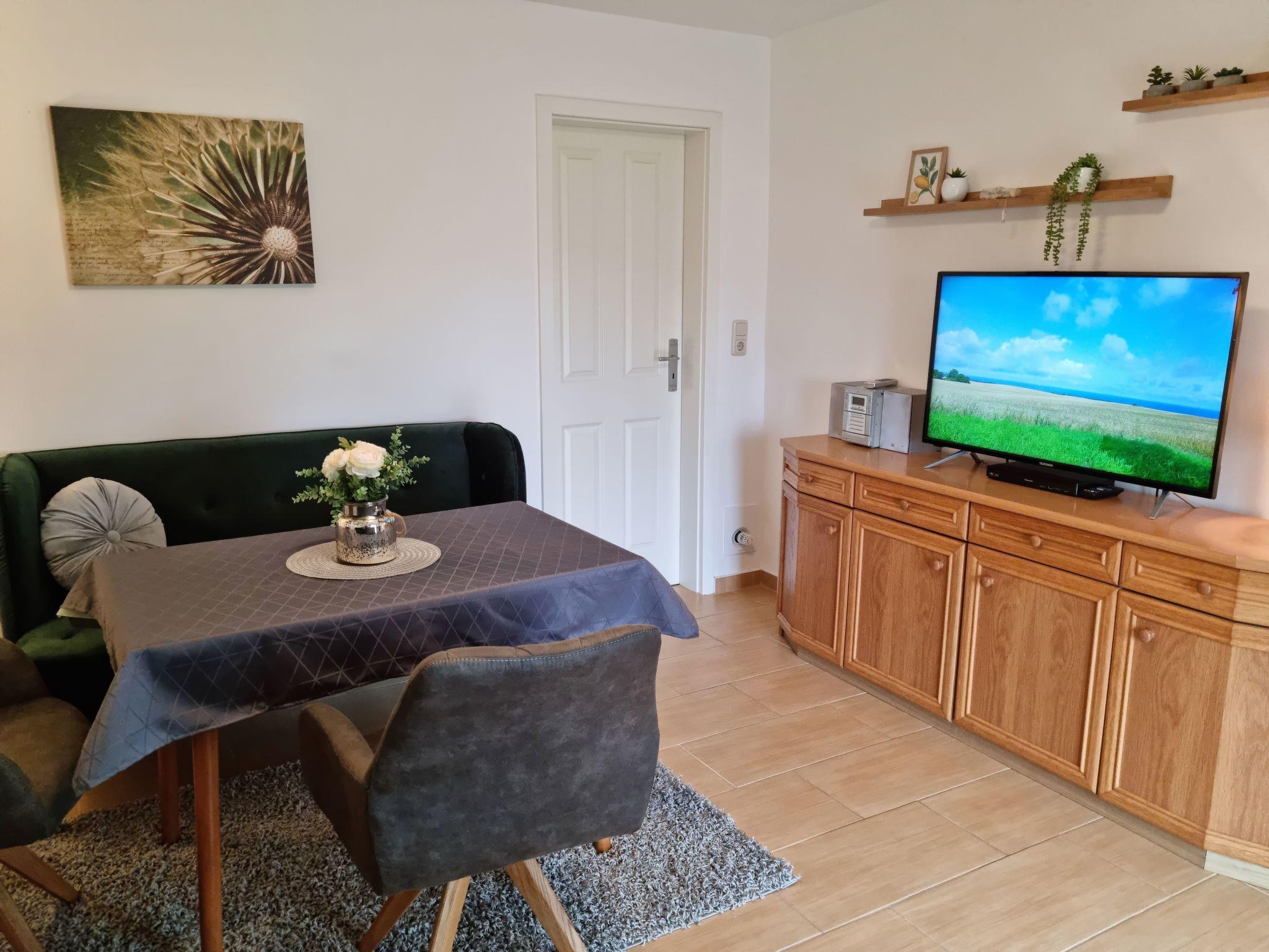 Im Erdgeschoss des ehemaligen Bauernhauses befindet sich die Ferienwohnung Wiesenblick. Sie ist ca. 75 m² groß und für bis zu 5 Gäste geeignet. Drei Schlafzimmer, zwei Duschbäder, eine voll eingerichtete Einbauküchenzeile sowie ein Wohn-/Esszimmer und eine Terrasse bieten unseren Gästen eine Unterkunft zum Wohlfühlen. Vom Wohn-/Esszimmer können Sie direkt auf Ihre Terrasse mit Gartenmöbeln und die Wiese mit Lagerfeuerplatz sowie eines der Duschbäder gelangen. Bücher, Spiele sowie TV, Stereoanlage und DVD-Player mit einer Auswahl von DVDs und CDs lassen auch keine Langeweile aufkommen, falls Sie sich mal nicht draußen aufhalten können. Im modernen Landhausstil ist das erste Doppelbett-Schlafzimmer mit weißen Möbeln eingerichtet. Von hier aus haben Sie auch direkten Zugang zur Terrasse und Ihrem separaten Duschbad. Zusätzlich kann ein Kinderbett aufgestellt werden. Ebenfalls mit Doppelbett ist das zweite Schlafzimmer ausgestattet. Im dritten Schlafraum, der über den Hausflur zu erreichen ist, erwartet Sie ein Einzelbett. Alle Schlafzimmer sind mit TV ausgestattet.