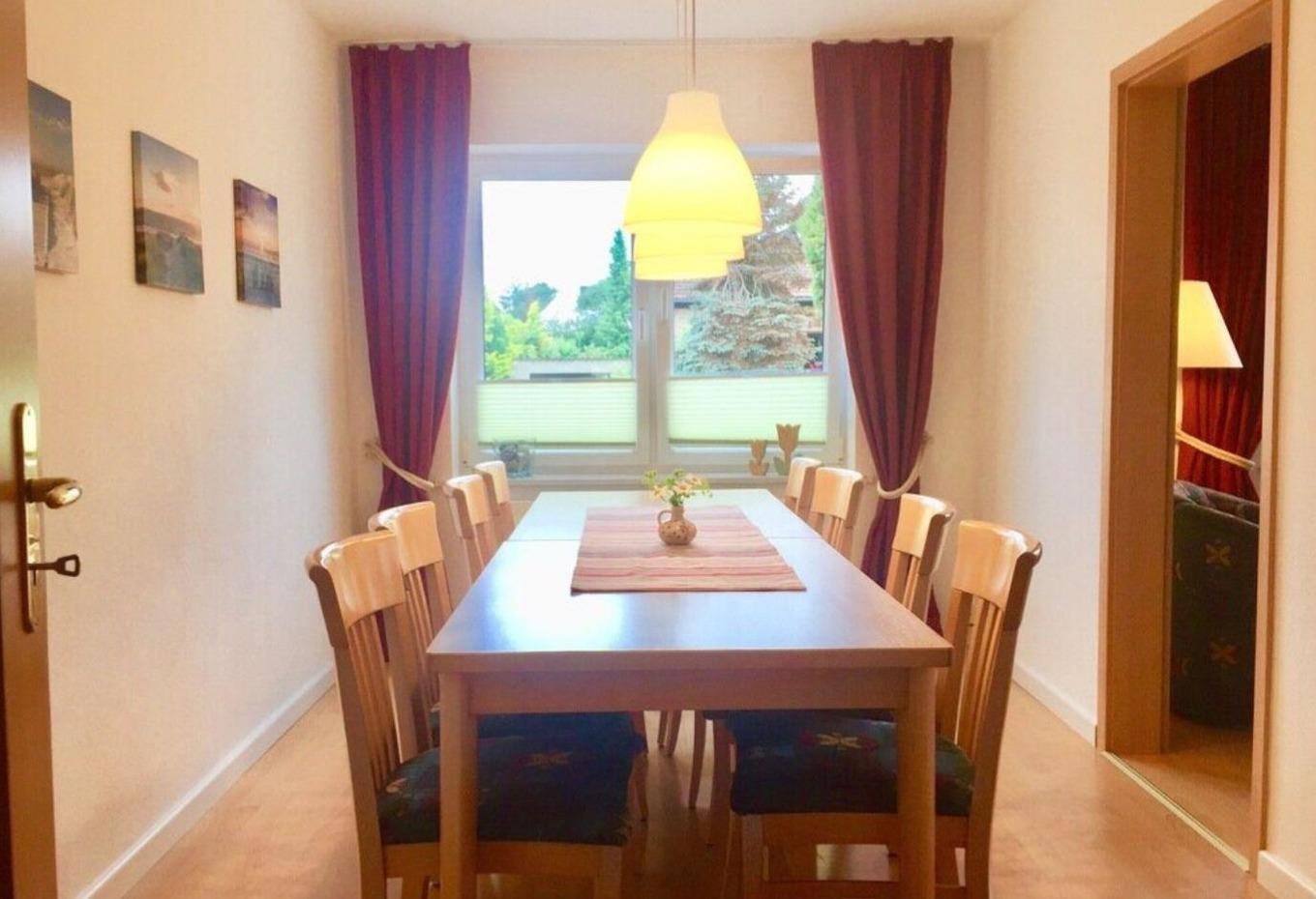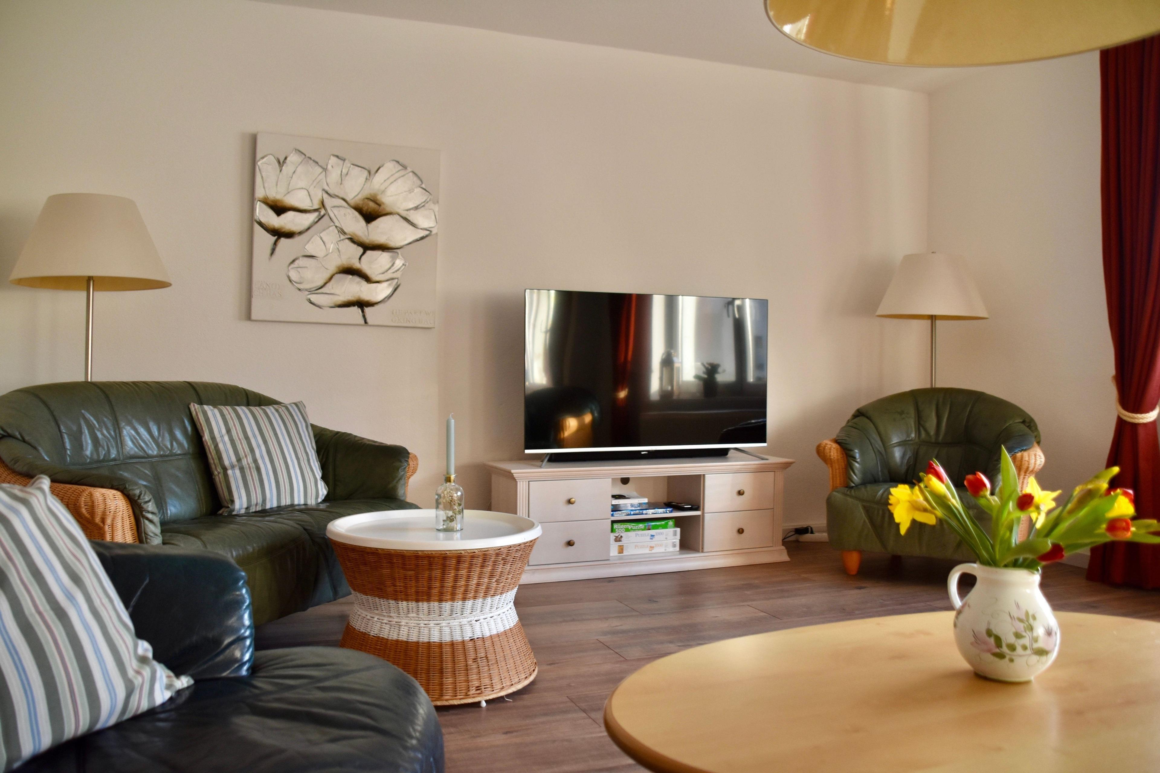 Der angrenzende helle und lichtdurchflutete Ess- und Wohnbereich mit den großen Fenstern bietet viel Geräumigkeit, bequeme Sitzmöbel und einen 55 Zoll Smart - TV. In diesem Geschoss befindet sich auch ein Gäste-WC. Auf Wunsch können die Esstische beider Esszimmer zu einer langen Tafel (bis zu 16 Personen) in Fiete 2 zusammengestellt werden. So können auch größere Familienfeiern und Zusammenkünfte problemlos stattfinden.